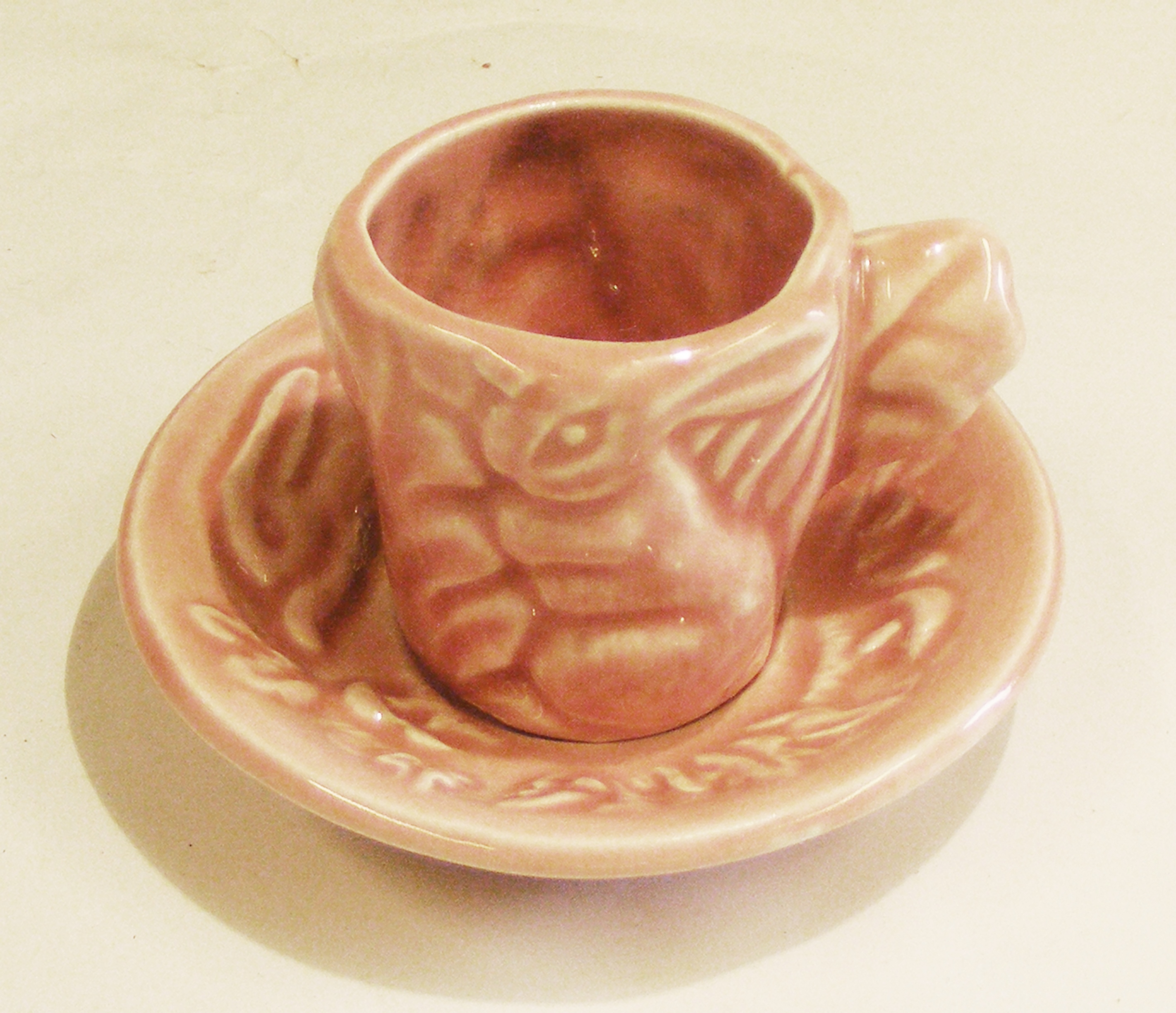 Toy teacup & saucer; moulded white ceramic with pink glaze; rabbit design; no maker's marks; part of a themed set.