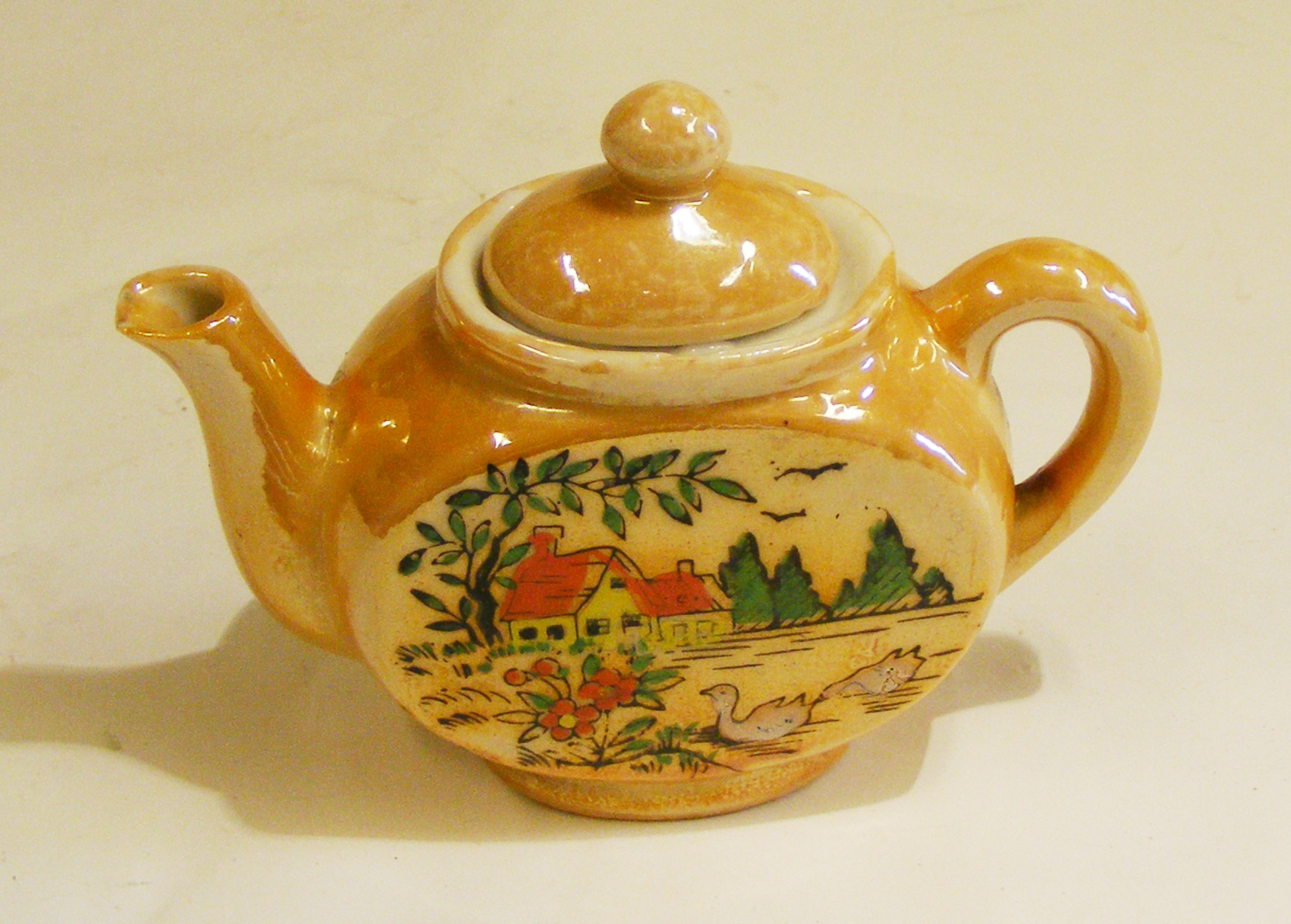 - DescriptionToy teapot; moulded white ceramic with orange-brown slip & lustrous clear glaze; hand-coloured image on one side of a rural building with flowers & birds in the foreground.