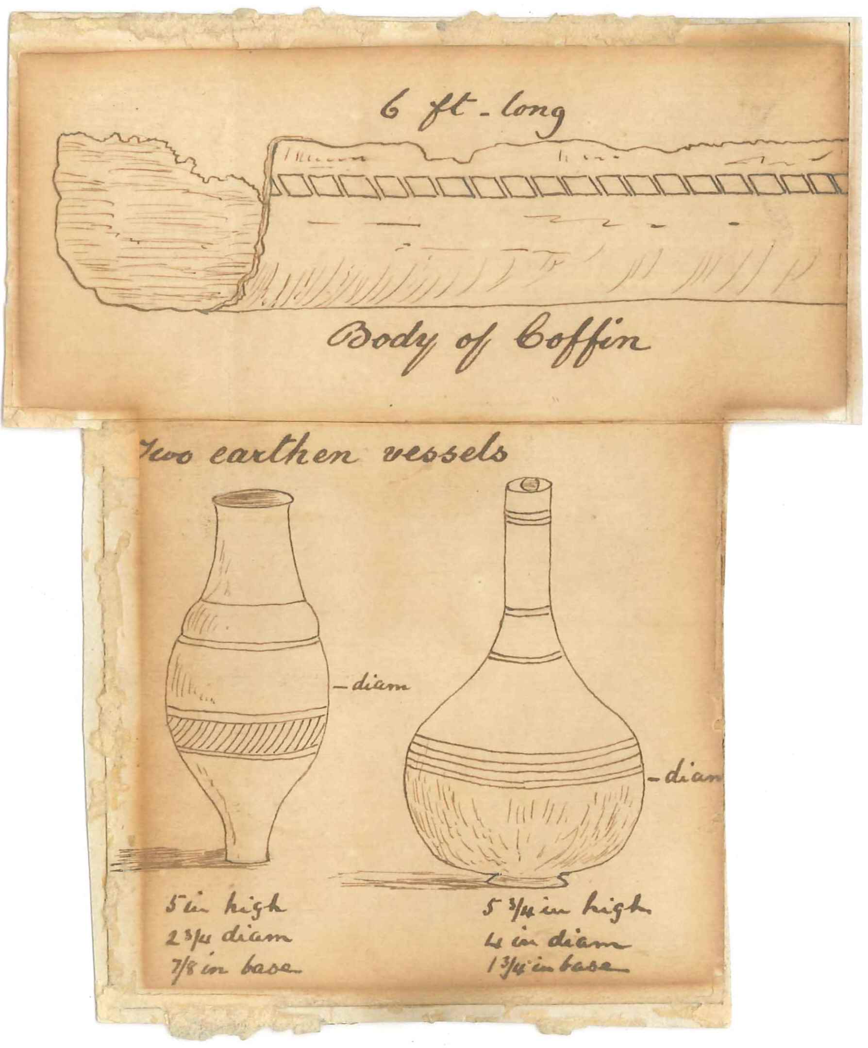 Ink sketch of a Romano-British lead coffin & two ceramic vessels (a beaker & flagon) from the Maidstone Road, Chatham; as reported in Arch Cant XII (1878); for another sketch see A11430/6; for fragments of the lead coffin see A2541/1-2; on the 16th May 1878 a lead coffin was dug up in the SW corner of the New Cemetery, Chatham, near the Maidstone Road; the coffin was 6' long & decorated with 'billet' moulding worked at the head into a triangular pattern with a scallop design; the coffin had been within an iron-bound wooden case; it contained the skeleton of an adult male with a glass vessel; outside were two other glass vessels & two ceramic pots.Previously mounted for display.