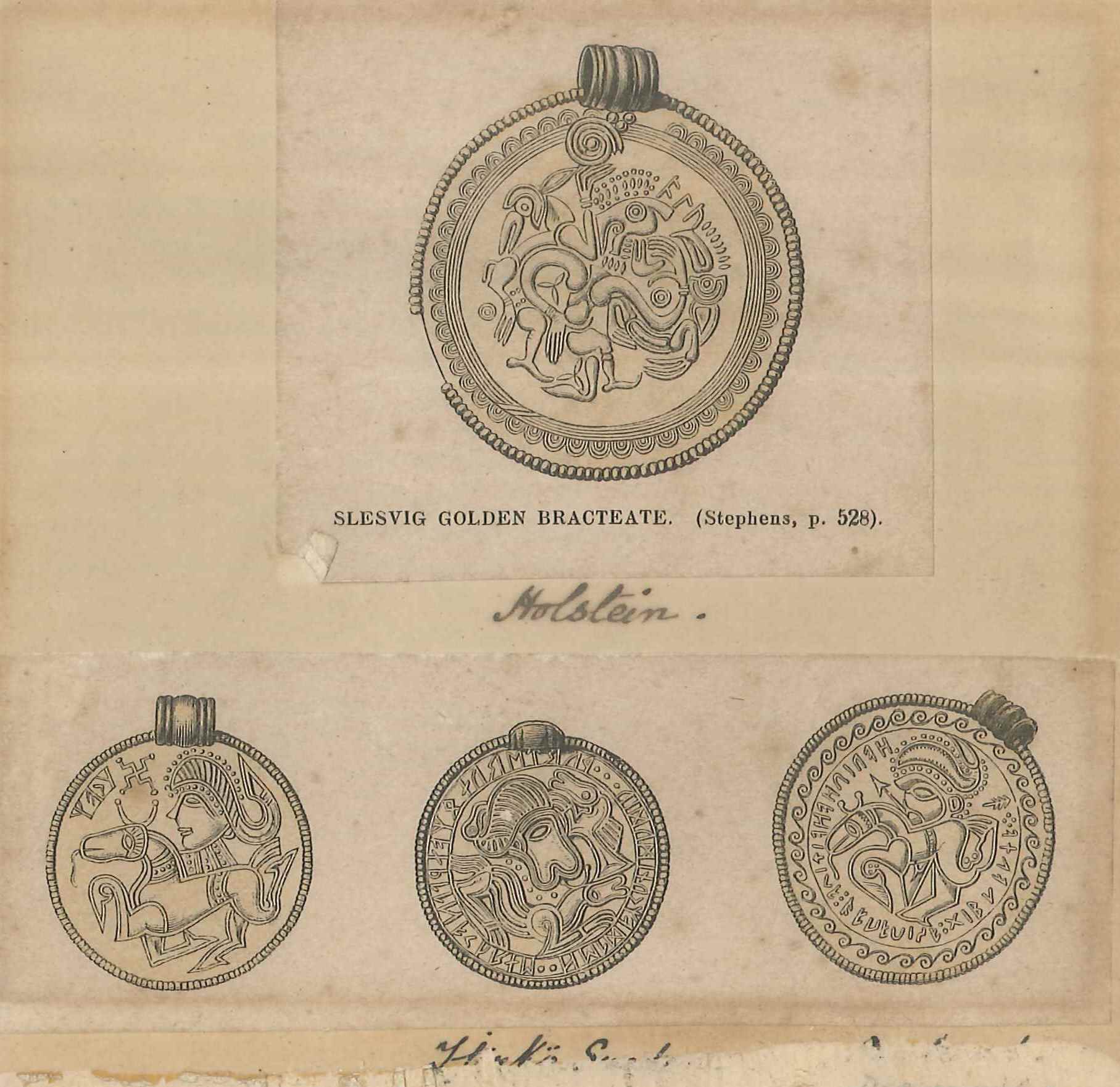Print from a publication of a gold pendant, probably 5/6th century; this shows an elaborate circular gold pendant from Holstein, as well as three others, also presumably from the Continent. This print has been mounted on card & previously framed; it is part of a group that were displayed at Eastgate House Museum by George Payne, some time between 1903-1920. Some light foxing & discolouration.