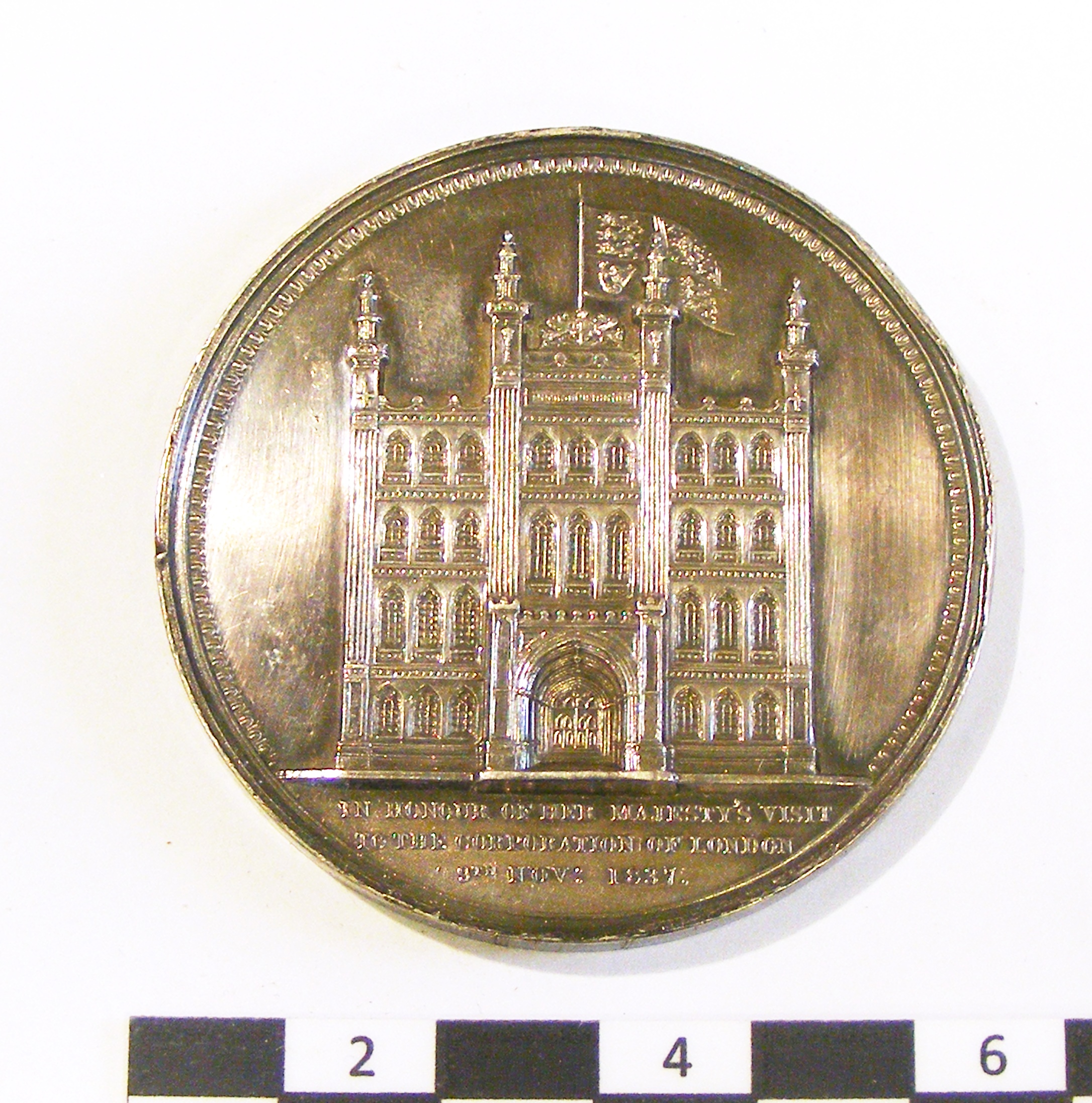 - DescriptionCommemorative medallion; visit of Queen Victoria to the City of London, 1837; pewter? (lead alloy); design by W Wyon.