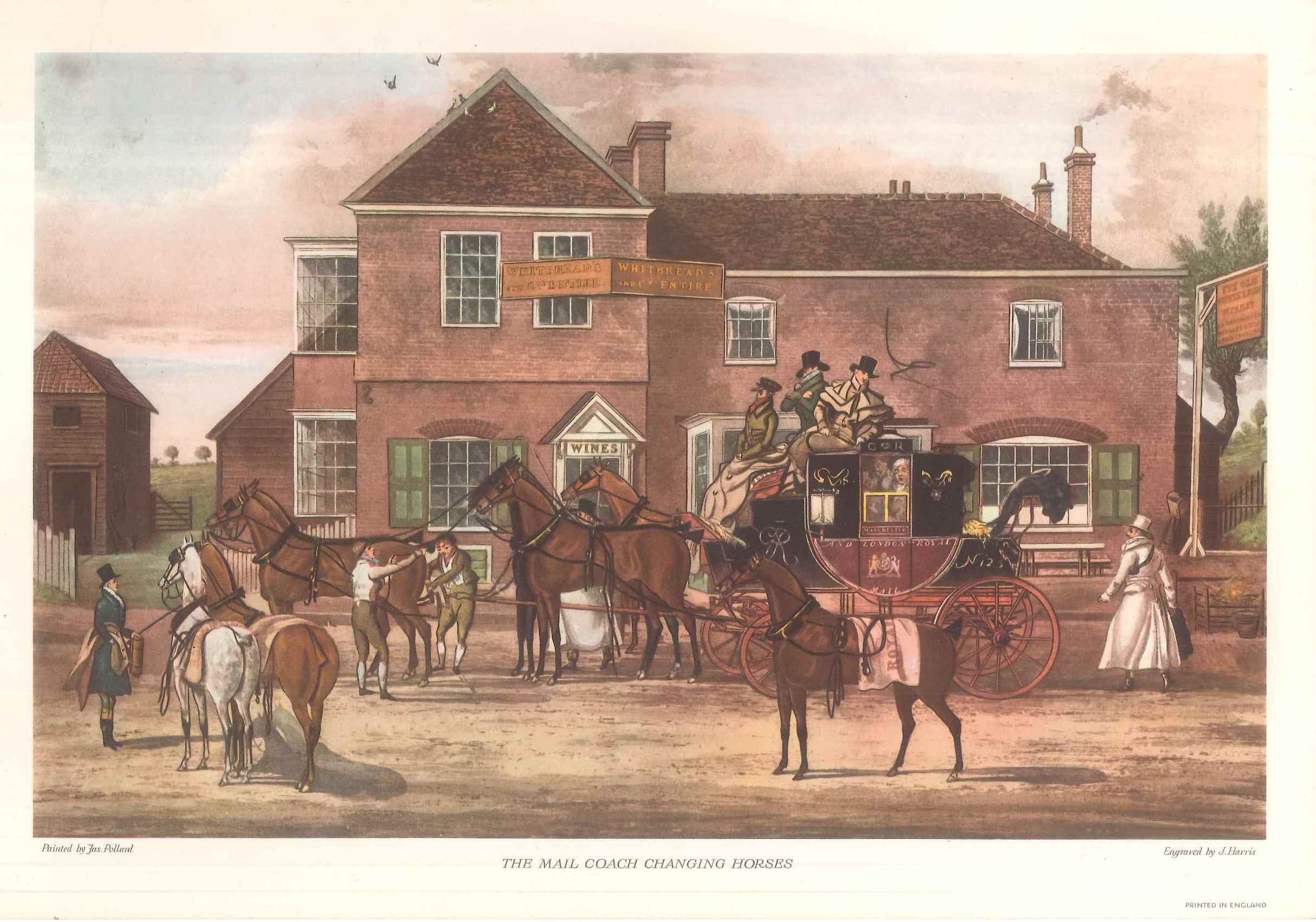 - DescriptionPrint of a Royal Mail road coach; probably a mid 20th century copy of a print based on a painting by James Pollard (circa 1830); depicts the Manchester to London Royal Mail Coach changing horses at the Old White Lion Inn (location unspecified).