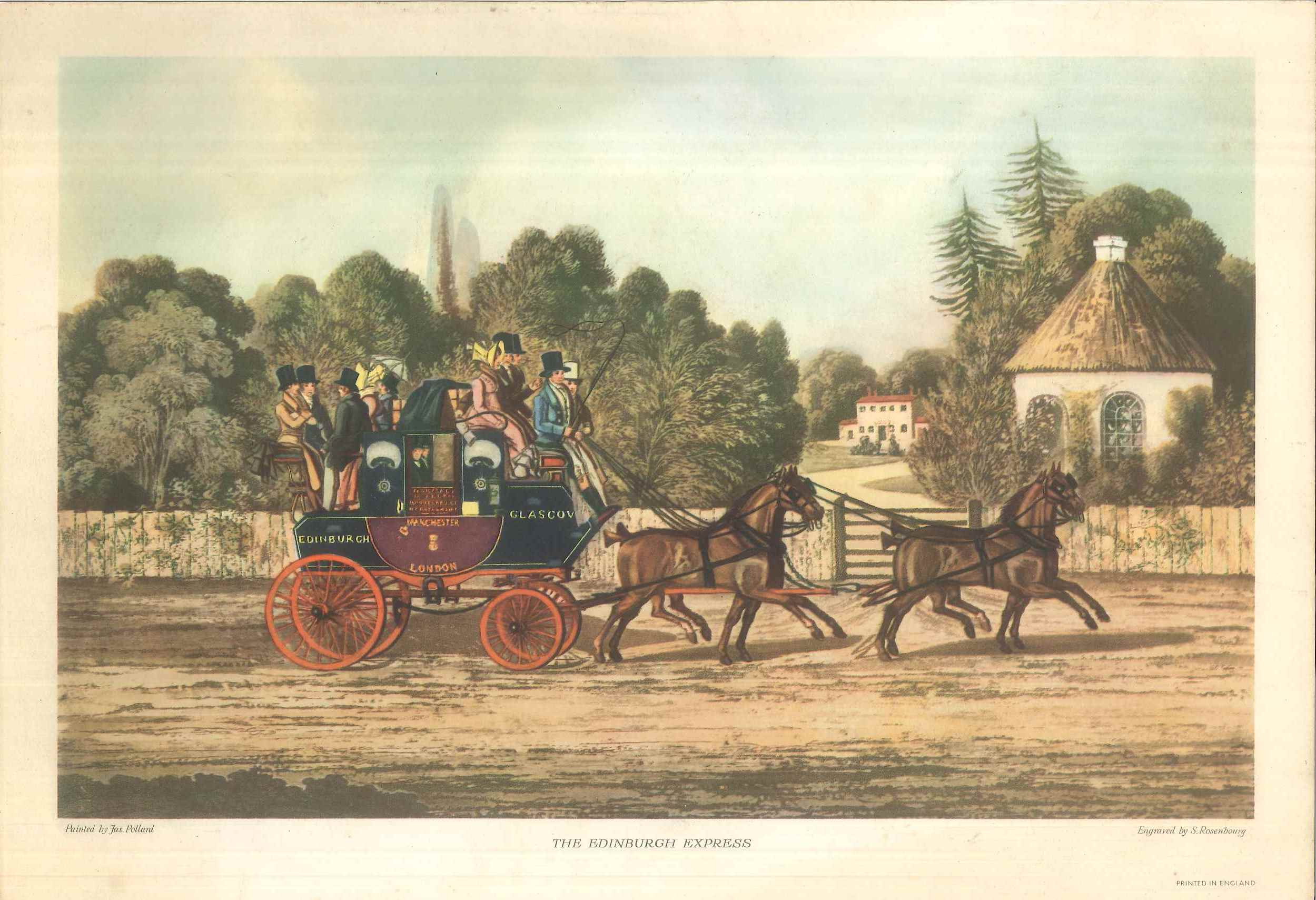 - DescriptionPrint of a road coach; probably a mid 20th century copy of a print based on a painting by James Pollard (circa 1830); depicts a road coach with livery stating destinations including Manchester, London, Edinburgh & Glasgow travelling along a road (location unspecified).