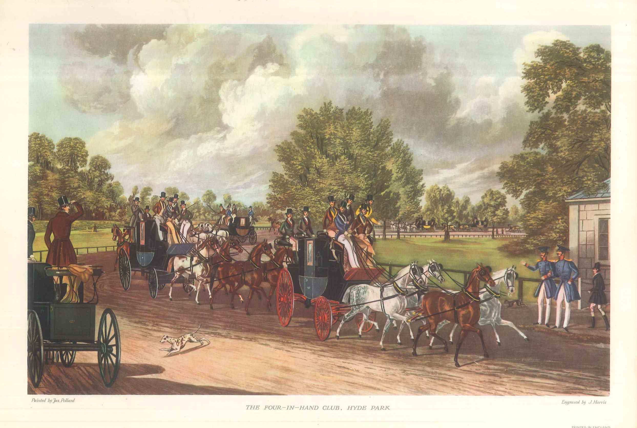 - DescriptionPrint of road coaches; probably a mid 20th century copy of a print based on a painting by James Pollard (circa 1838); depicts a group of four-horse road coaches being driven competitively (or for display) in Hyde Park, London; this is apparently the 'Four-in-hand Club'; spectators on the left and guards in uniform on the right.