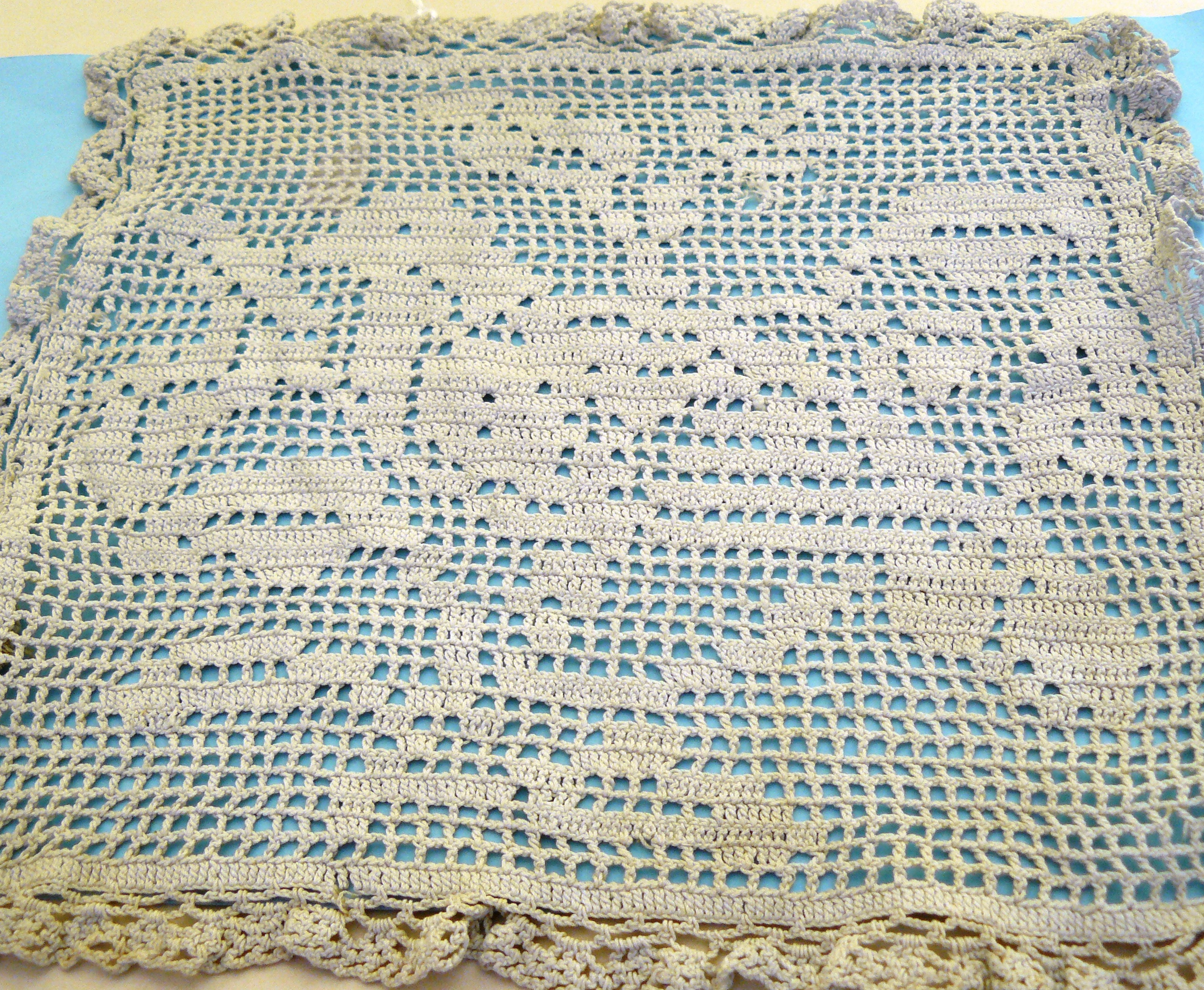 Table mat; square white/cream coloured cotton crochet with a design of a bird; frilled crochet edging; good condition.
