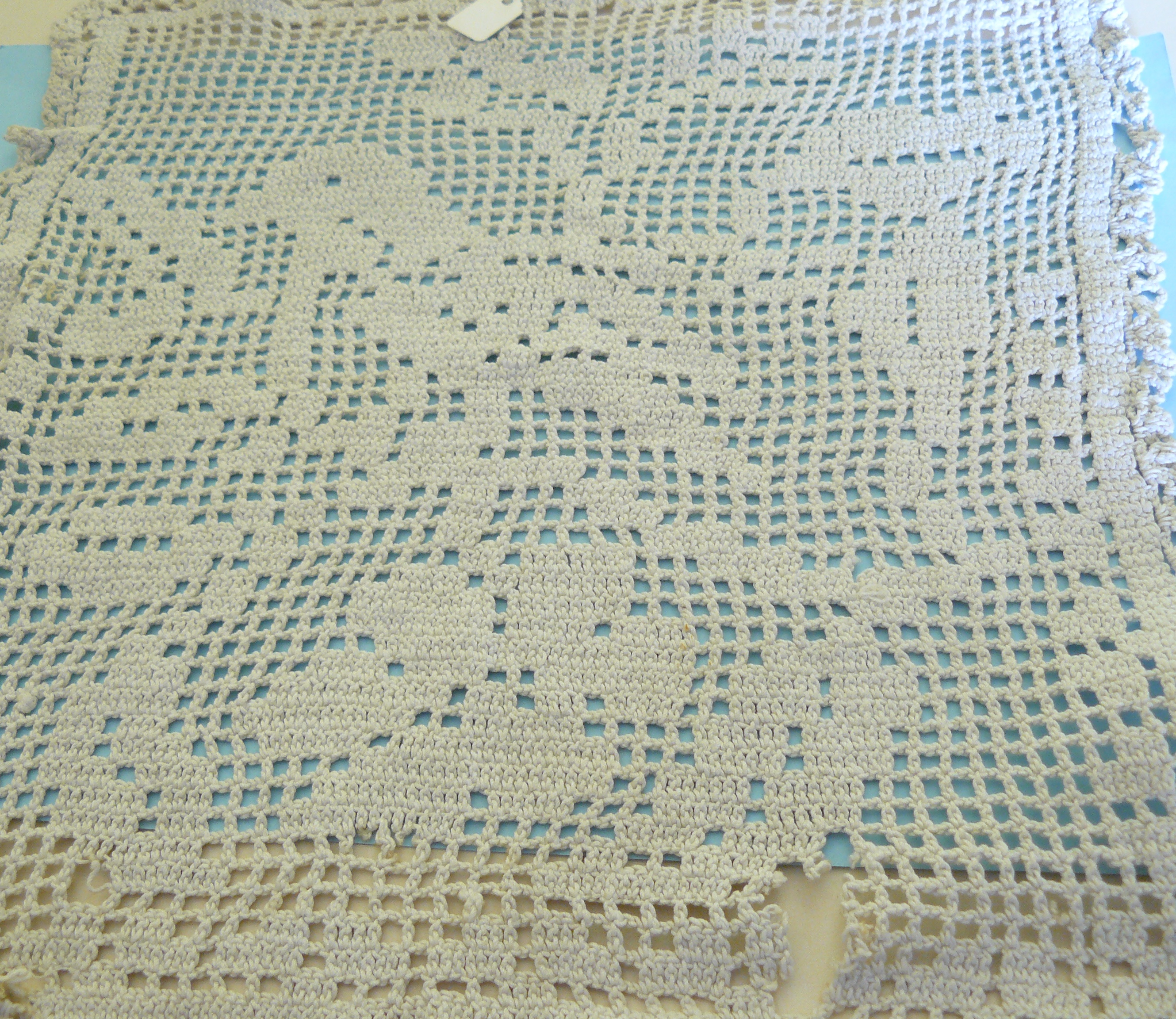 Table mat; large, square, white/cream coloured cotton crochet mat with a central design of a bird and a frilled crochet border. Good condition.