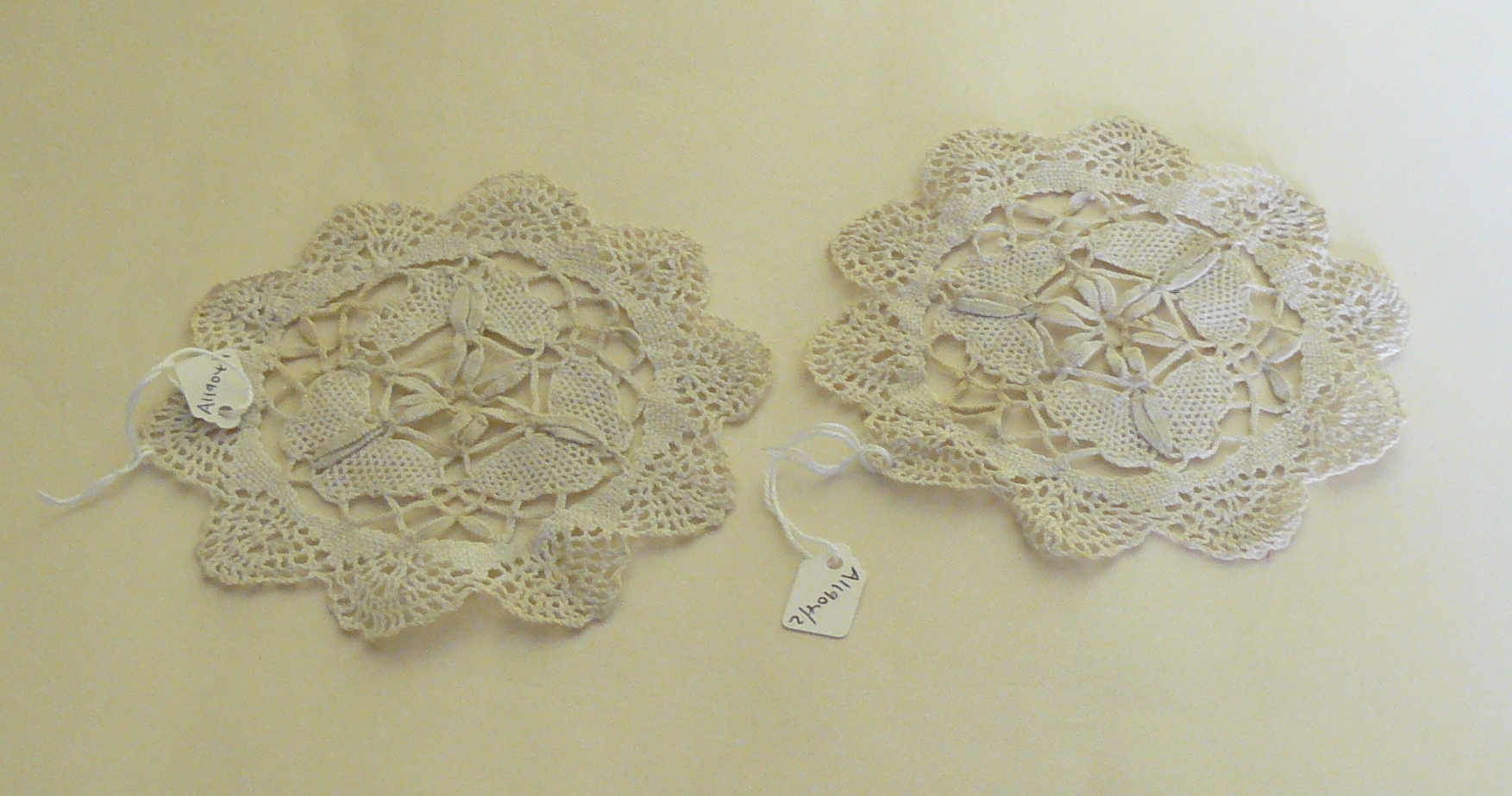 Table mat; small, round, white/ecru cotton crochet mat, one of a pair, both in good condition.