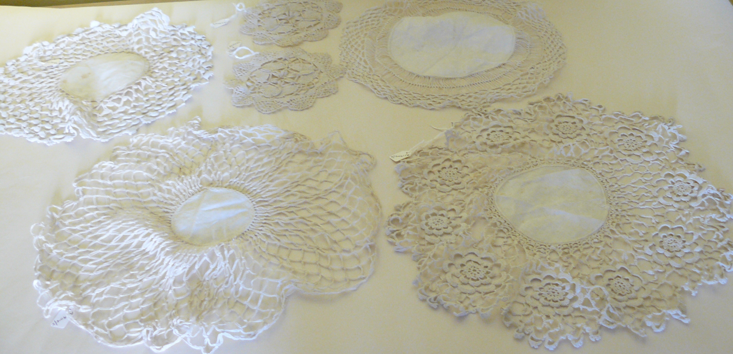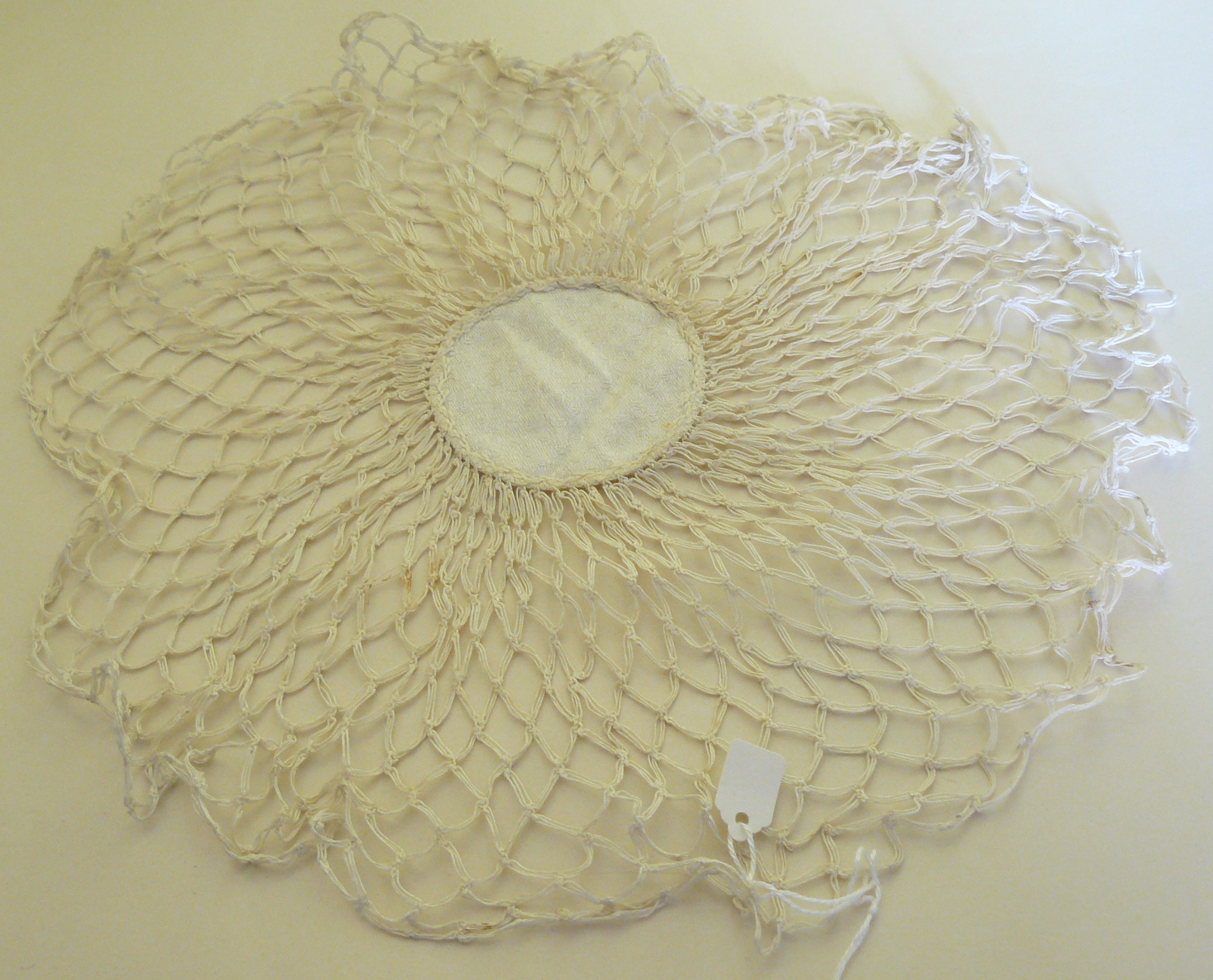 Table mat; round, white/cream coloured mat with small fabric centrepiece and wide cotton crochet surround in a simple, delicate design; good condition.