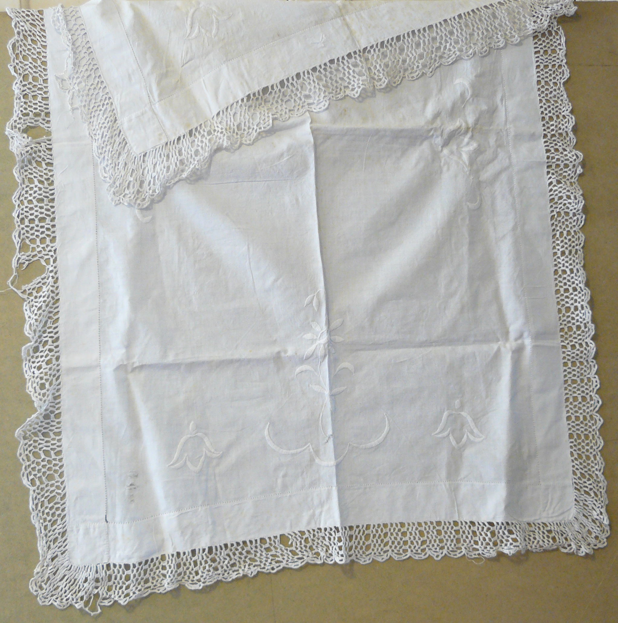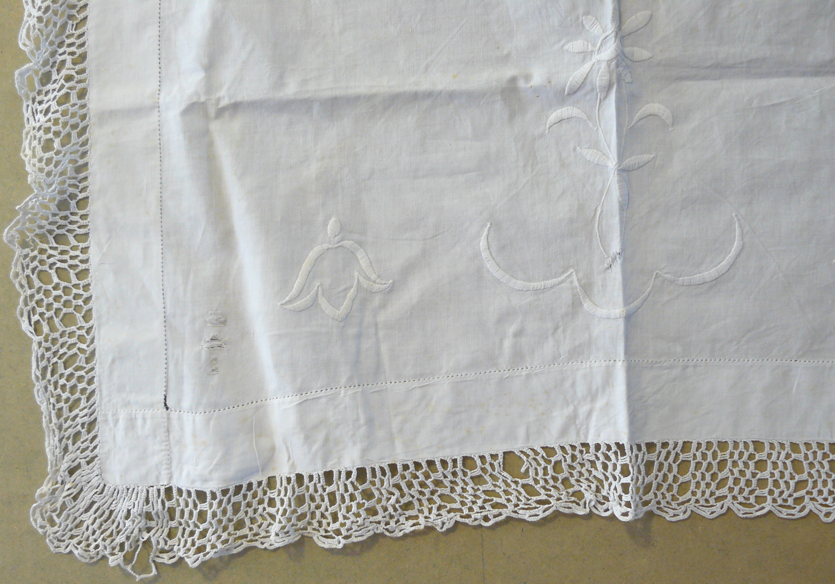 Tablecloth; white linen with white embroidered motifs and a crisp, white crochet border. Considerable staining and rust marks.
