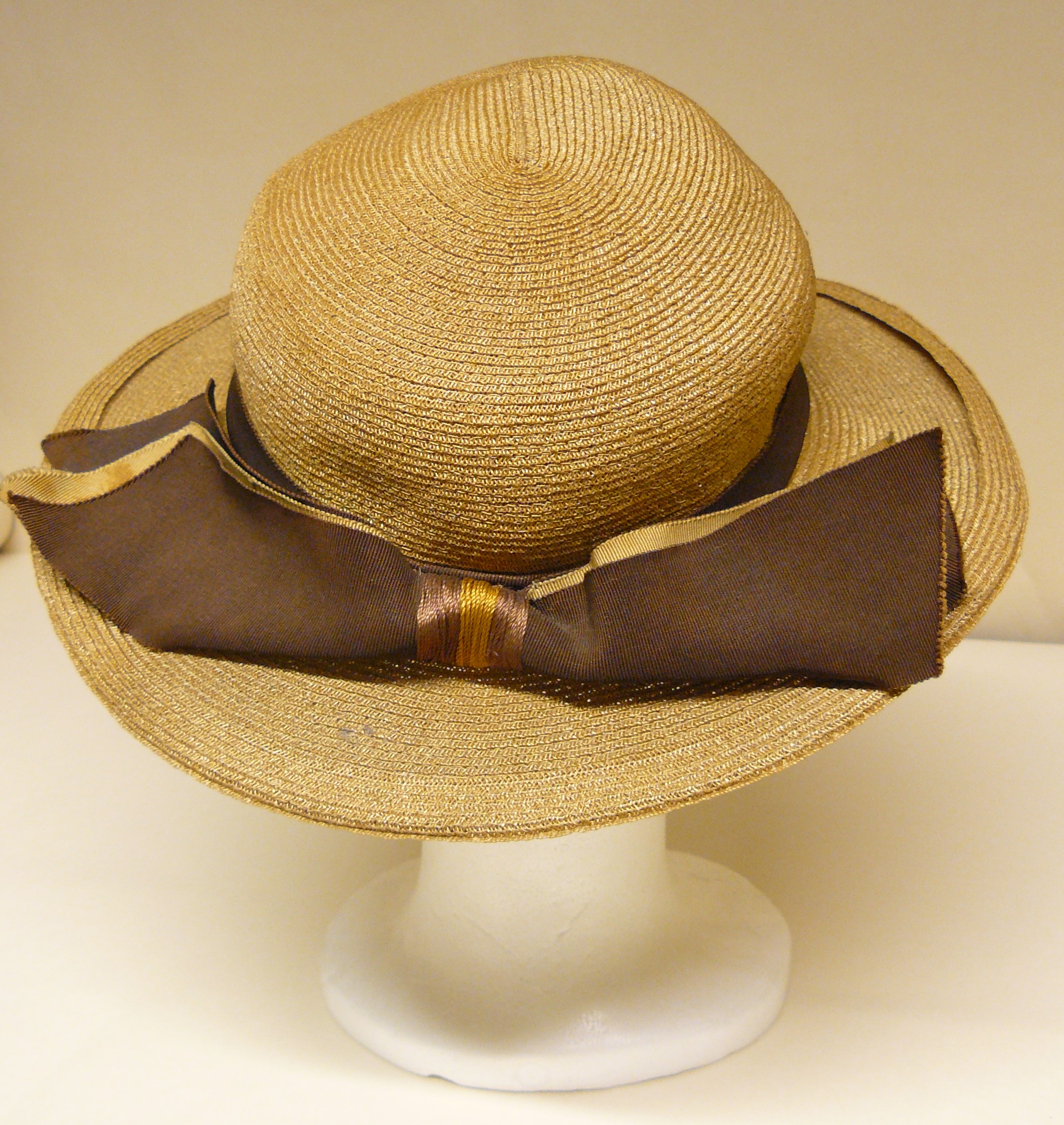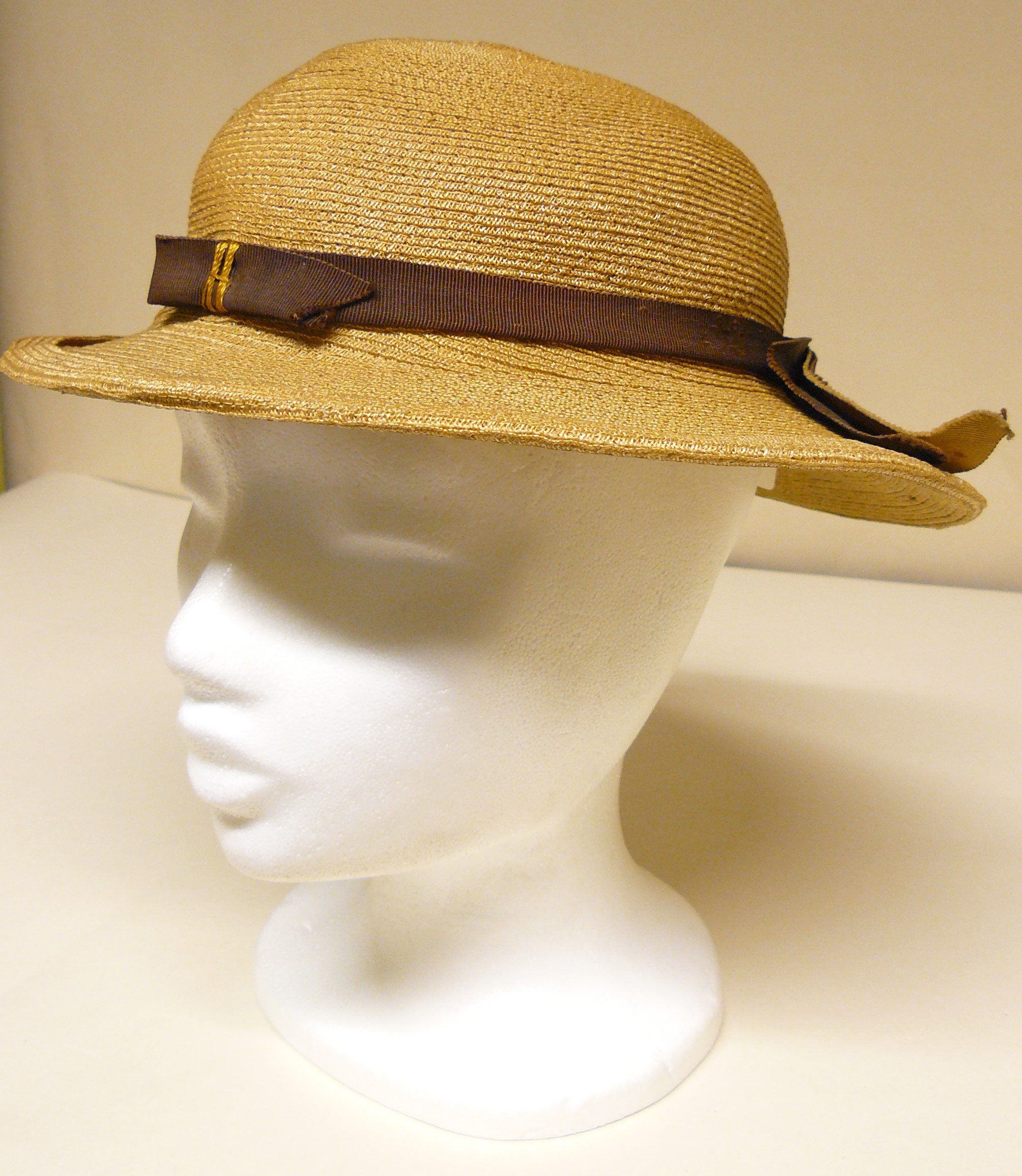- DescriptionStraw hat; natural coloured woven straw hat; dark brown grosgrain ribbon band, with beige and brown grosgrain ribbon trim; lined, with a brown elastic chin strap. Brim is wide at sides and narrow at the front, turned upwards and over at the edges. Perhaps 1930s?