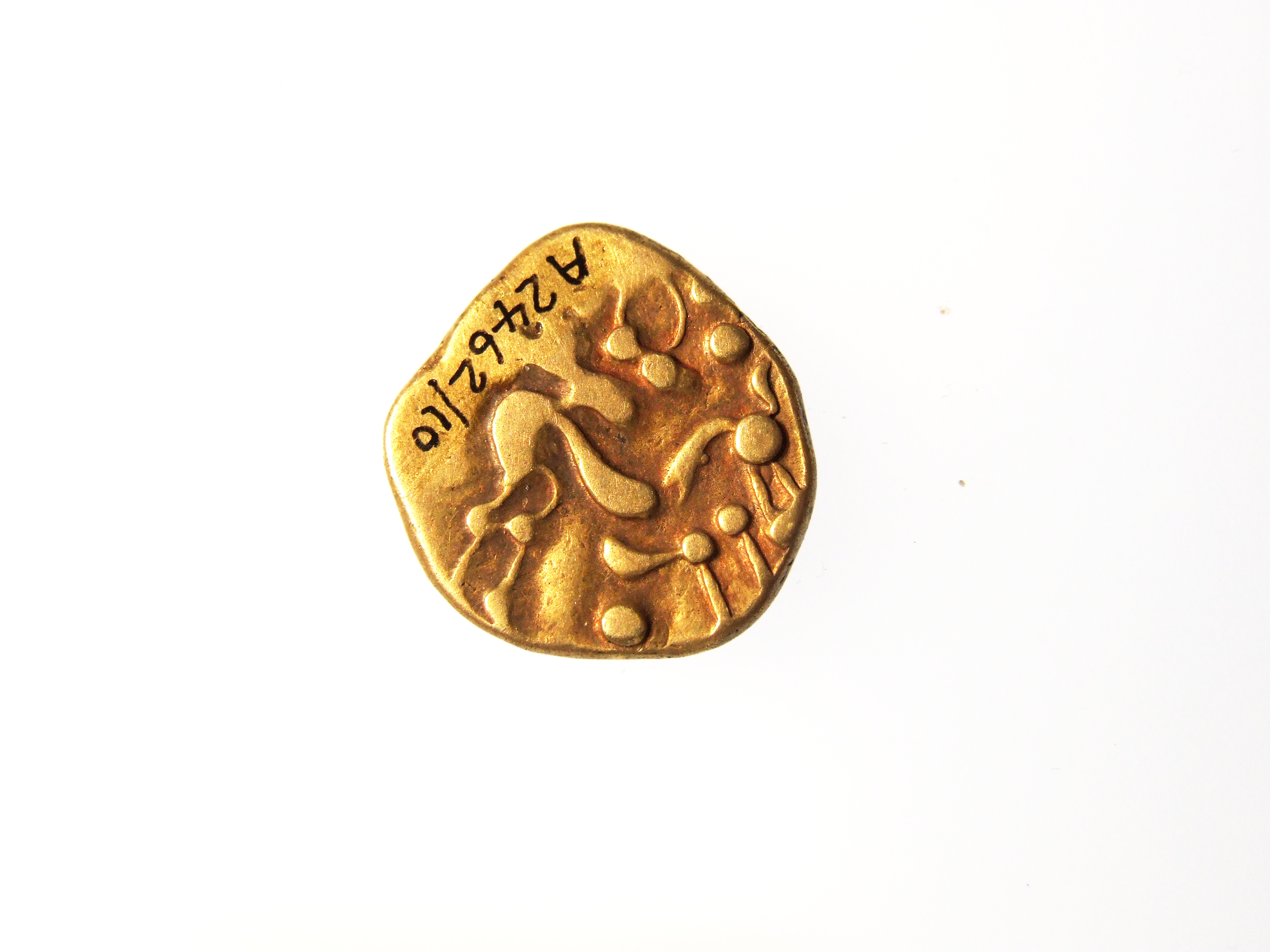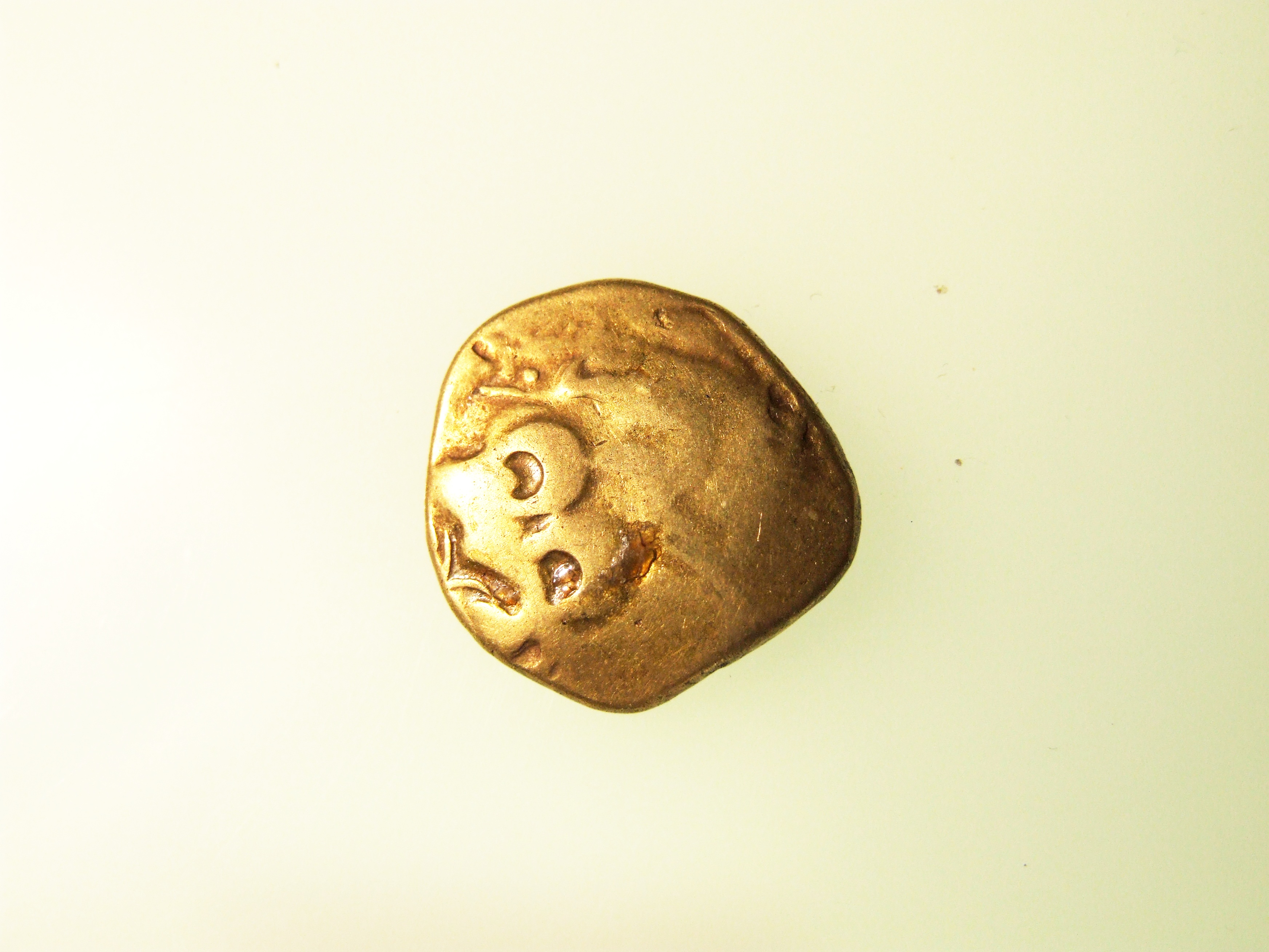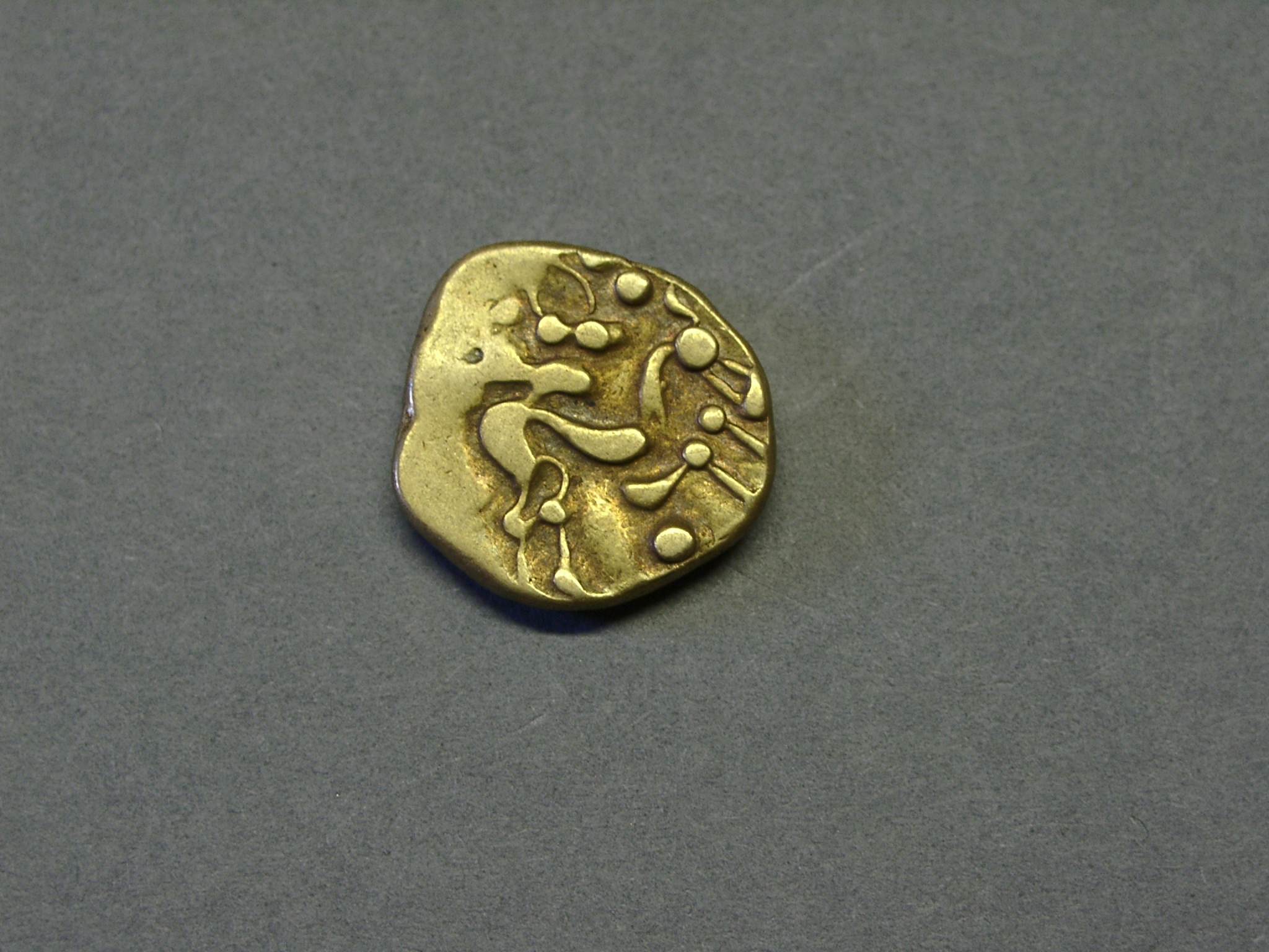 - DescriptionCoin; gold stater; Obv: remnant of Apollo? head; Rev: Celticized horse; probably originated in Gaul (France); shows some heavy surface wear. Part of the Higham hoard of 11 gold staters found packed into a hollow fossil sponge, plugged with clay. Recovered by Mr J Hill during excavations in 26/12/1912. Reported by G C Brooke in the in Numismatic Chronicle 1923, p.156.