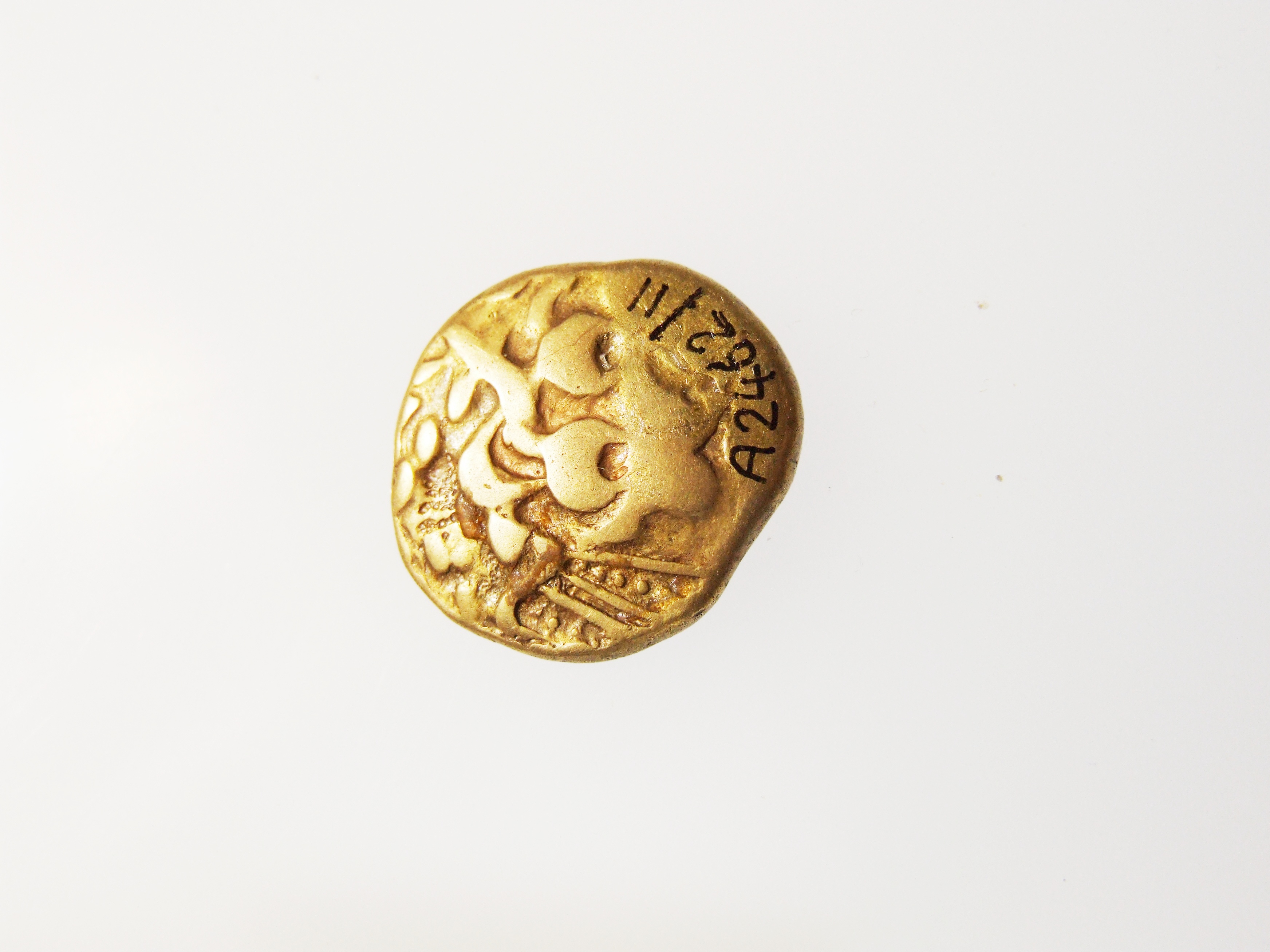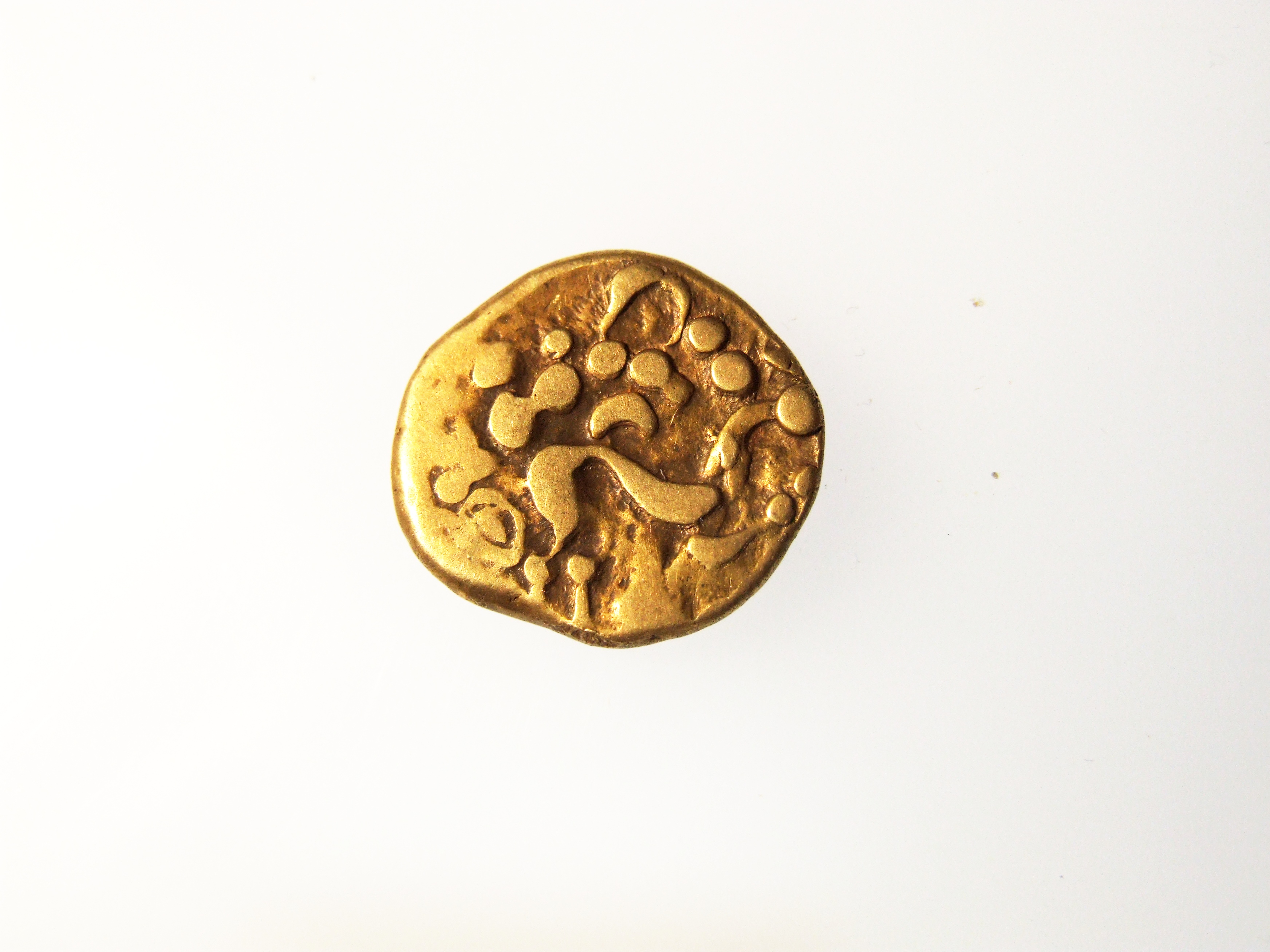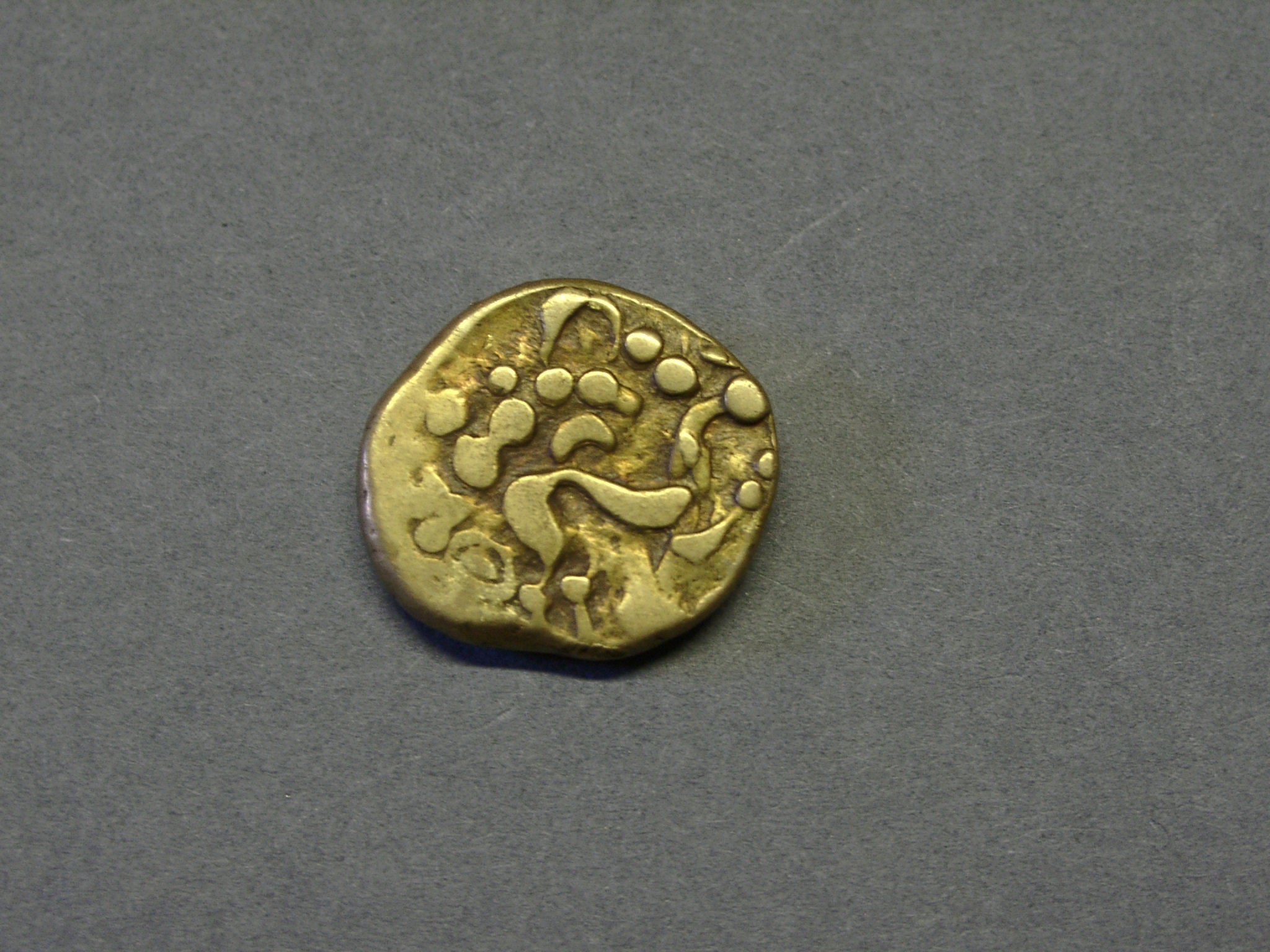 - DescriptionCoin; gold stater; Obv: remnant of Apollo? head; Rev: Celticized horse; probably originated in Gaul (France); shows some heavy surface wear. Part of the Higham hoard of 11 gold staters found packed into a hollow fossil sponge, plugged with clay. Recovered by Mr J Hill during excavations in 26/12/1912. Reported by G C Brooke in the in Numismatic Chronicle 1923, p.156.