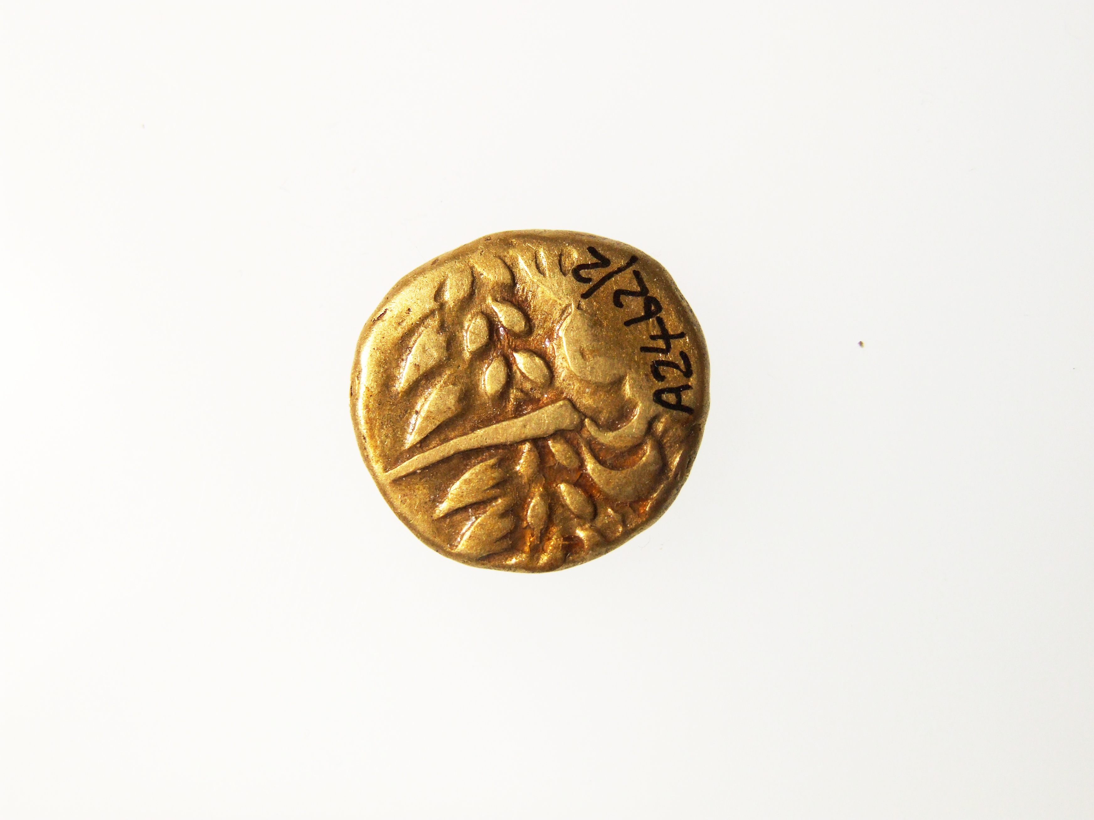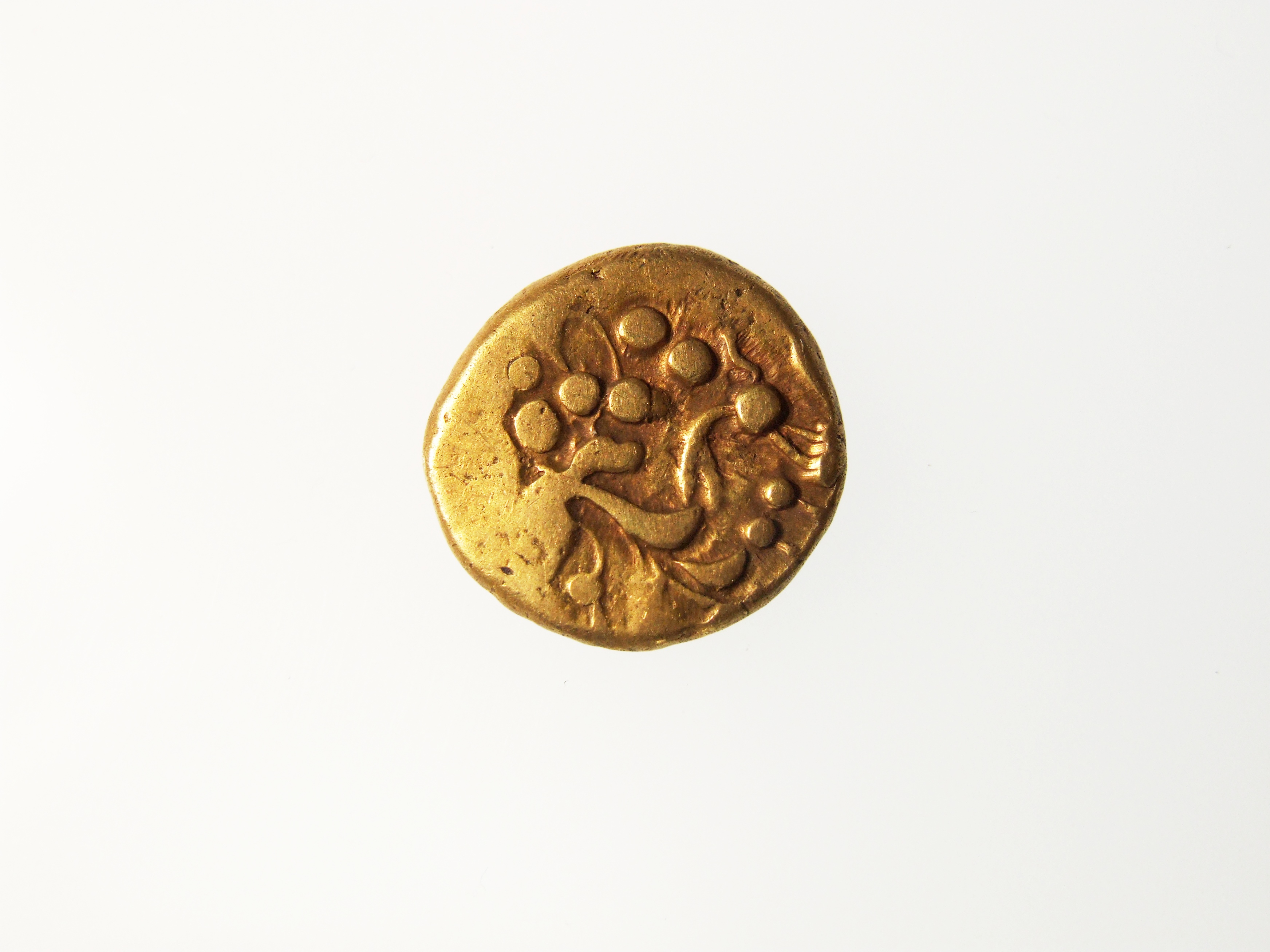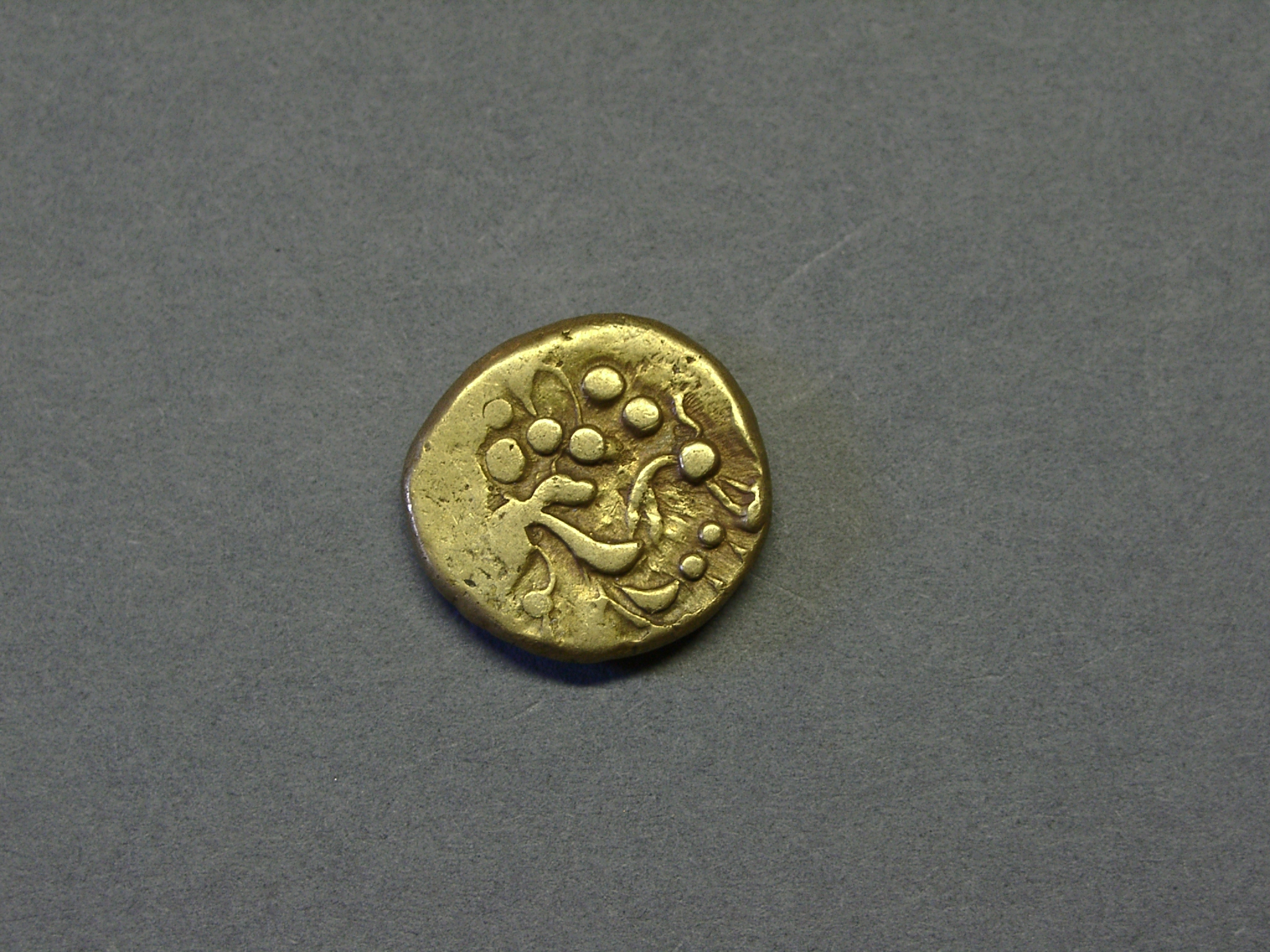 - DescriptionCoin; gold stater; Obv: remnant of Apollo? head; Rev: Celticized horse; probably originated in Gaul (France); shows some surface wear. Part of the Higham hoard of 11 gold staters found packed into a hollow fossil sponge, plugged with clay. Recovered by Mr J Hill during excavations in 26/12/1912. Reported by G C Brooke in the in Numismatic Chronicle 1923, p.156.