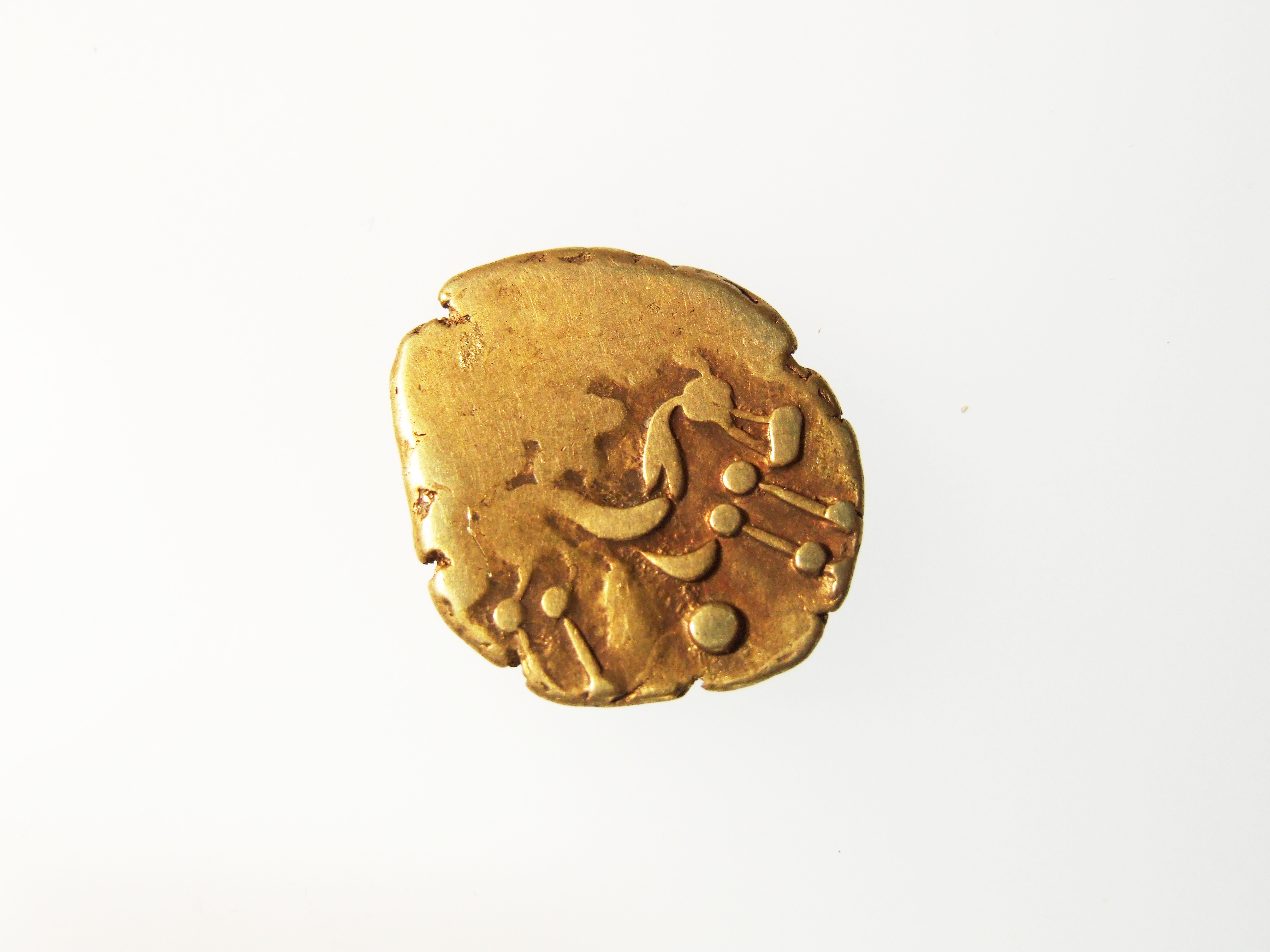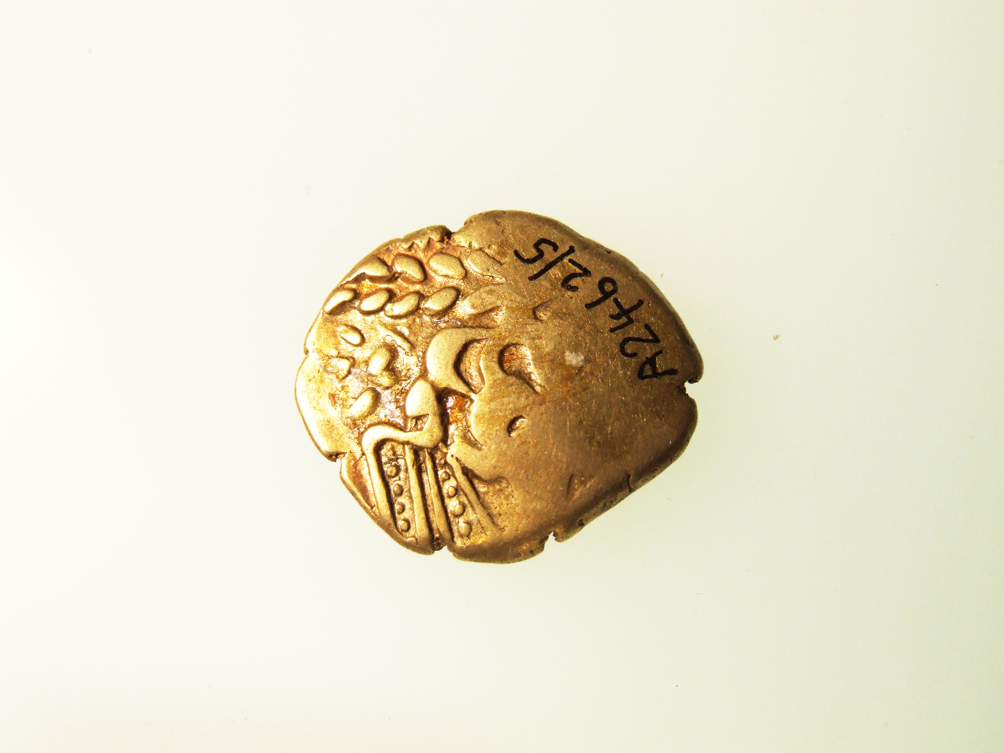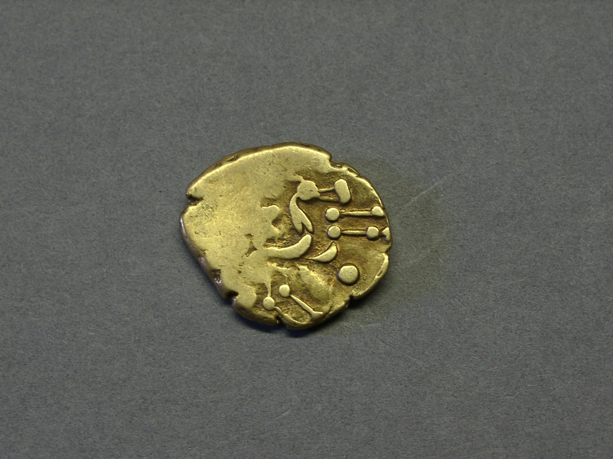 - DescriptionCoin; gold stater; Obv: remnant of Apollo? head; Rev: Celticized horse; probably originated in Gaul (France); shows some heavy surface wear. Part of the Higham hoard of 11 gold staters found packed into a hollow fossil sponge, plugged with clay. Recovered by Mr J Hill during excavations in 26/12/1912. Reported by G C Brooke in the in Numismatic Chronicle 1923, p.156.