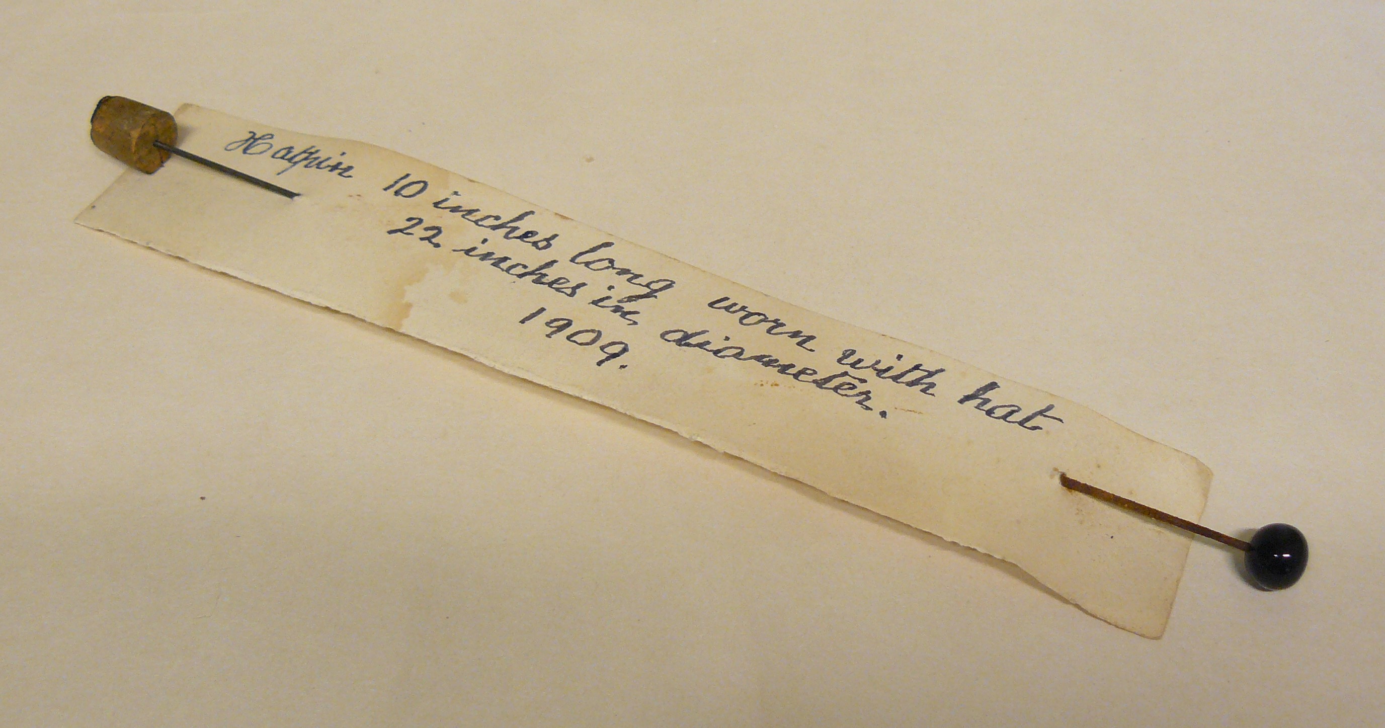 Hat pin with black glass head; attached description states it was worn with a large hat of 22" diameter in 1909. Owned by Miss A Butler.