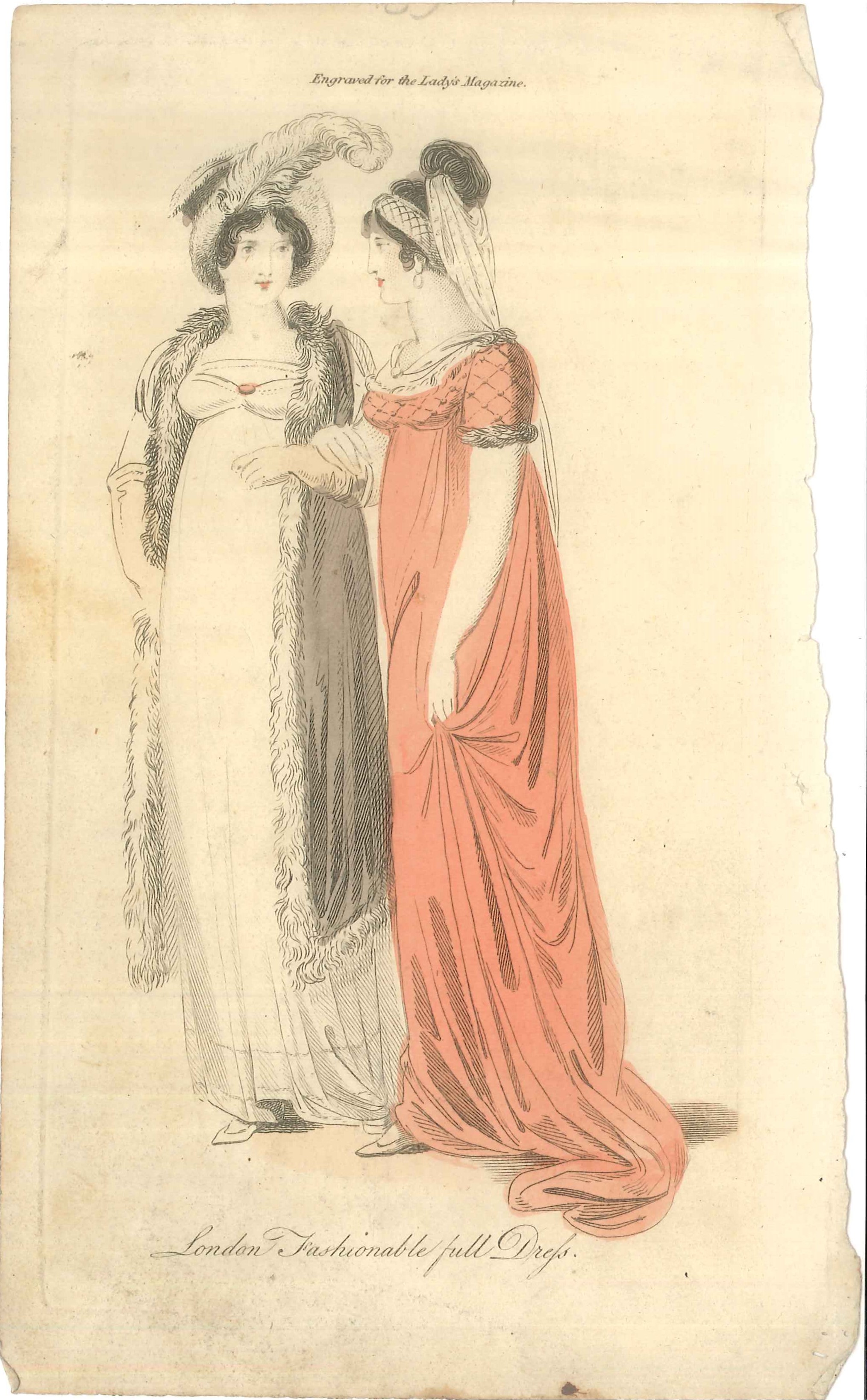 - DescriptionPrint of ladies fashions taken from 'The Lady's Magazine'; monochrome print with some hand-painted tinting; circa 1800-1810.