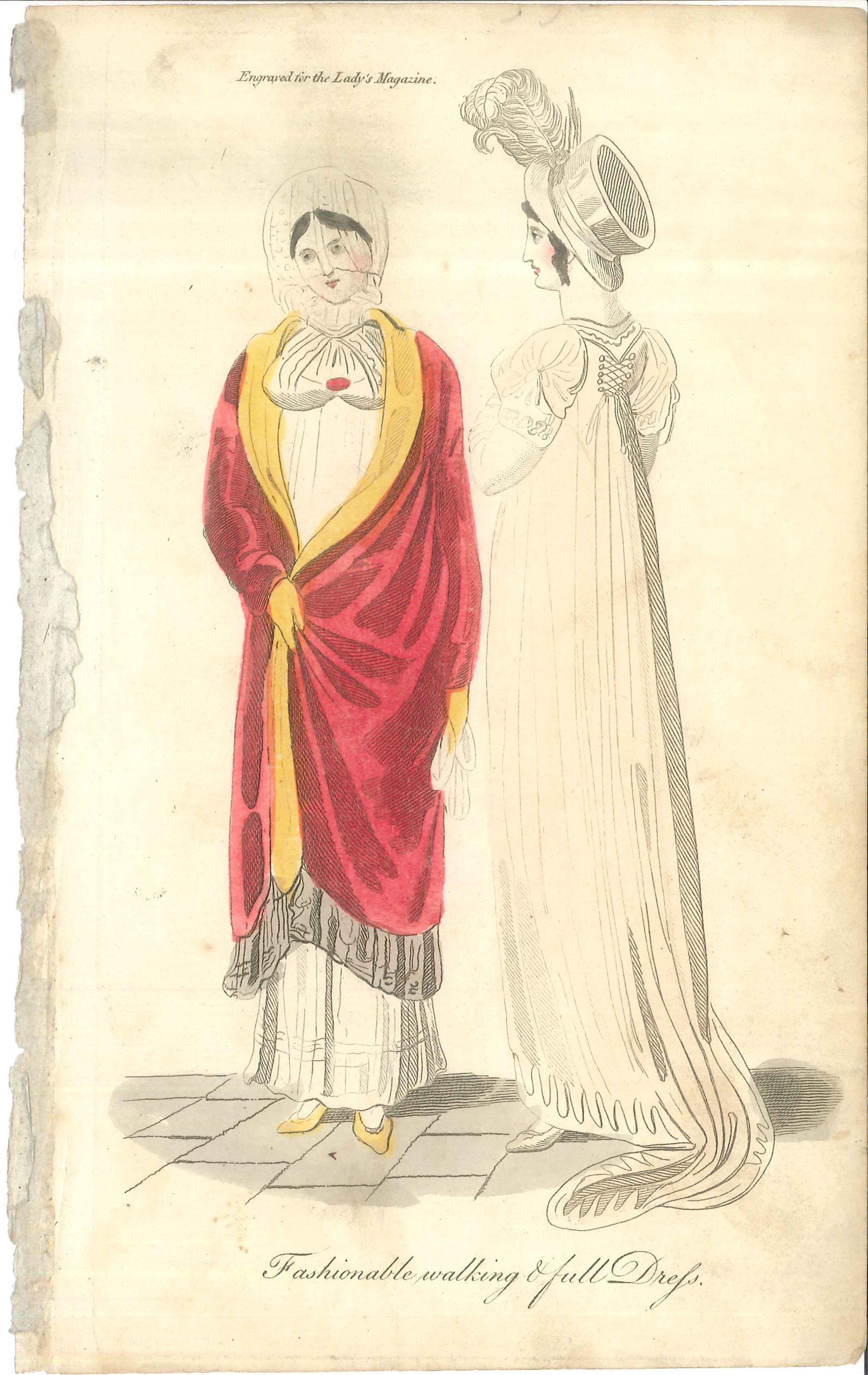 - DescriptionPrint of ladies fashions taken from 'The Lady's Magazine'; monochrome print with some hand-painted tinting; circa 1800-1810.