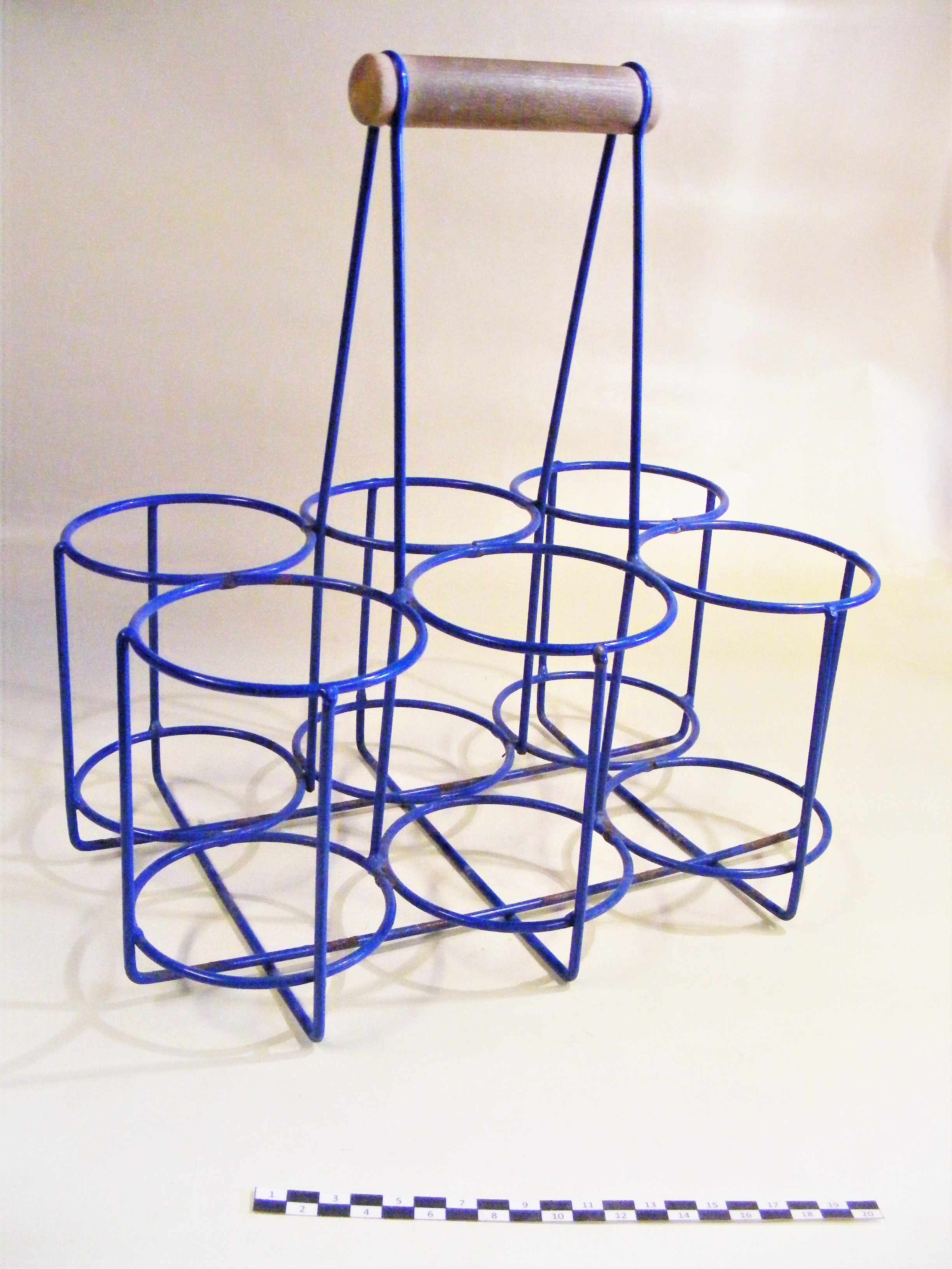 Milk bottle carrier; simple carrying crate to hold 6 pints of milk; blue-painted wire frame with wooden handle.