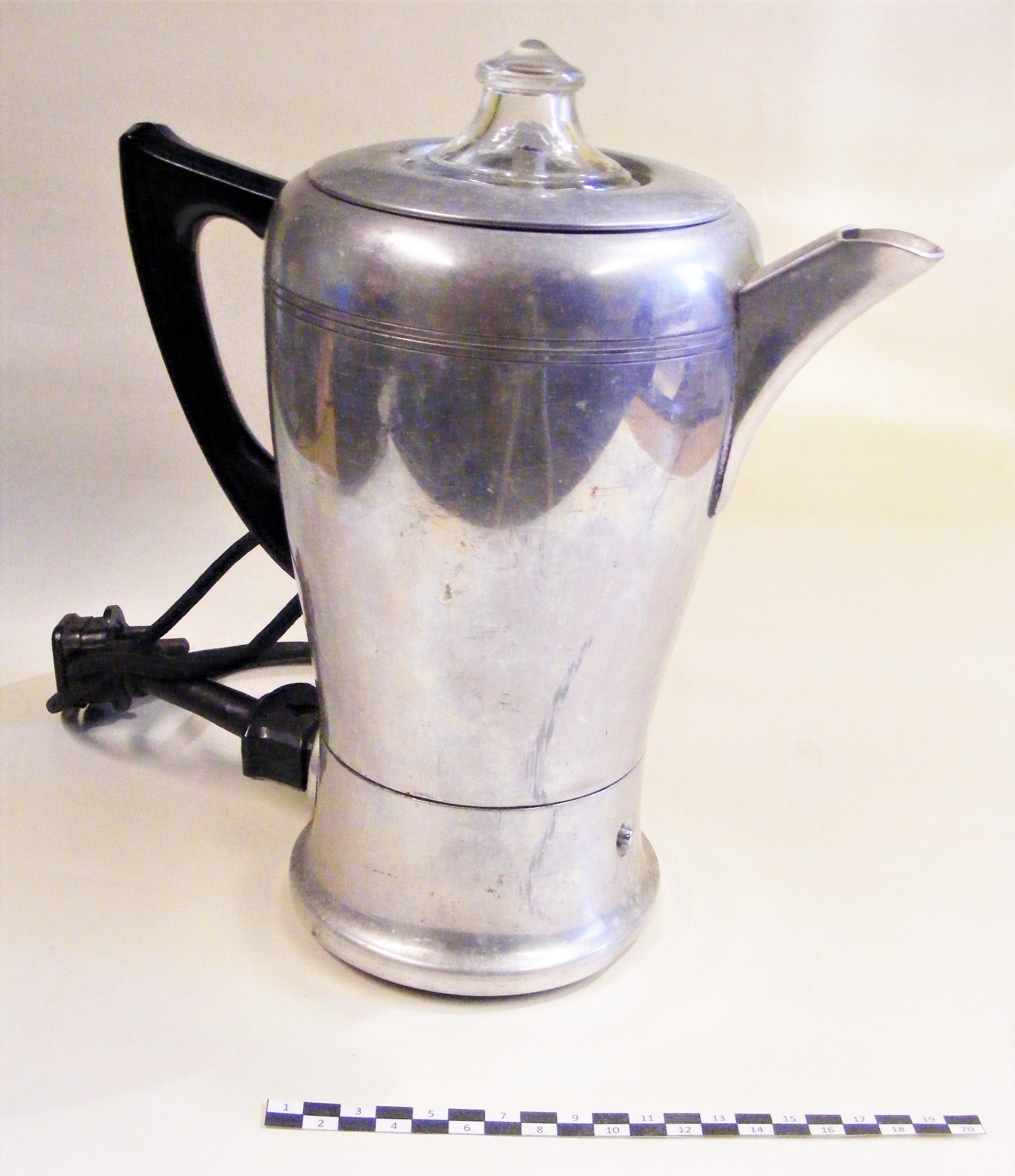 - DescriptionCoffee percolator; made by Bulpitt & Sons of Birmingham; part of their 'Swan Brand' range; made mostly of metal with a glass knob on the lid; textile-covered lead with bakelite 3-pin plug; insulating rubber base ring.
