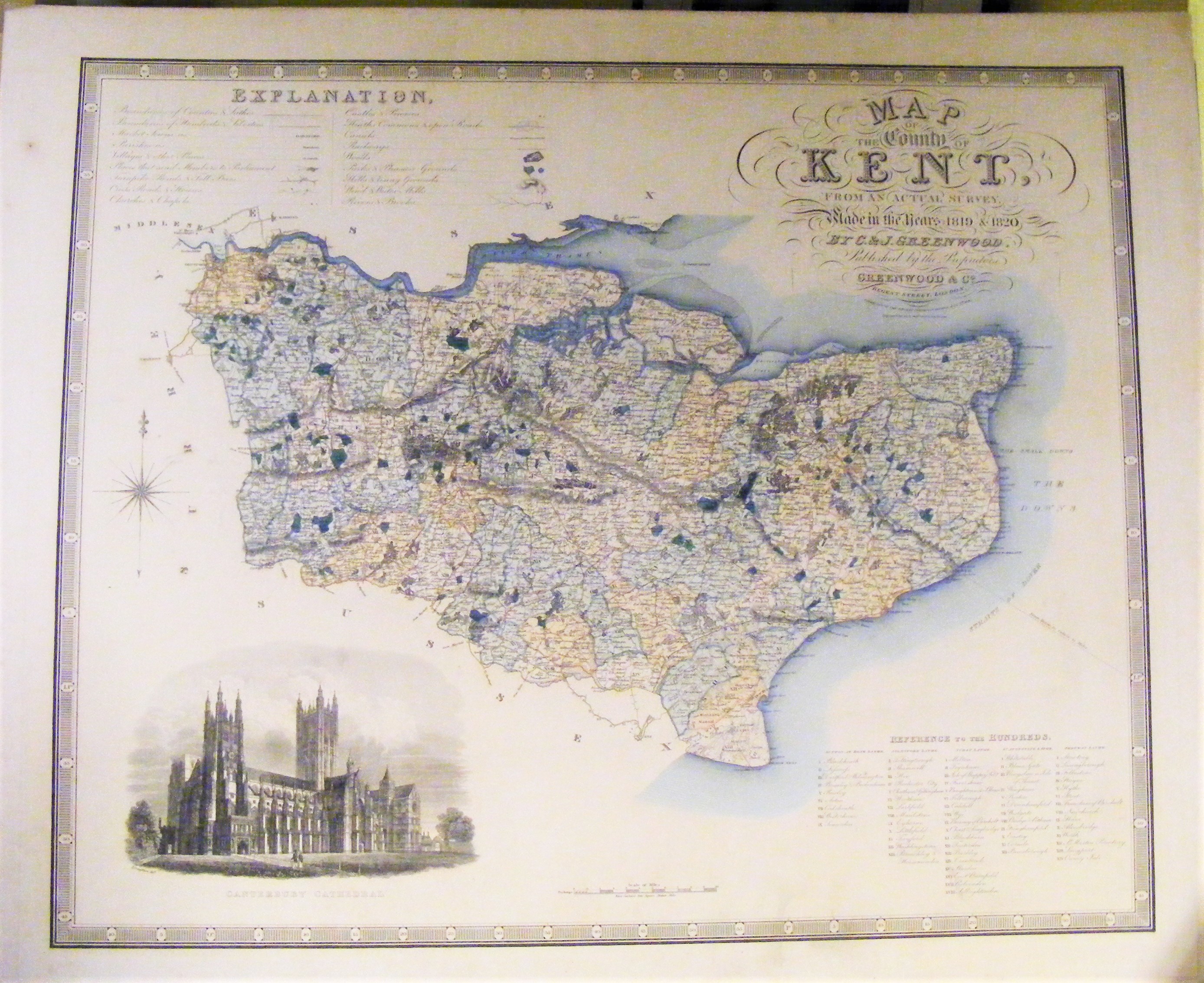 - DescriptionLarge engraved print of a map of Kent, published in 1829 by Christopher & John Greenwood of London; engraved by James & Josiah Neele of London; added light tinting; includes an engraved image of Canterbury cathedral by R Creighton; backed on to card, in good condition.