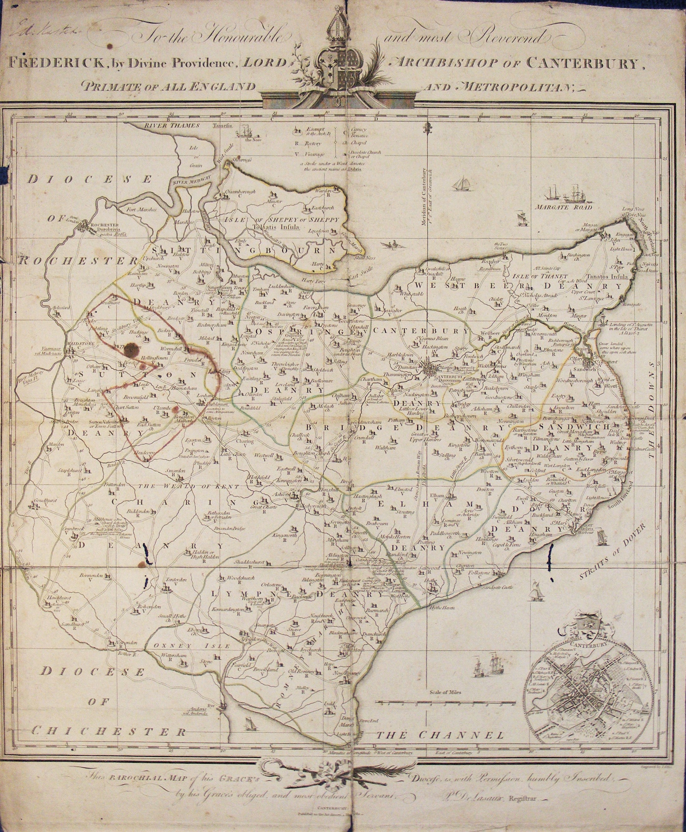 Large engraved print of a parochial map of Kent, published 1782; dedicated to the Archbishop of Canterbury; shows and names all the churches in his diocese; some added light tinting shows parochial boundaries; some splits along fold lines, but otherwise in good condition. A handwritten note at the top suggests a link to Hasted; a folded map from a book? Some old woodworm damage.