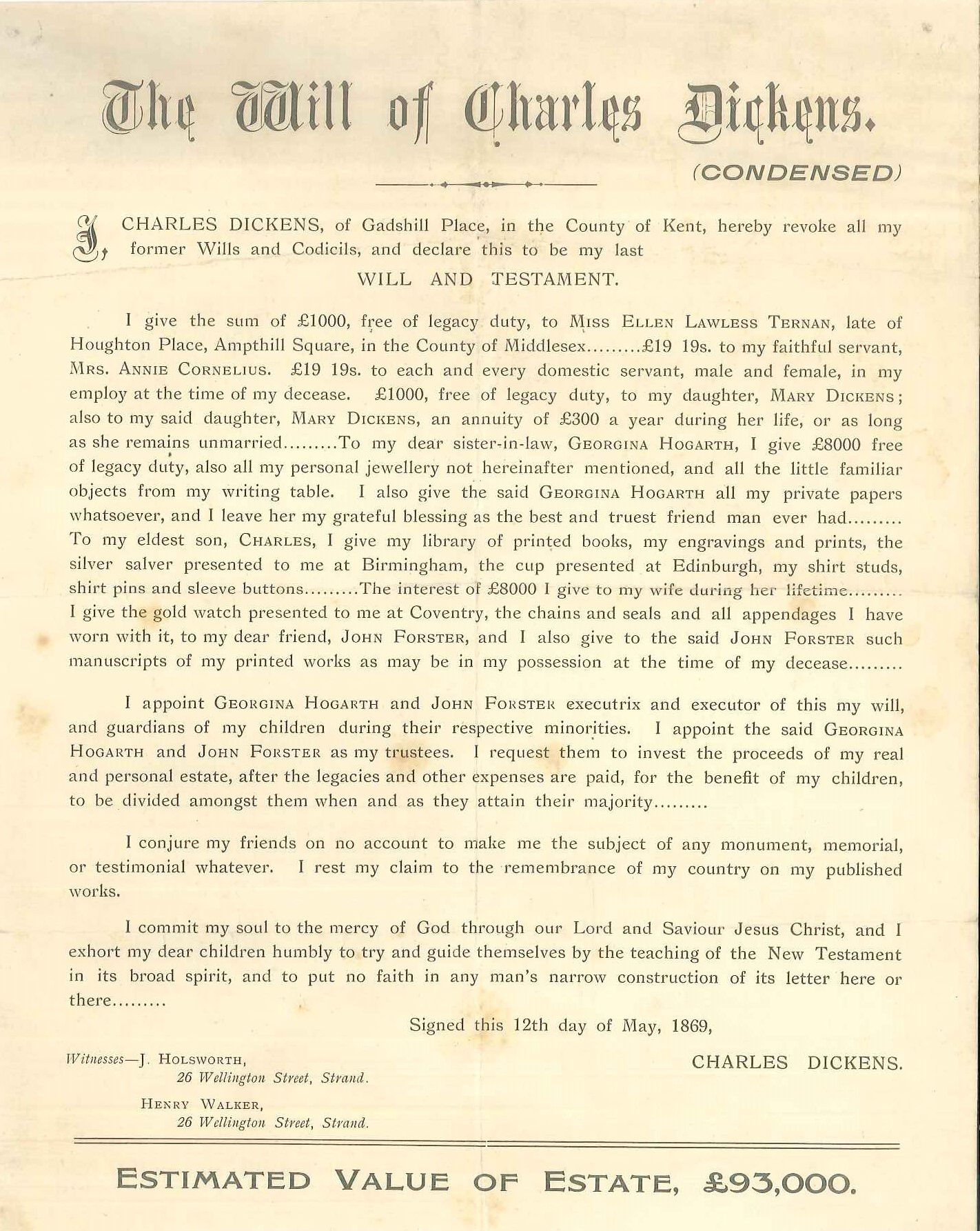 facsimile will of Charles Dickens