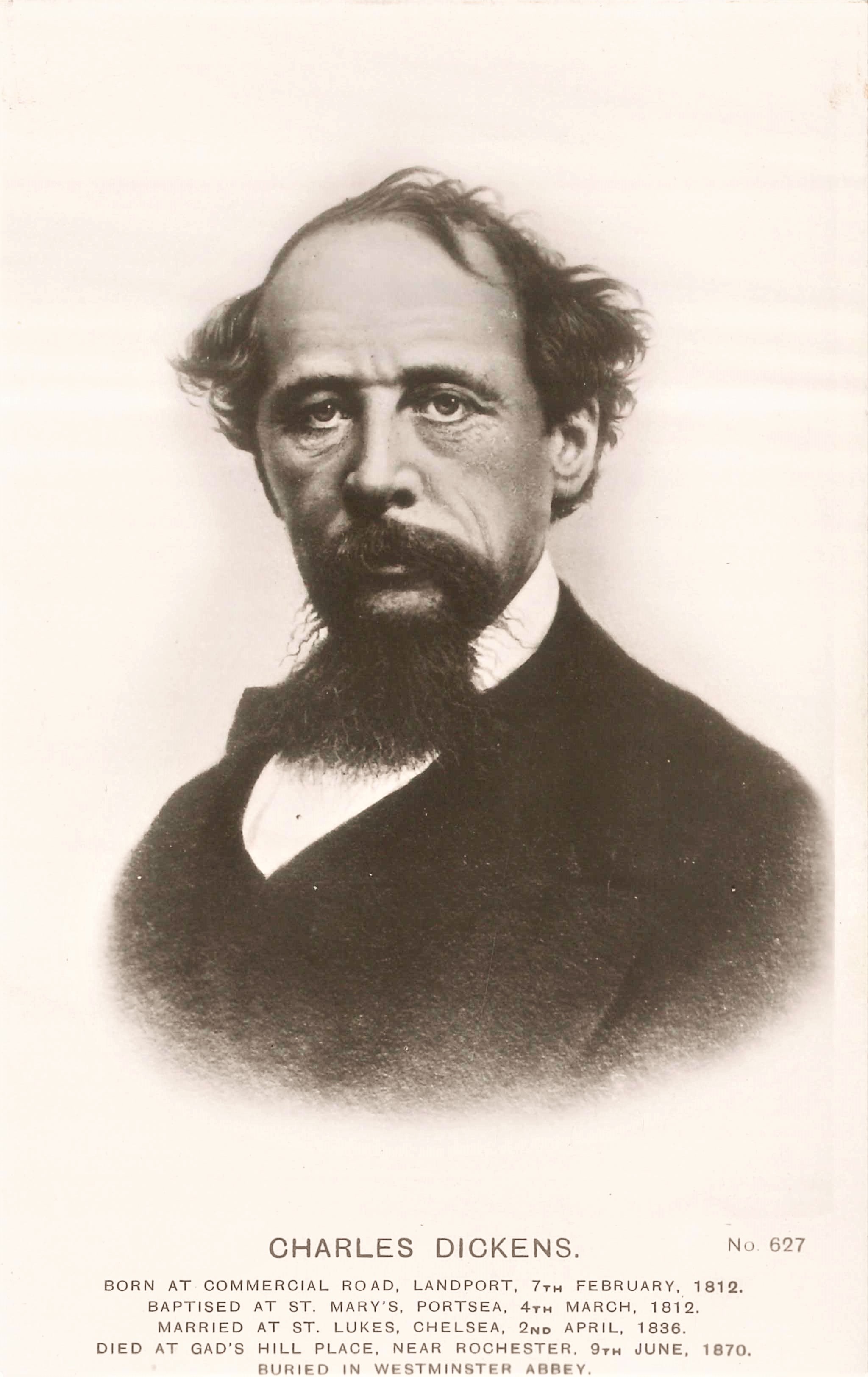 - DescriptionPhotograph of Charles Dickens; postcard image taken from an original picture taken in September 1863 by John & Charles Watkins.