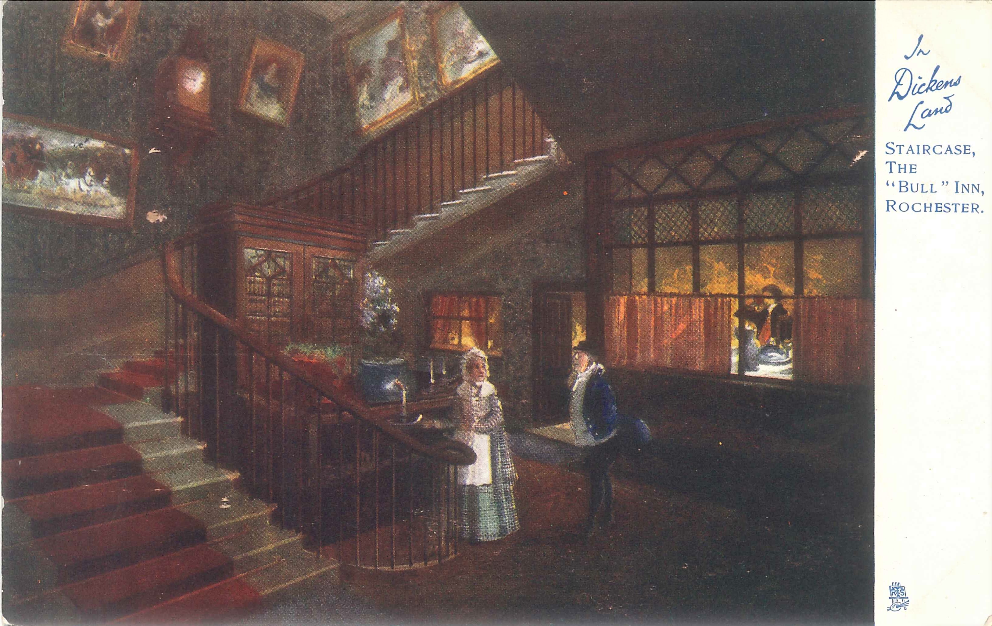 - DescriptionPostcard colour print of a watercolour of the staircase of the Bull Hotel; 'In Dickens Land' series; message written on the reverse is postmarked Nov 1903.