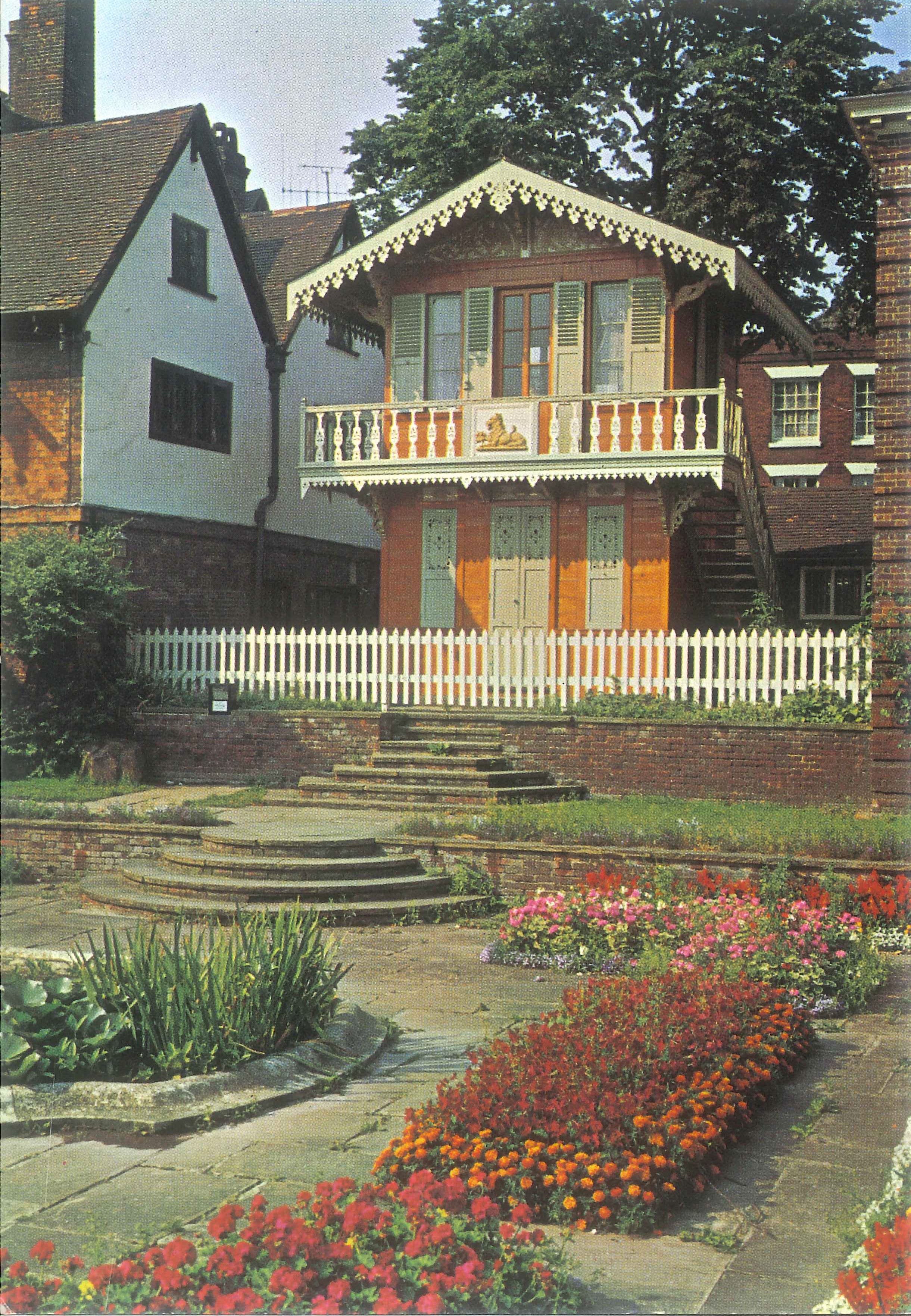 - DescriptionPostcard showing a colour image of the chalet given to Charles Dickens in 1864; originally located at Gad's Hill, moved to Cobham Park, now at Eastgate House; this image shows the chalet in Eastgate House gardens; circa 1970's or 1980's.