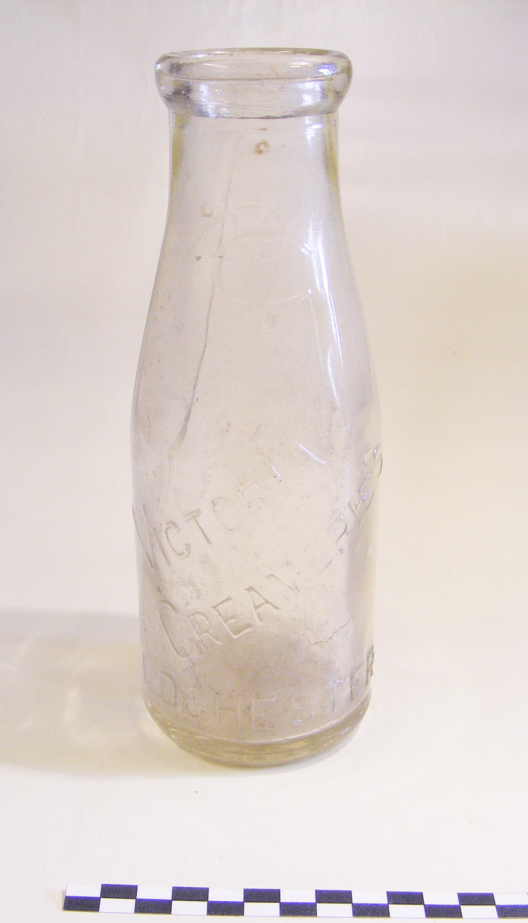 Milk bottle, pint size, colourless glass; wide-mouthed; moulded, visible seam; long crack through the side.