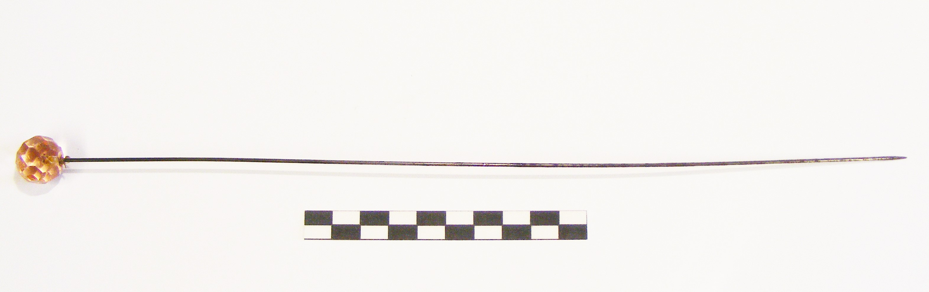 Hat pin; long shaft; globular head of faceted pink glass; one of a pair.
