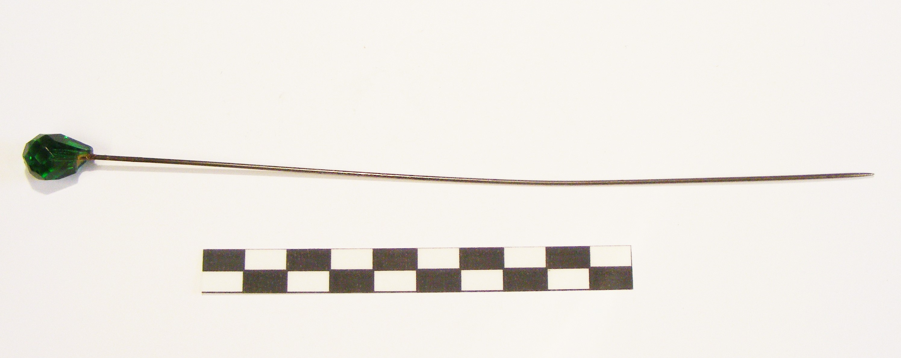 Hat pin; long shaft; teardrop-shaped head of faceted green glass (damaged).