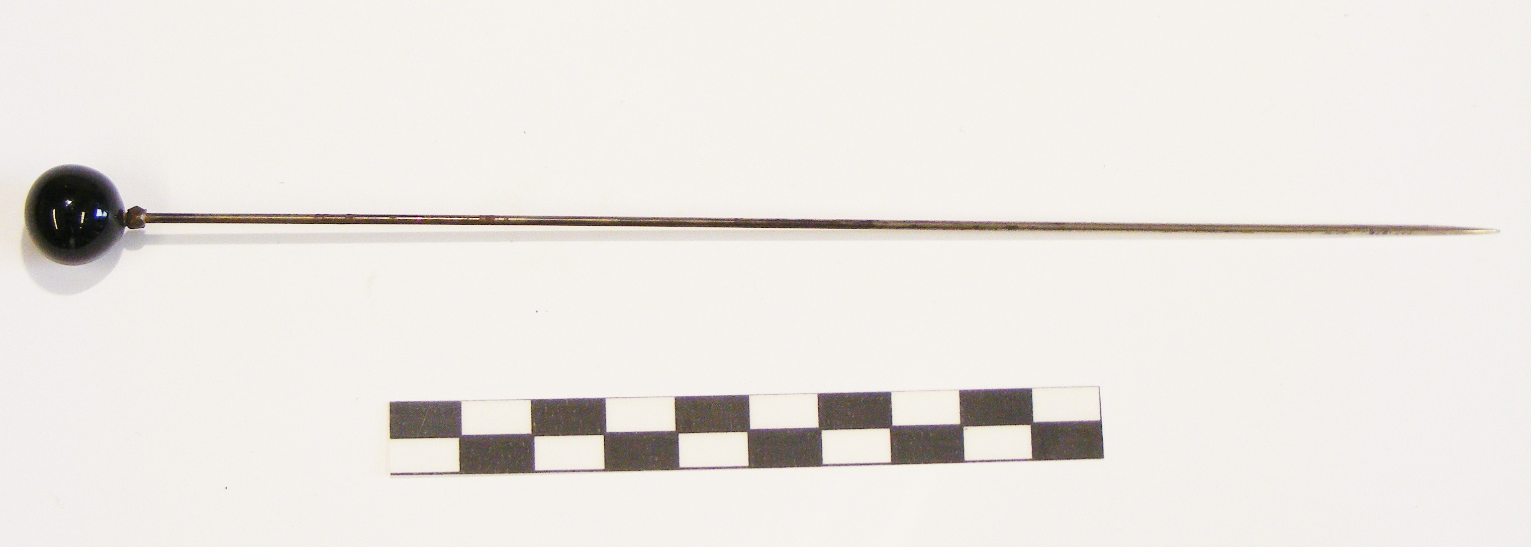 Hat pin; long shaft; globular head of black glass.
