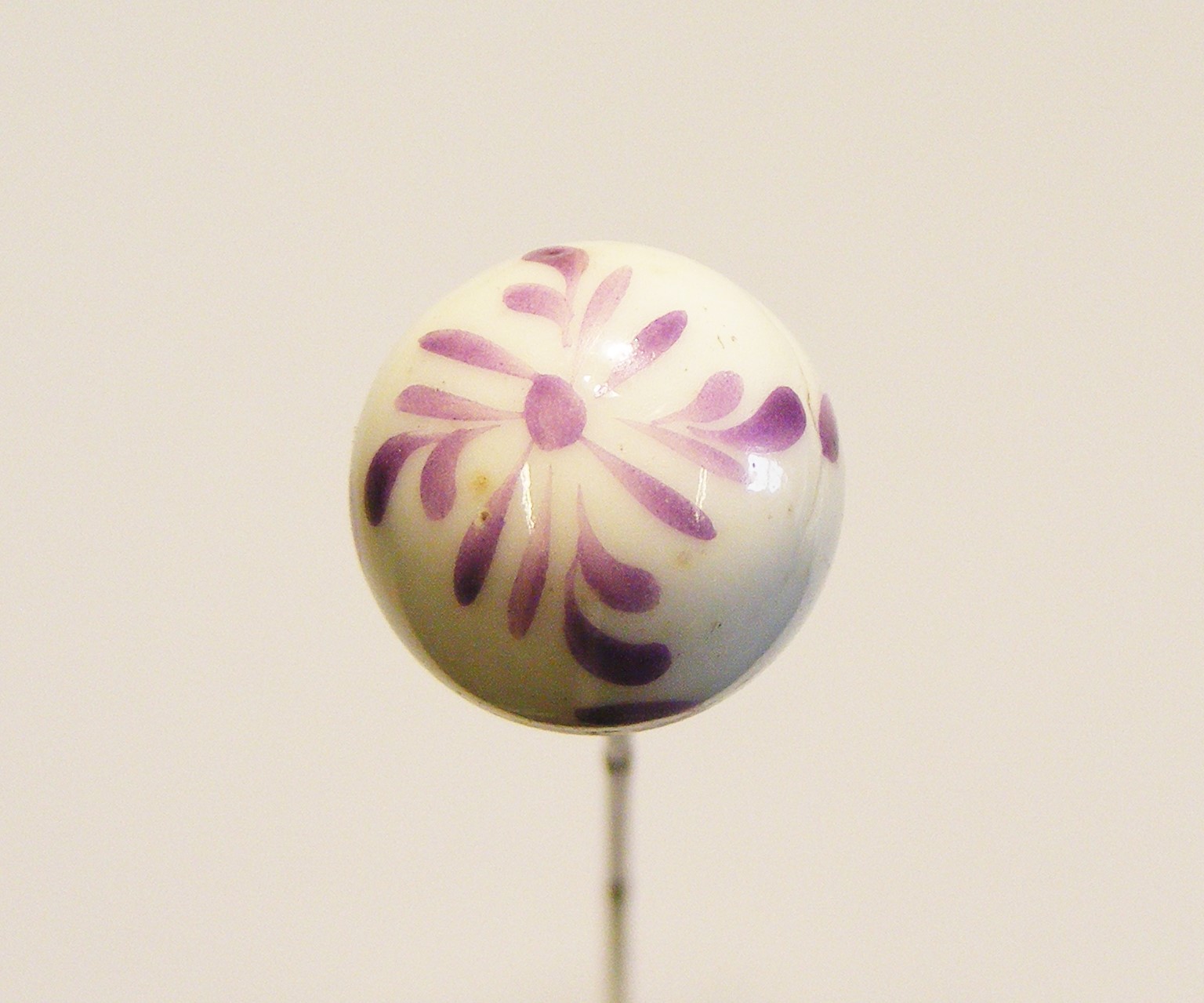 Hat pin; long shaft; globular head of white ceramic with painted mauve floral design.