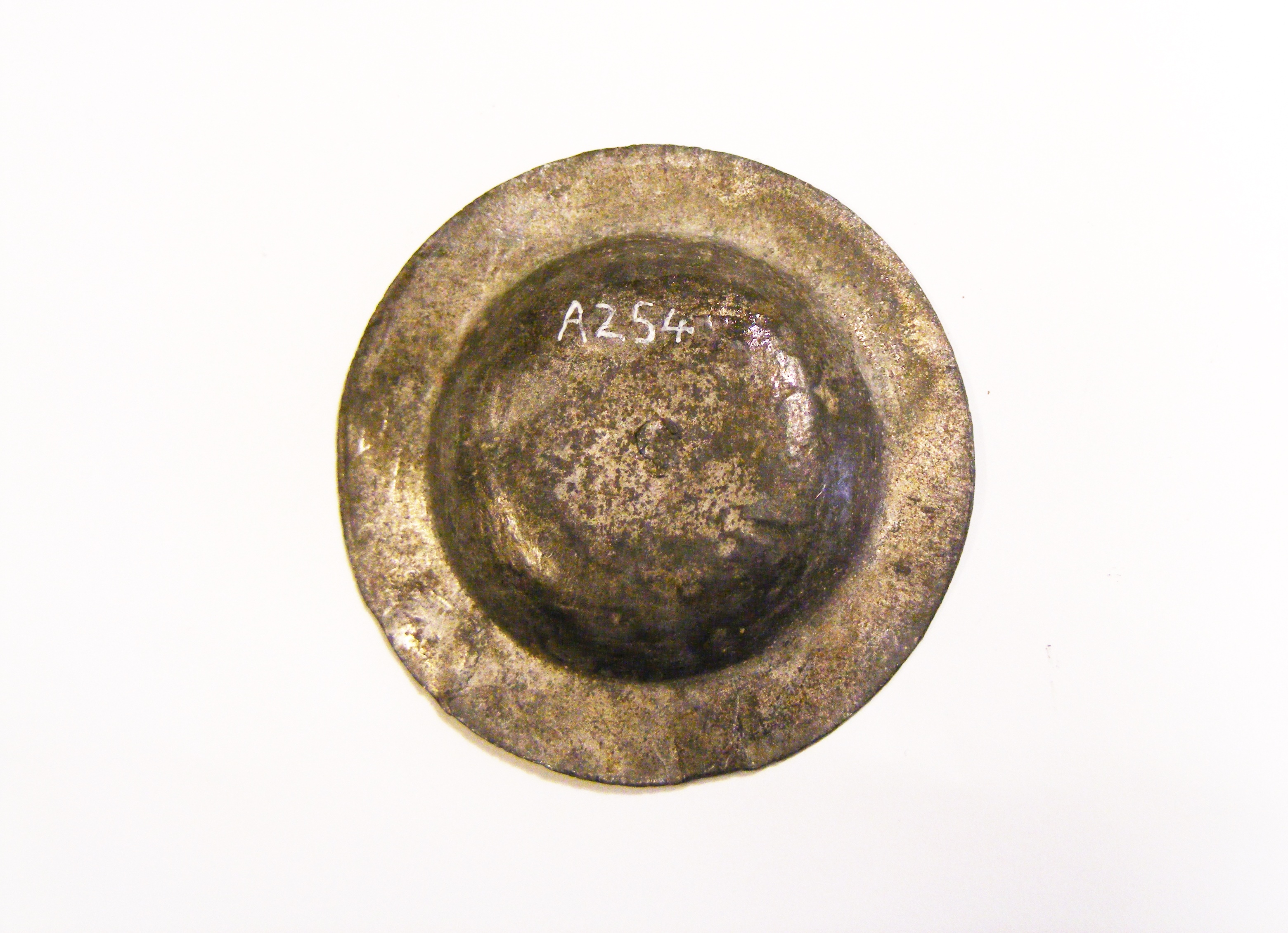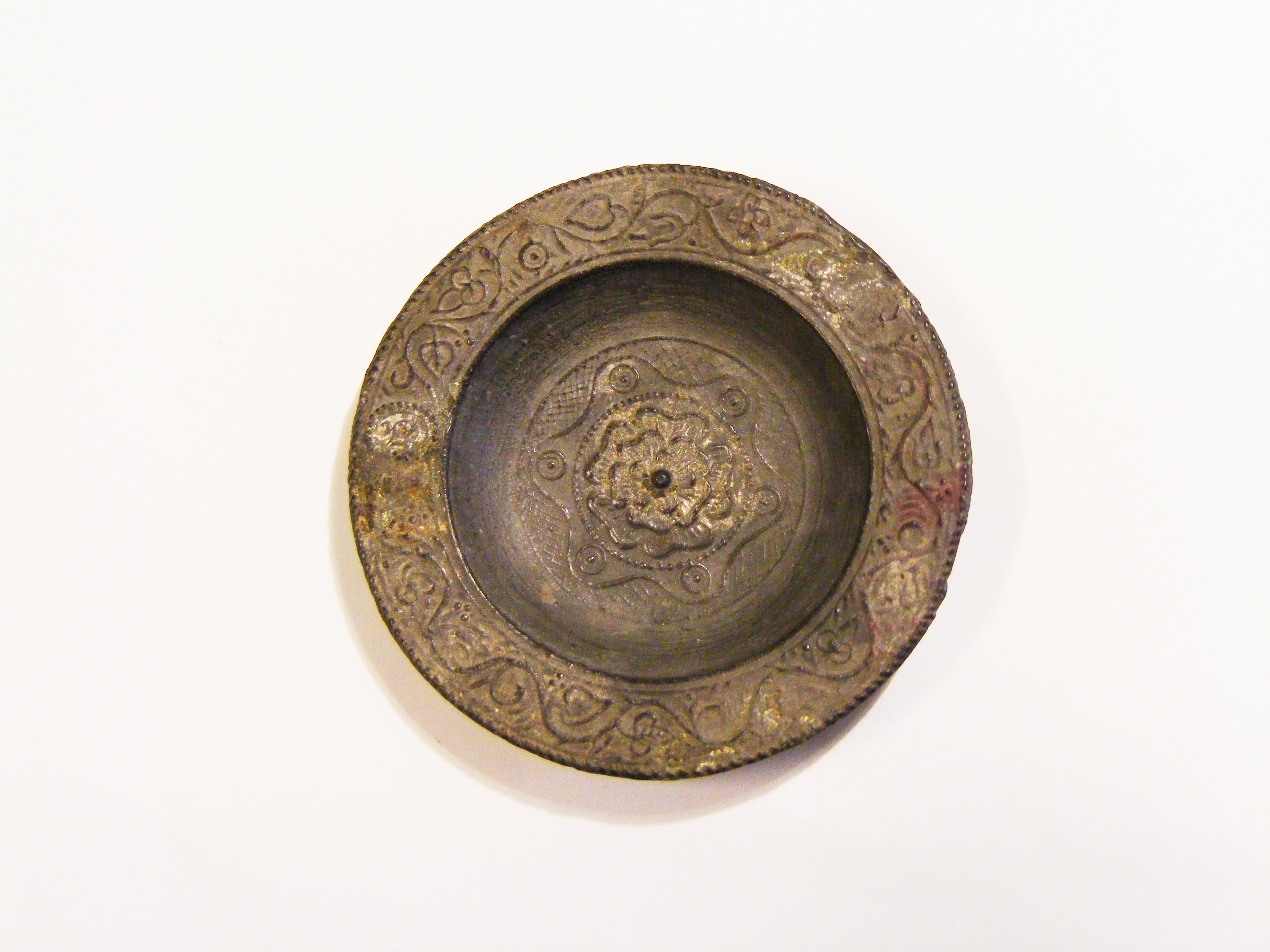 Toy plate of pewter, inner surface stamped with floral decoration. Apparently recovered from Eastgate House garden.