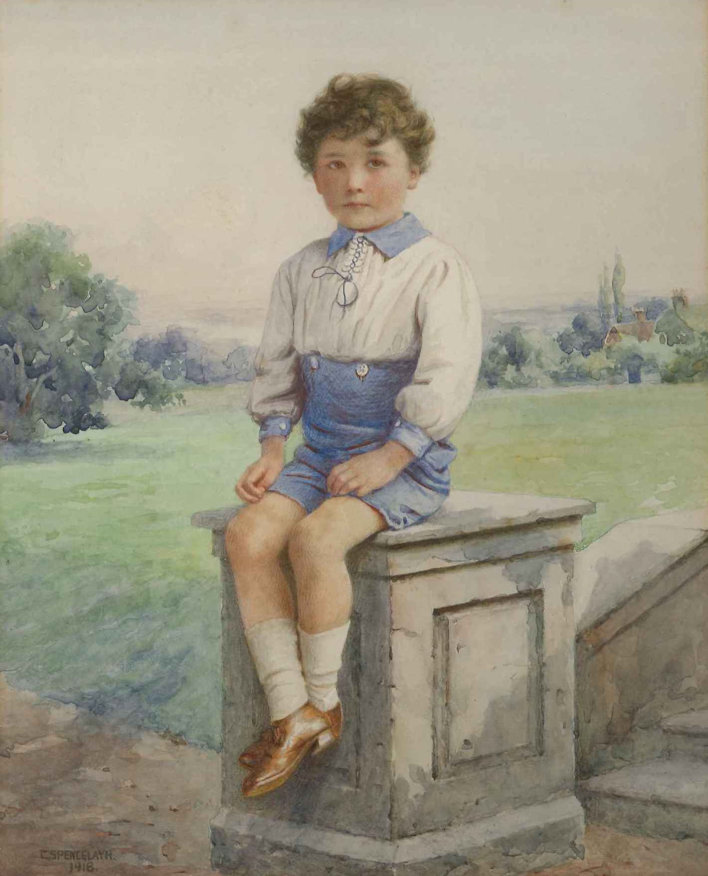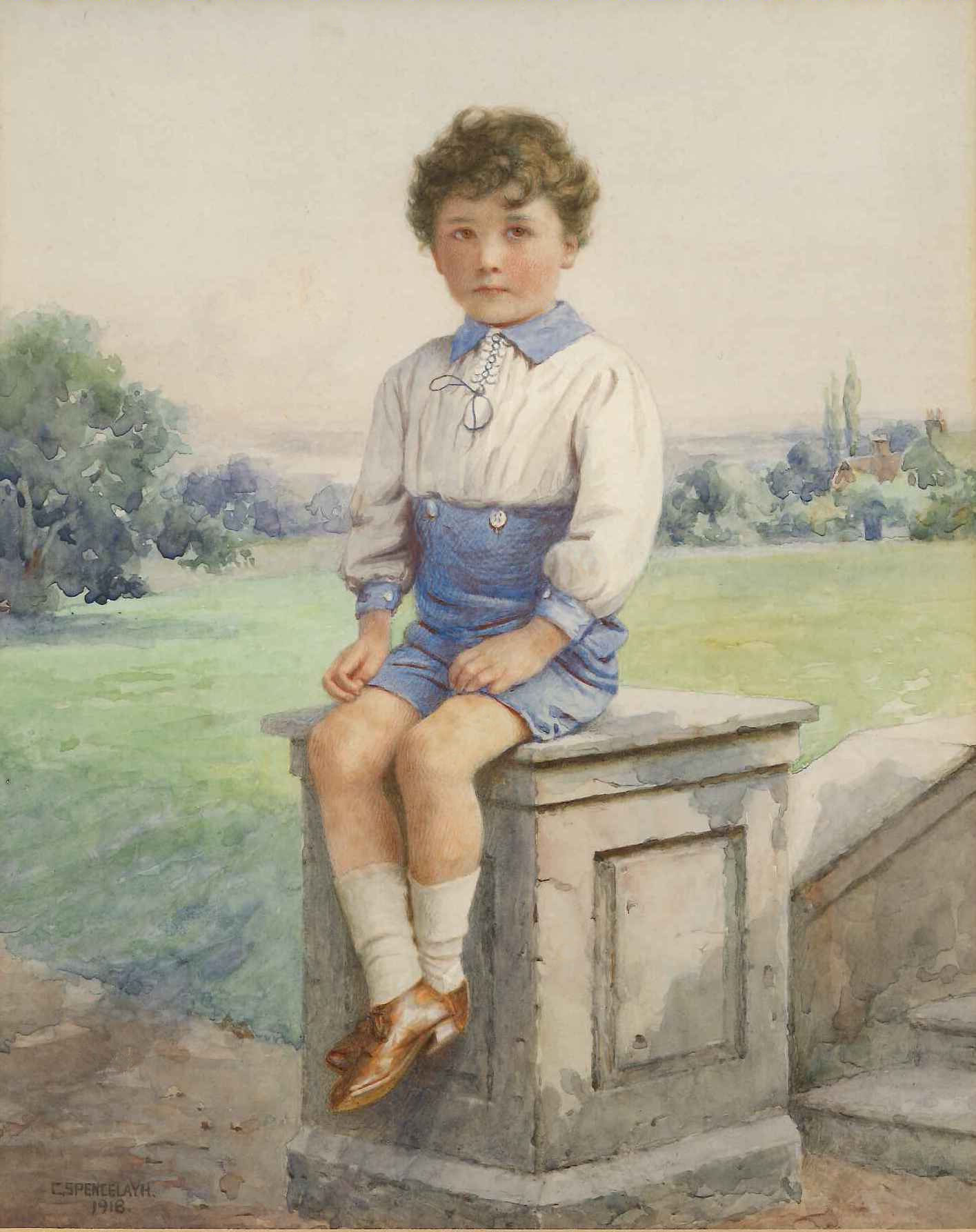 - DescriptionWatercolour painting; 'In his sunday best'; by Charles Spencelayh (1865-1958); shows a boy in a blue & white suit, seated in a garden; very slightly spotted from damp (edited out of second attached image).