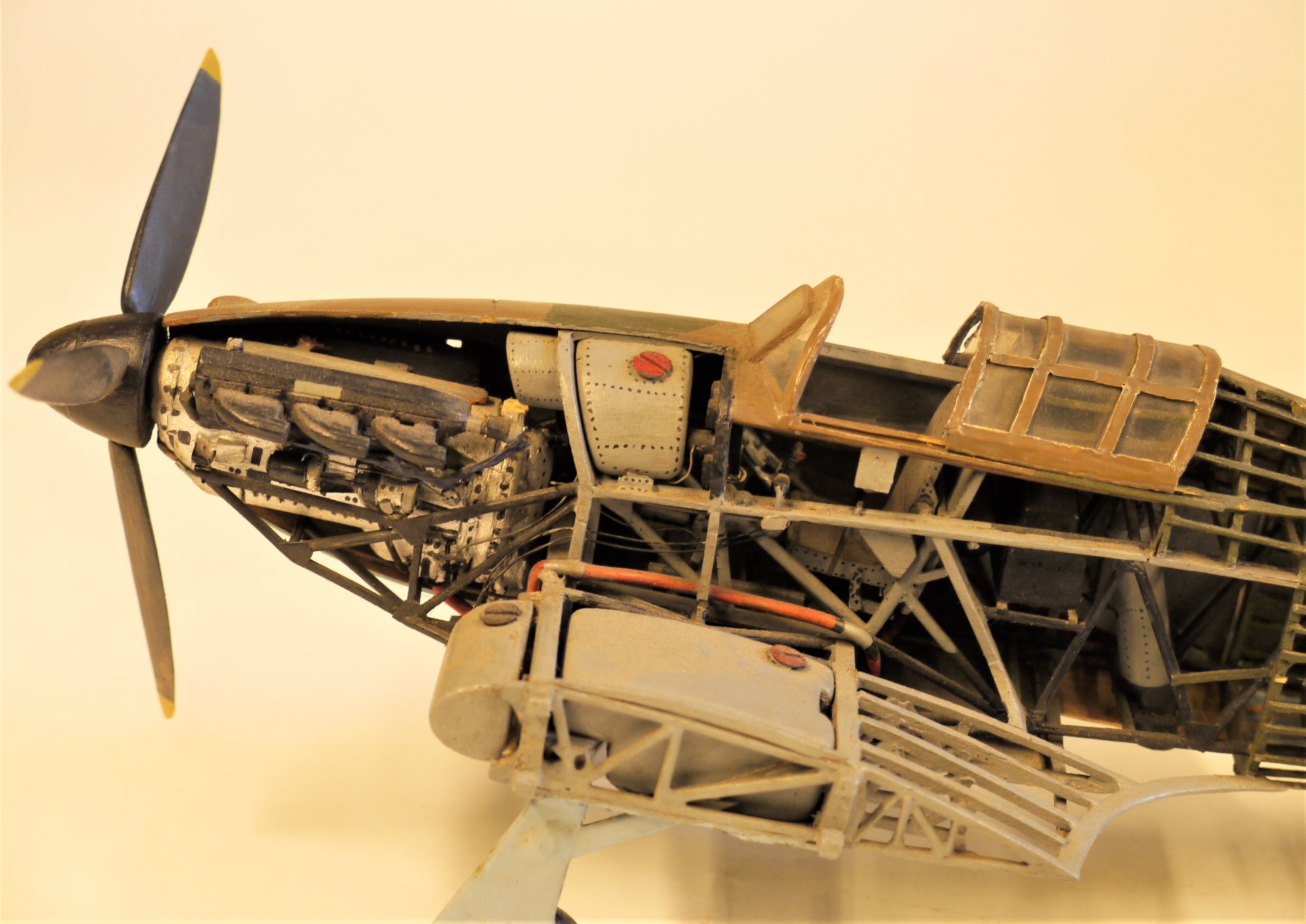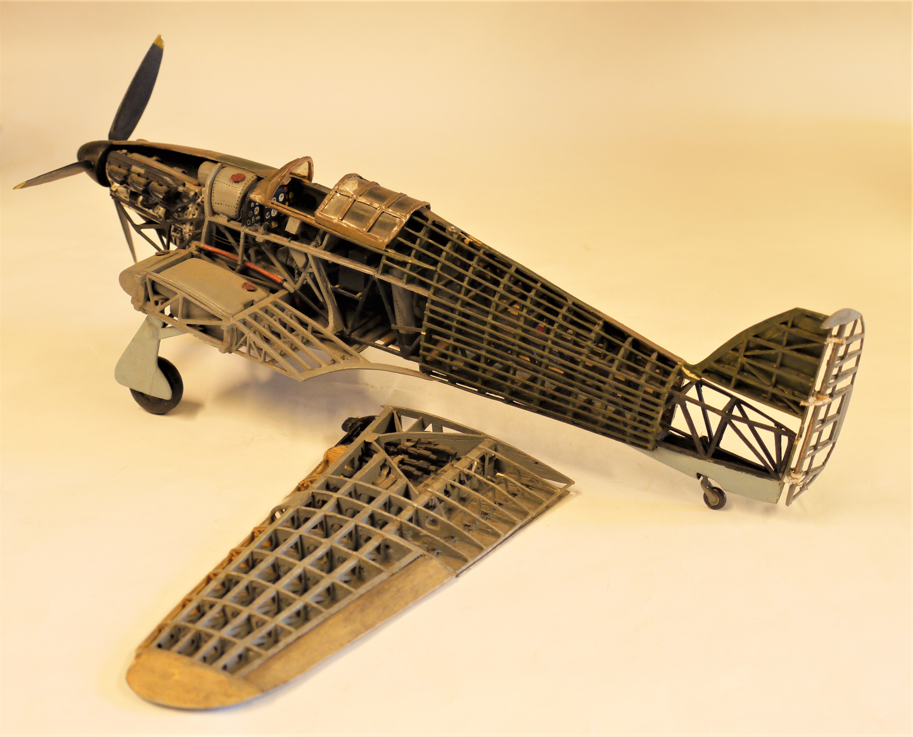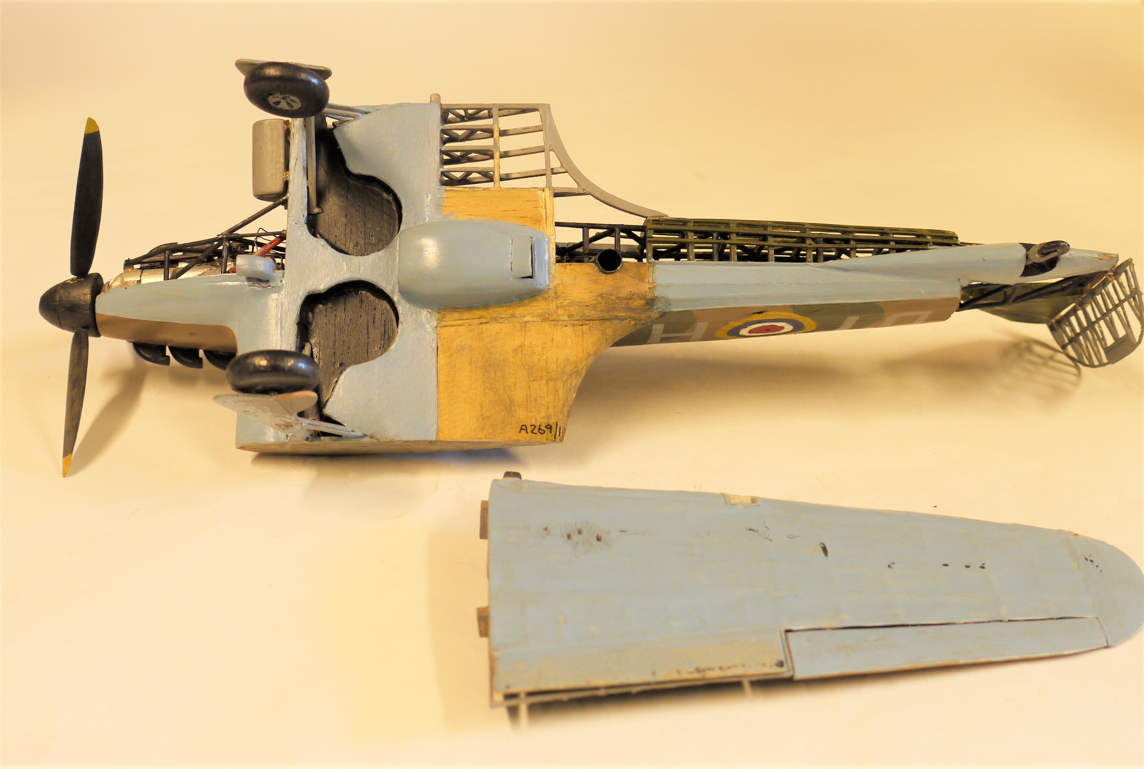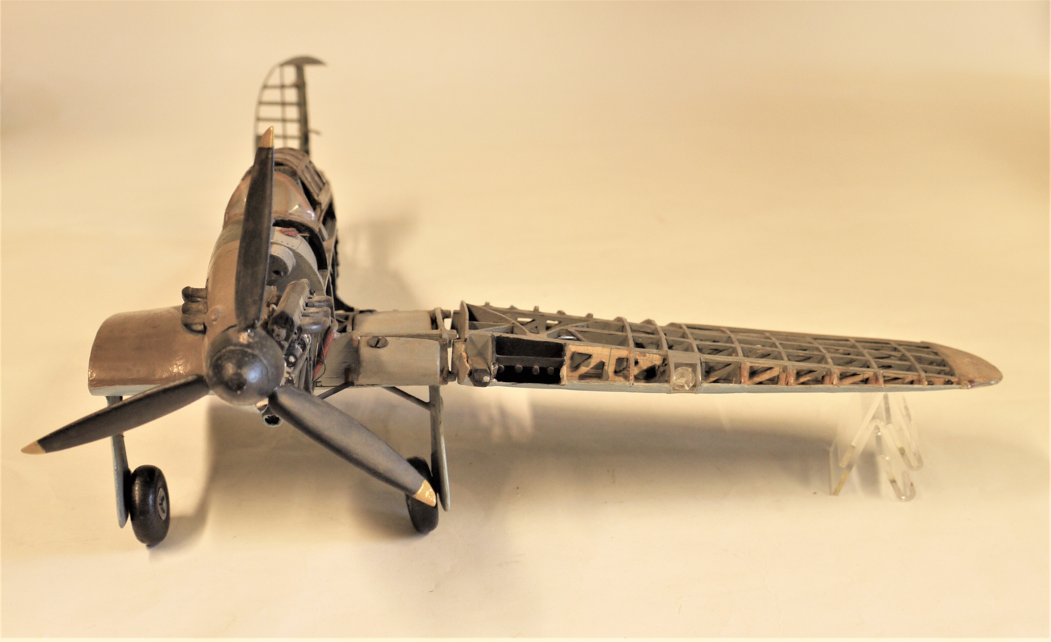 Model aircraft; accurate scale model of a Hawker Hurricane. Cutaway to show details of the airframe, engine, armament, etc. Some slight damage.