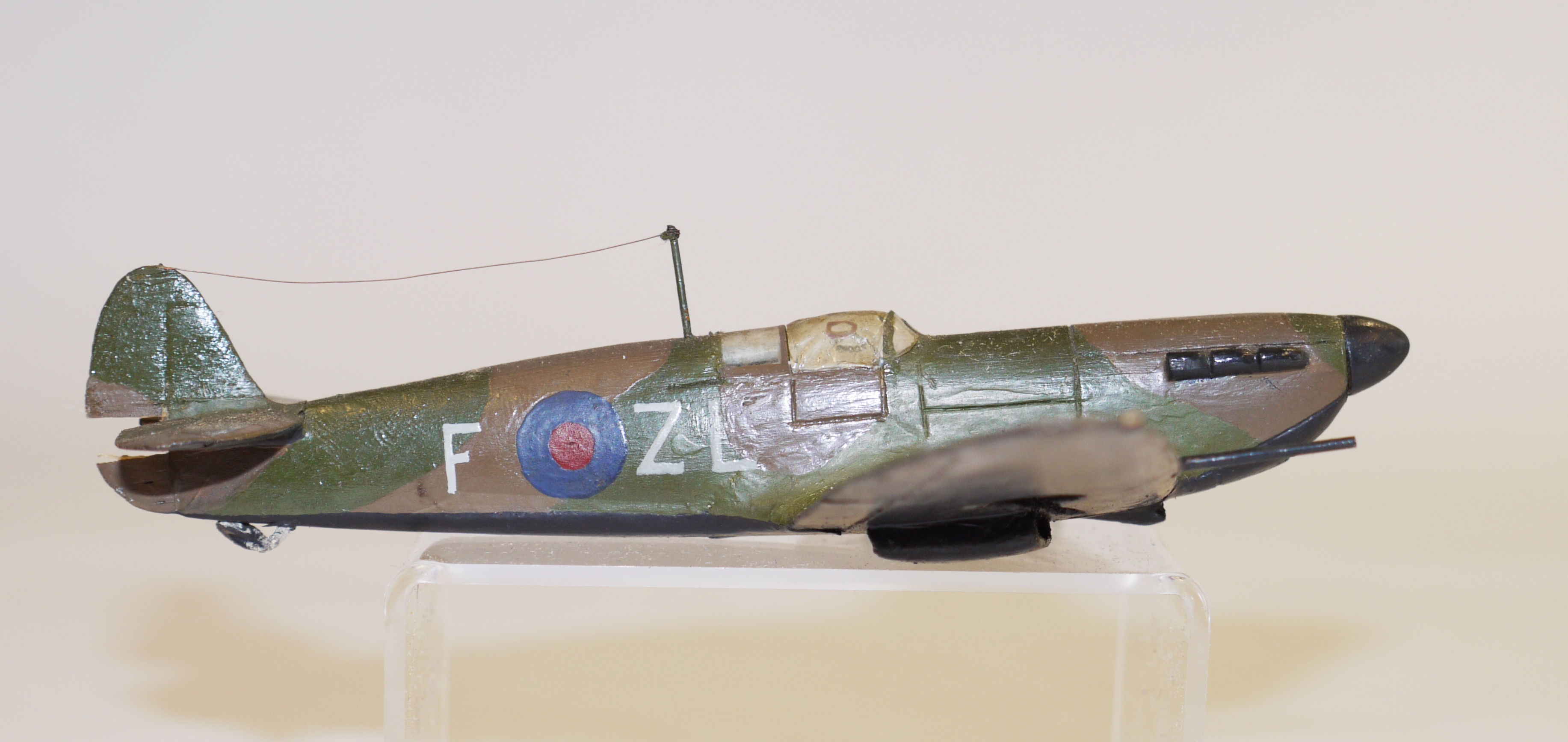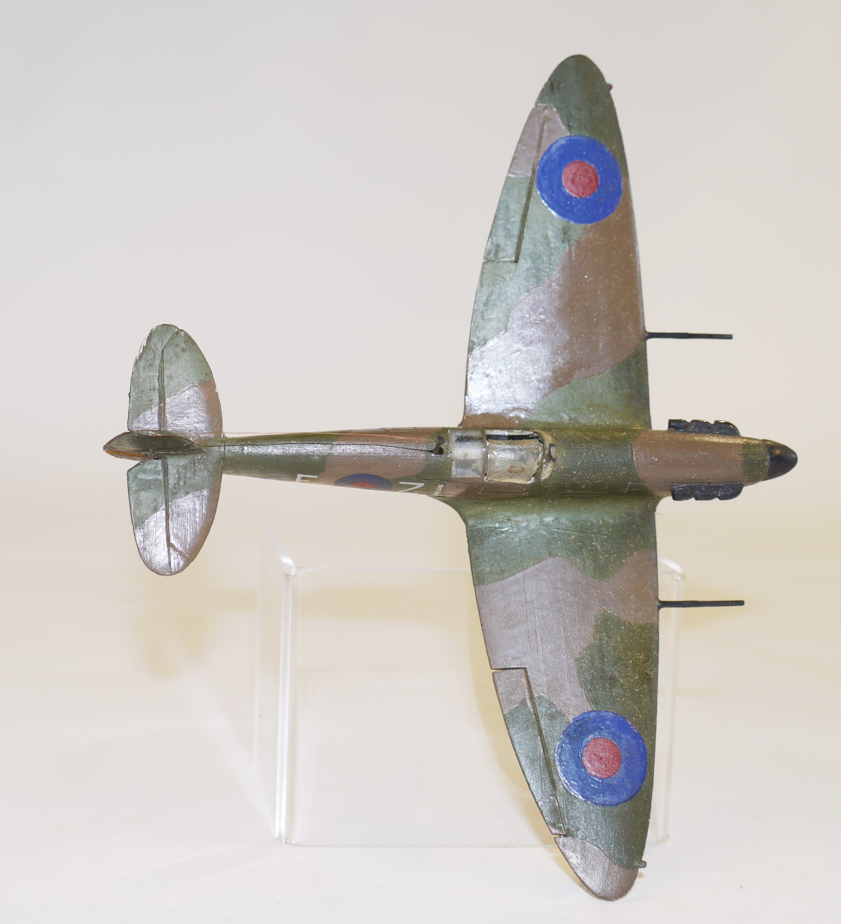 Model aircraft; accurate scale model of a Supermarine Spitfire, painted in black, night camouflage colours, with markings for 65 Sqn Royal Air Force.