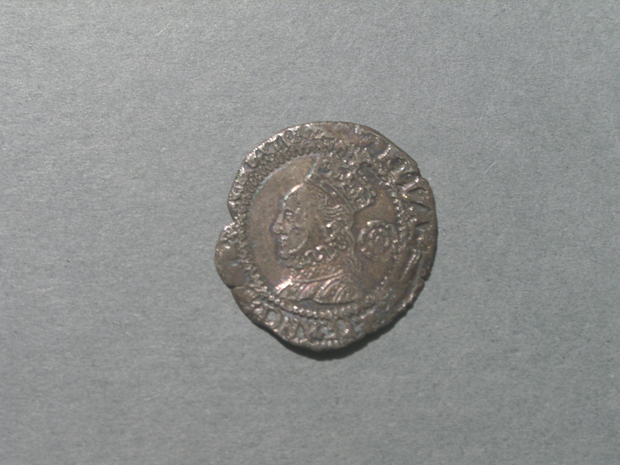- DescriptionCoin; silver threepence of Queen Elizabeth I (Third Issue 1561-1577, regular flan); obv: crowned left-facing bust of Queen, rose behind head, coronet mintmark (unclear); rev: Royal shield over cross, '1568' over shield. Damaged edge, text obscured.