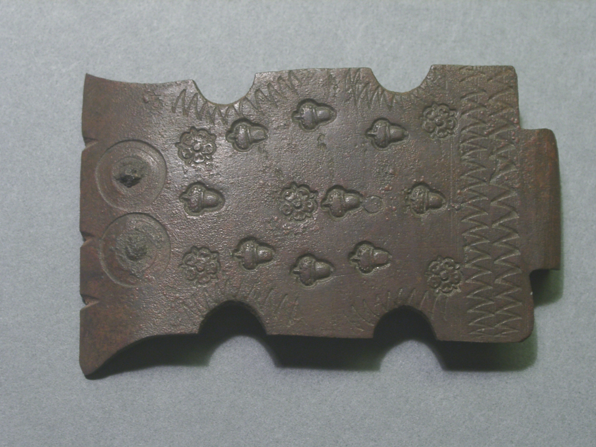- DescriptionBook clasp; copper alloy rectangular sheet, slightly curved; flanged at one end (to help hold book closed); design of 9 crowned acorns(?) and 5 roses. Recovered from rubble from demolition of Bishop's Palace, east wing.
