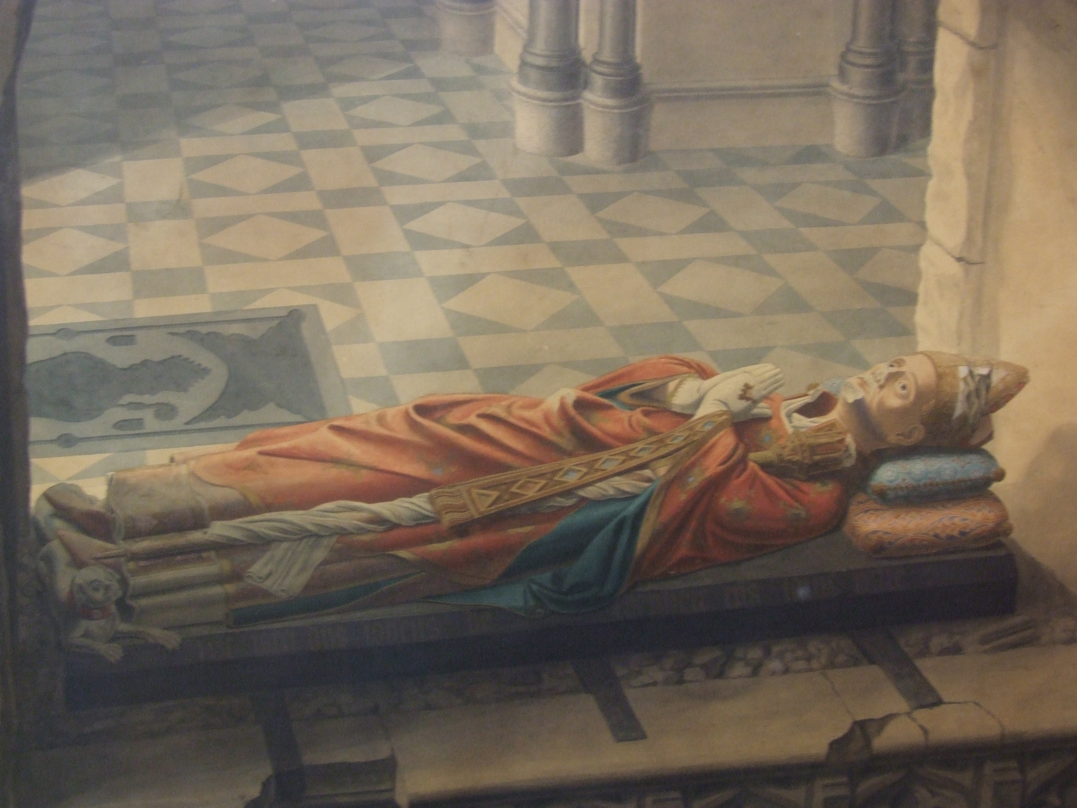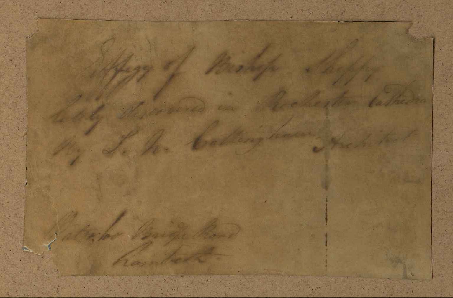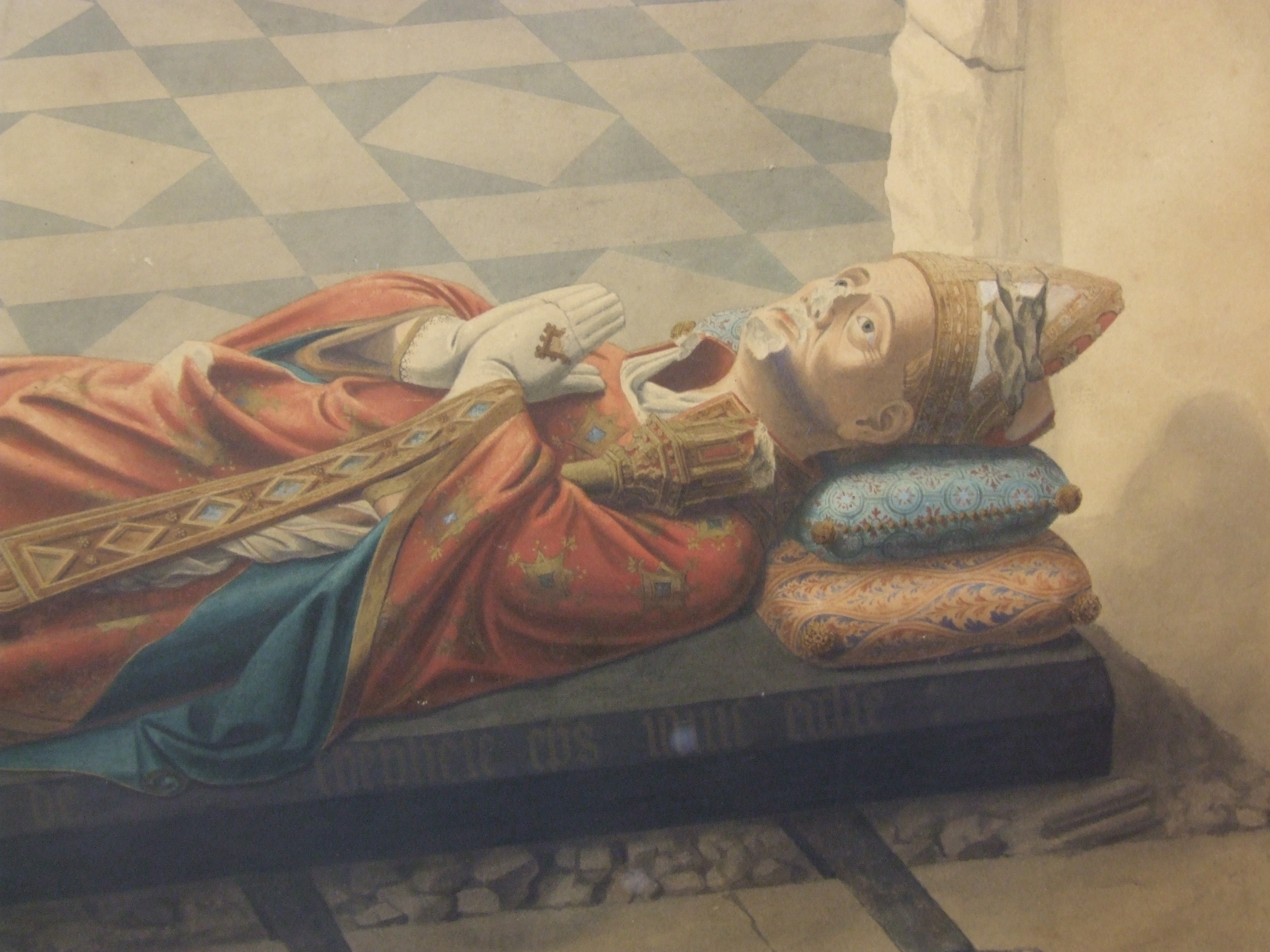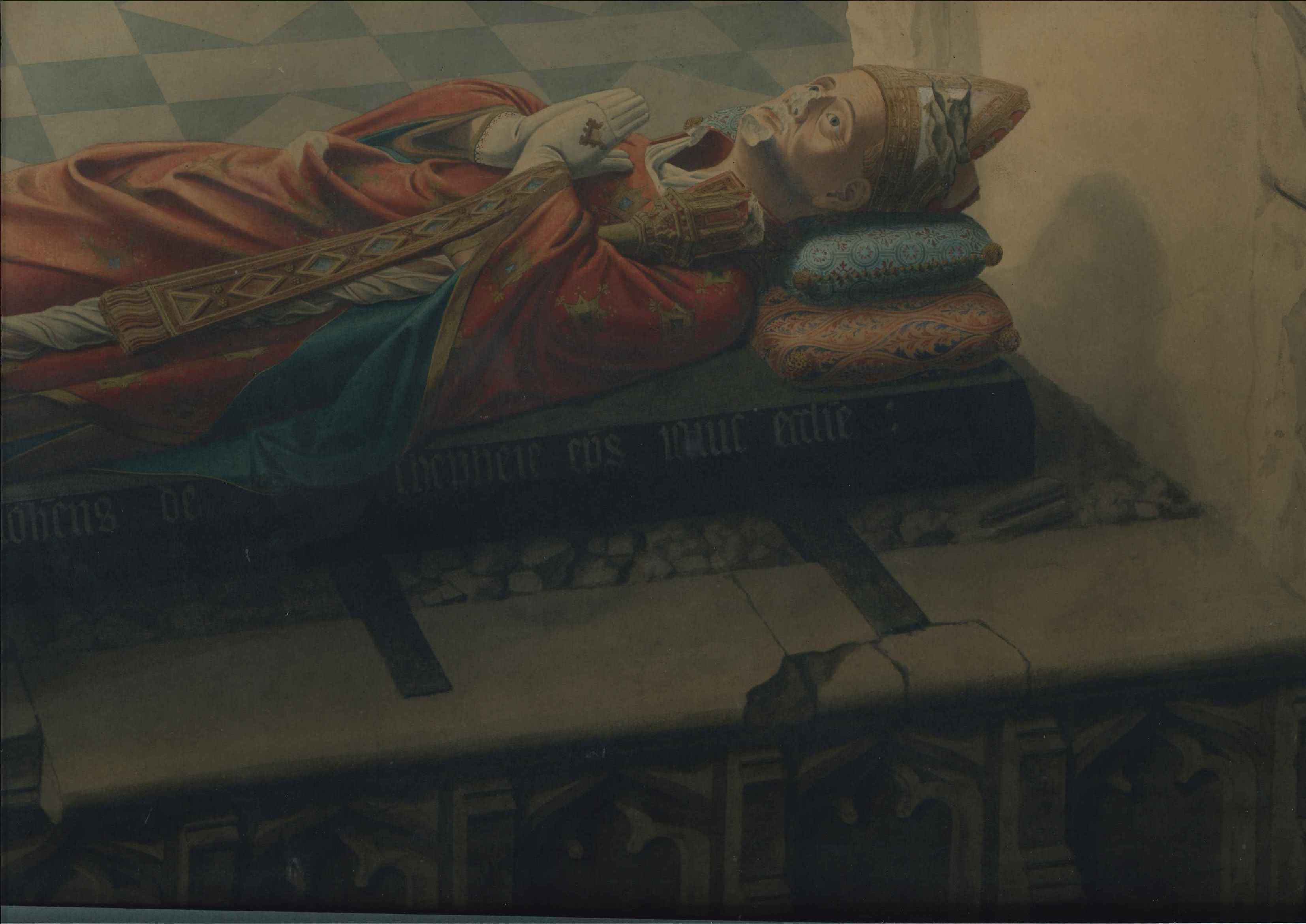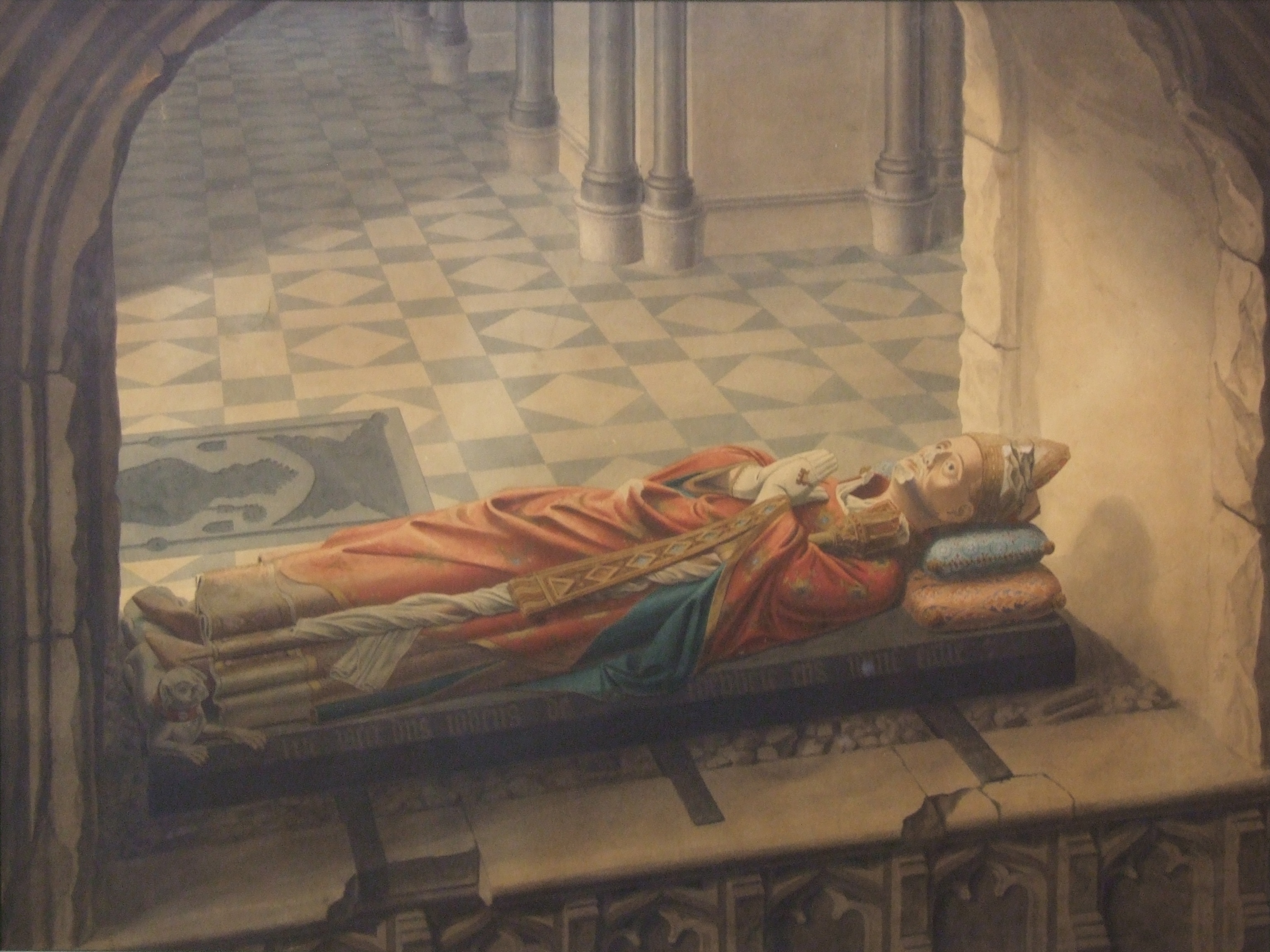 Watercolour painting; shows the tomb of bishop John De Sheppey (died 1360) shortly after it was rediscovered in Rochester Cathedral in 1825; shows recumbent figure in robes & mitre, hands praying, dog at feet. The tomb had been walled up in the 17th century; restoration work by the architect Lewis Cottingham in 1825 revealed the tomb and this painting was done shortly after by John Harris, an artist employed by the architect. Although the painting has been remounted & framed, on the reverse is the original handwritten title & an address (of Harris, the painter?); it has blurred slightly through old water damage.