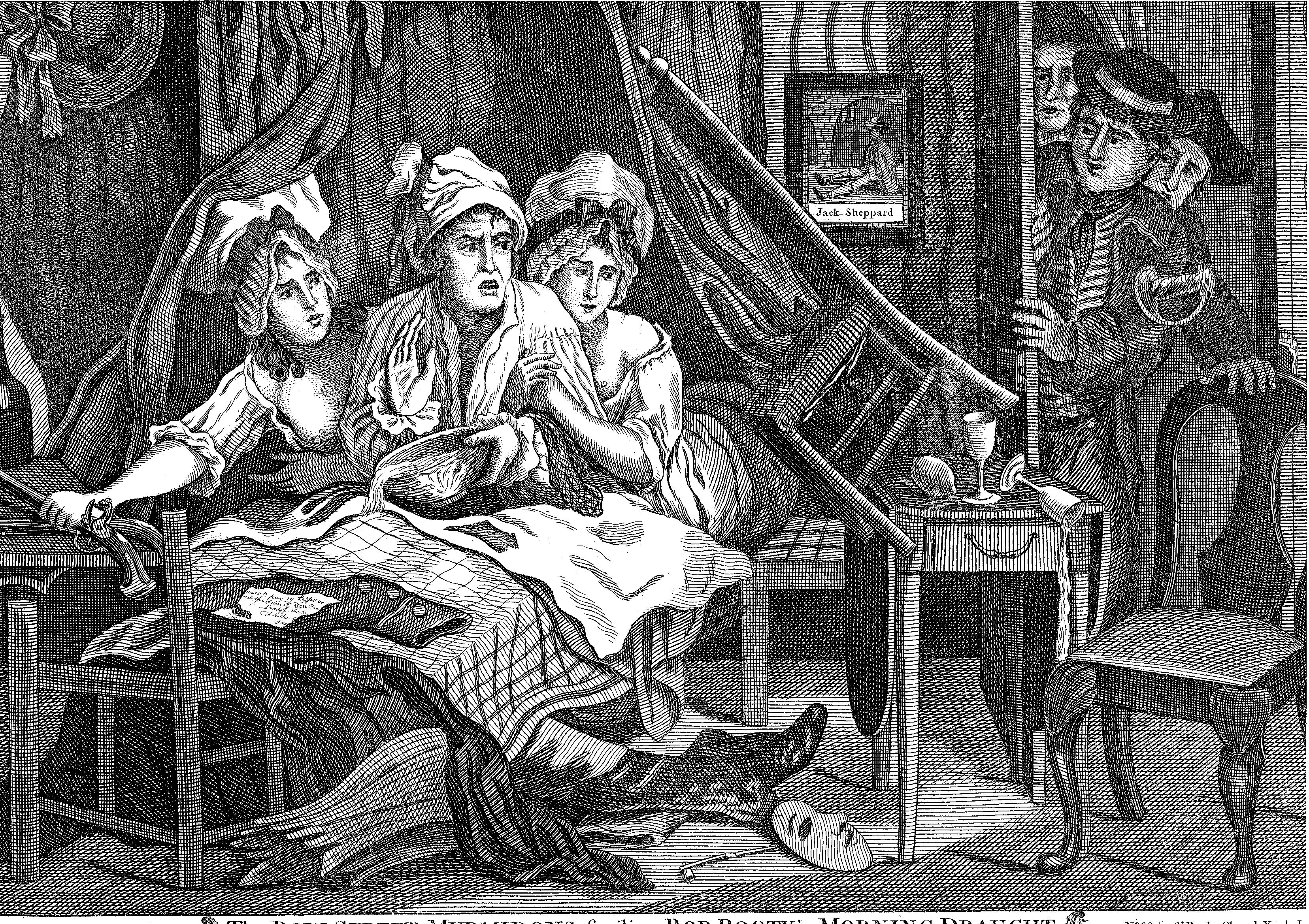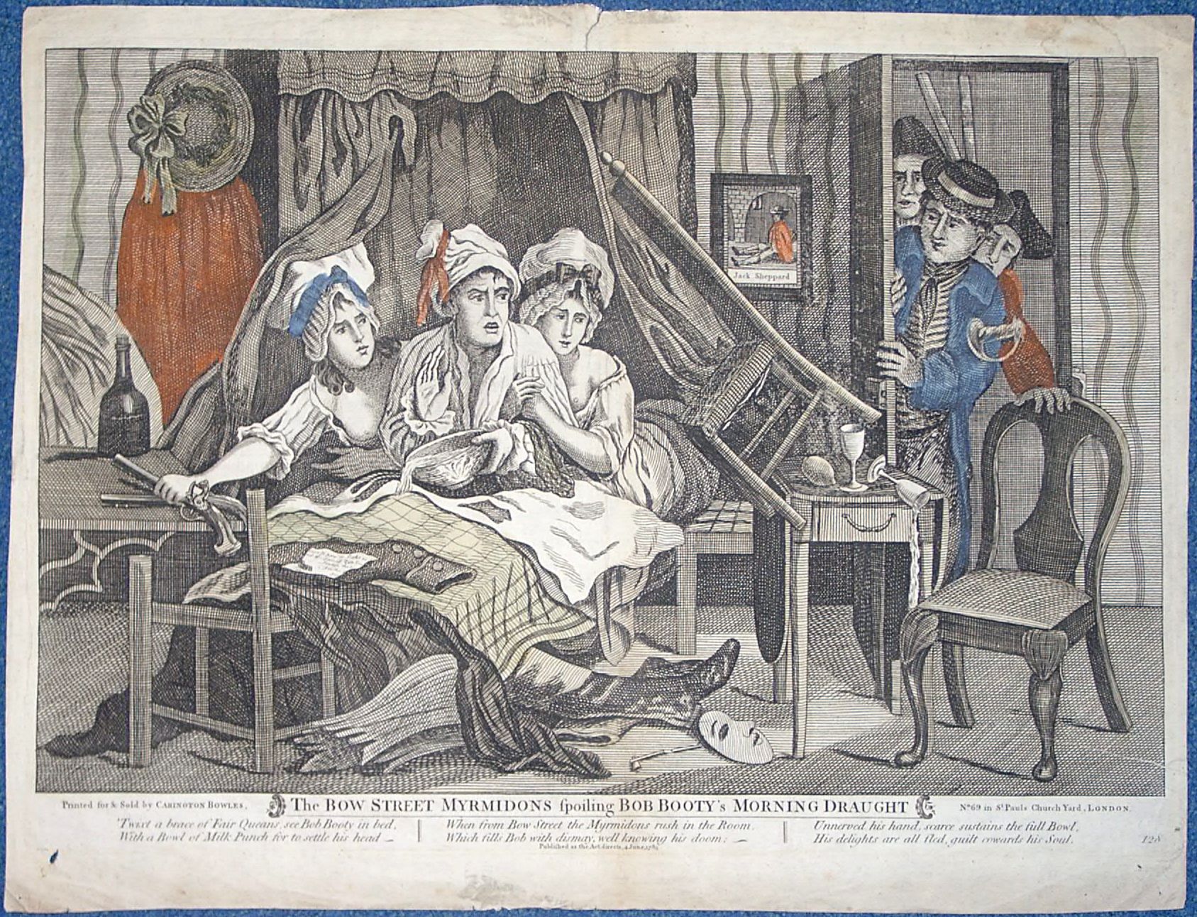 - Descriptionephemera; engraving 'The Bow St Myrmidons spoiling Bob Booty's Morning Draught'; shows Bob (presumably a thief) in bed with 2 women being arrested by the police; some red & blue colouring added; published 4 June, 1783.