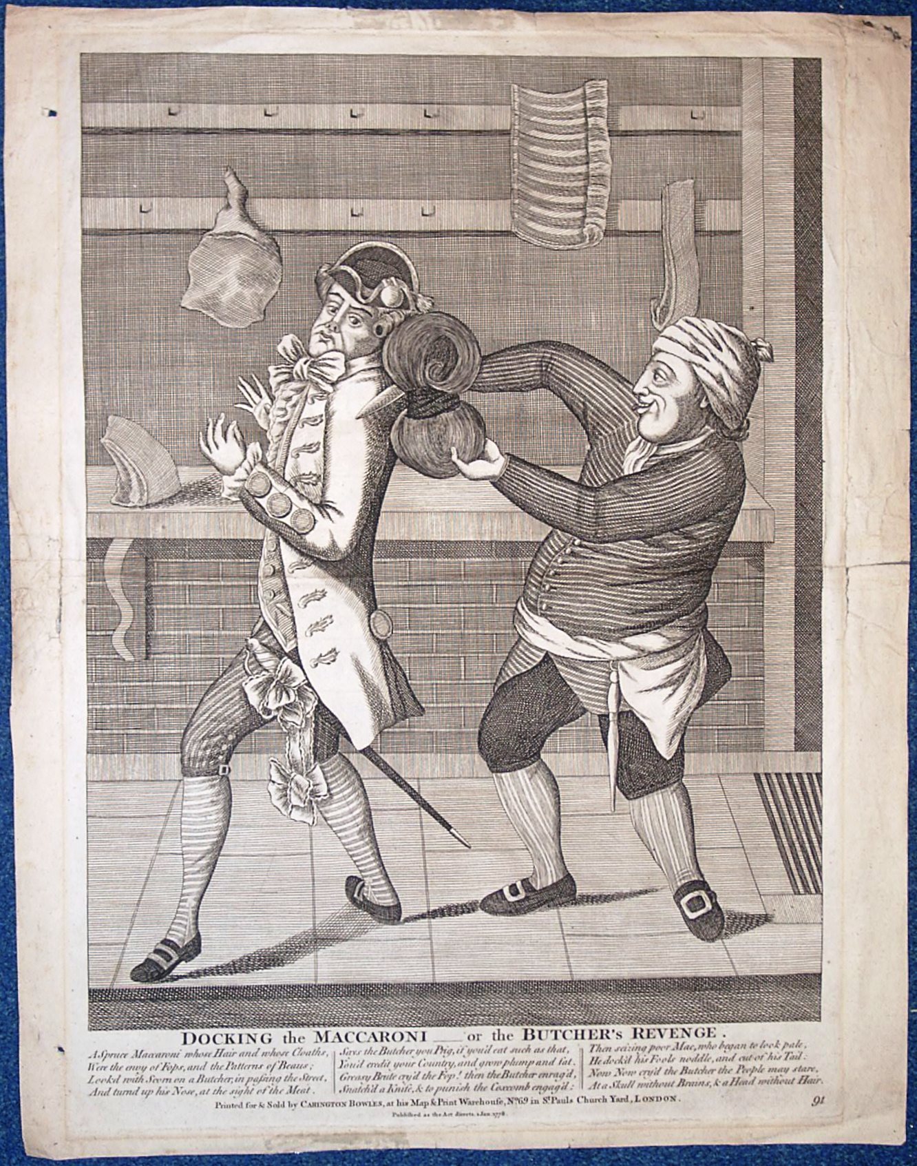- Descriptionephemera; engraving of the ballad sheet, 'Docking the Maccaroni - or the Butcher's Revenge'; shows comic scene of a butcher cutting a gentleman's hair. Published 1 Jan 1778.