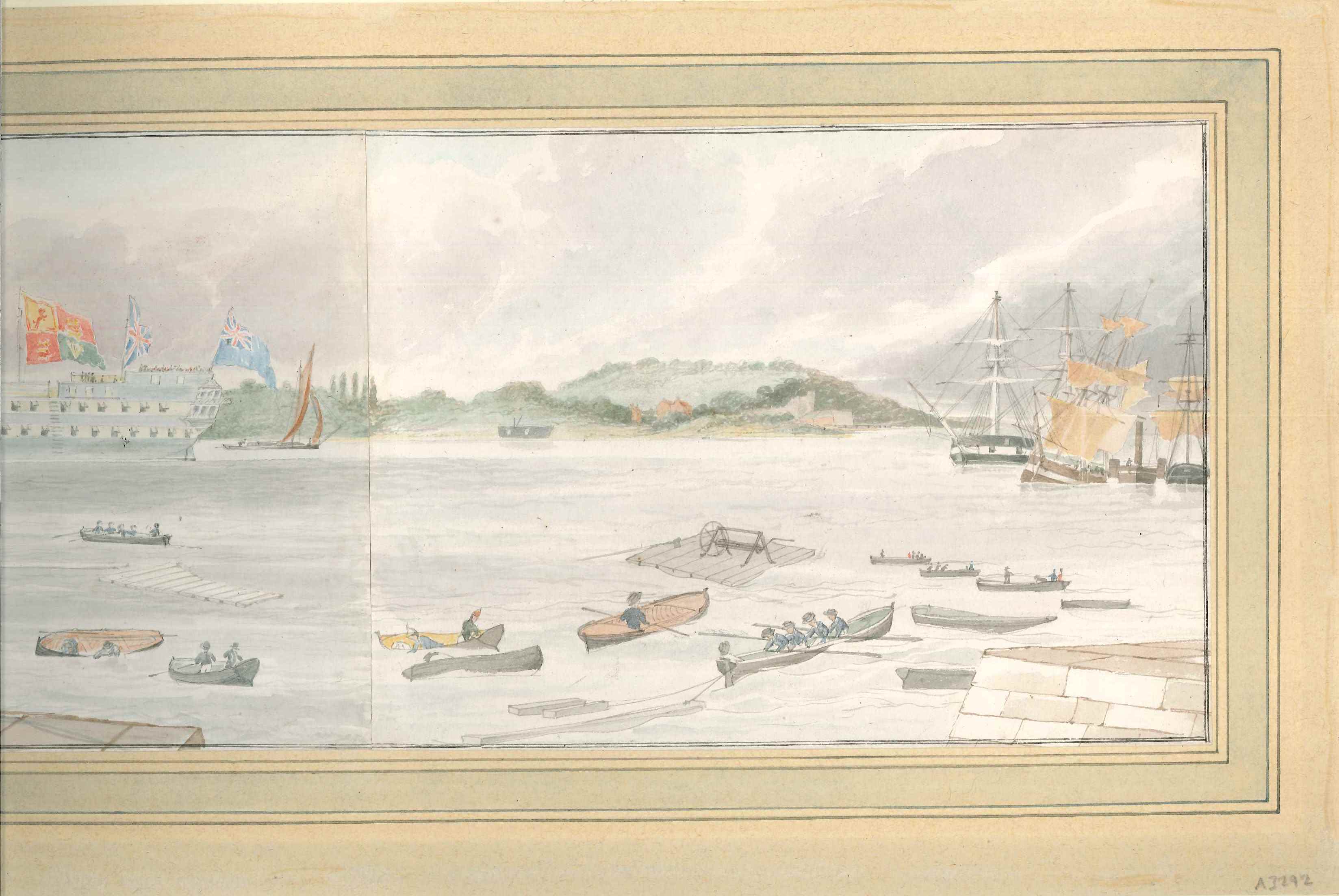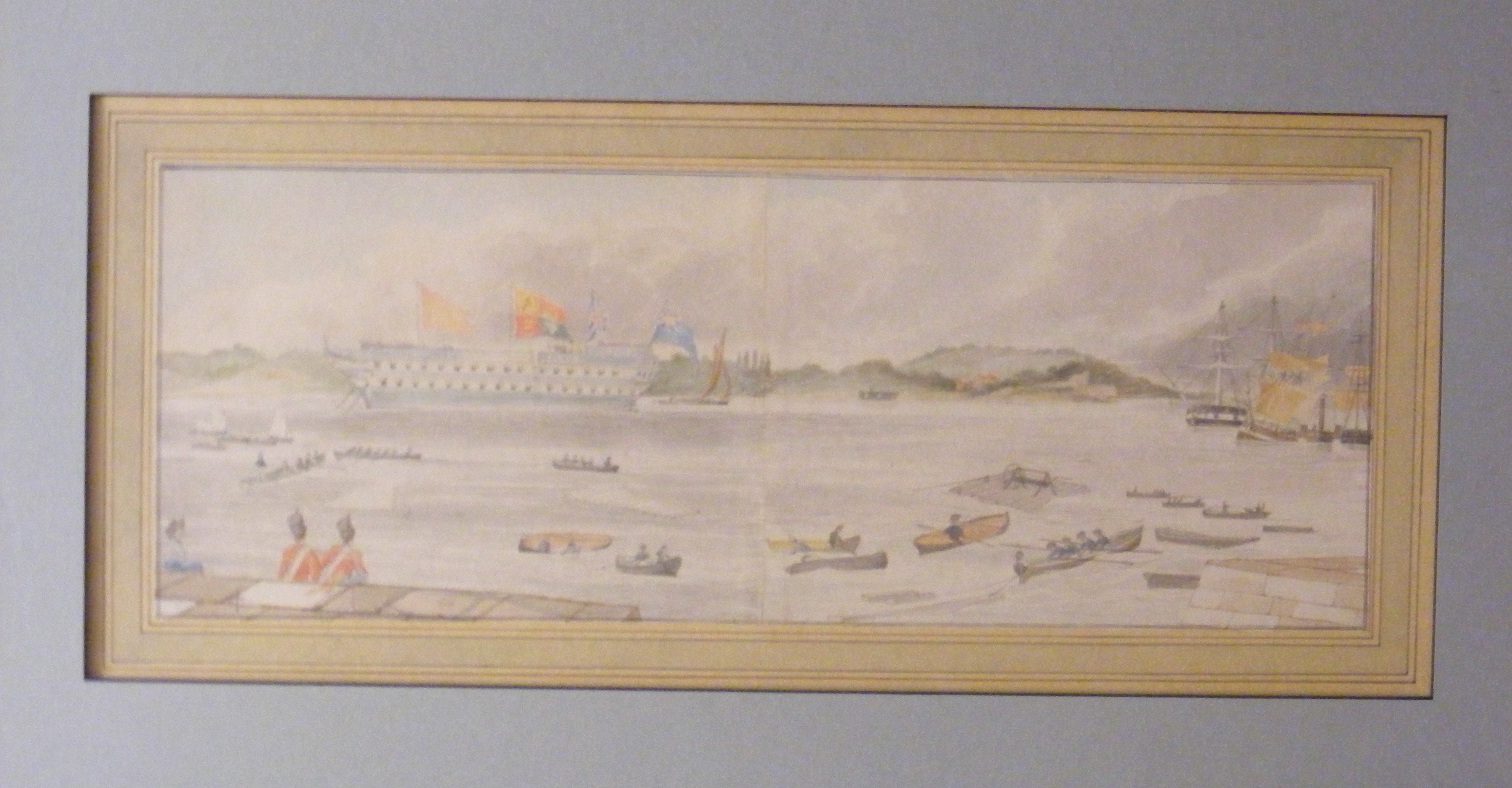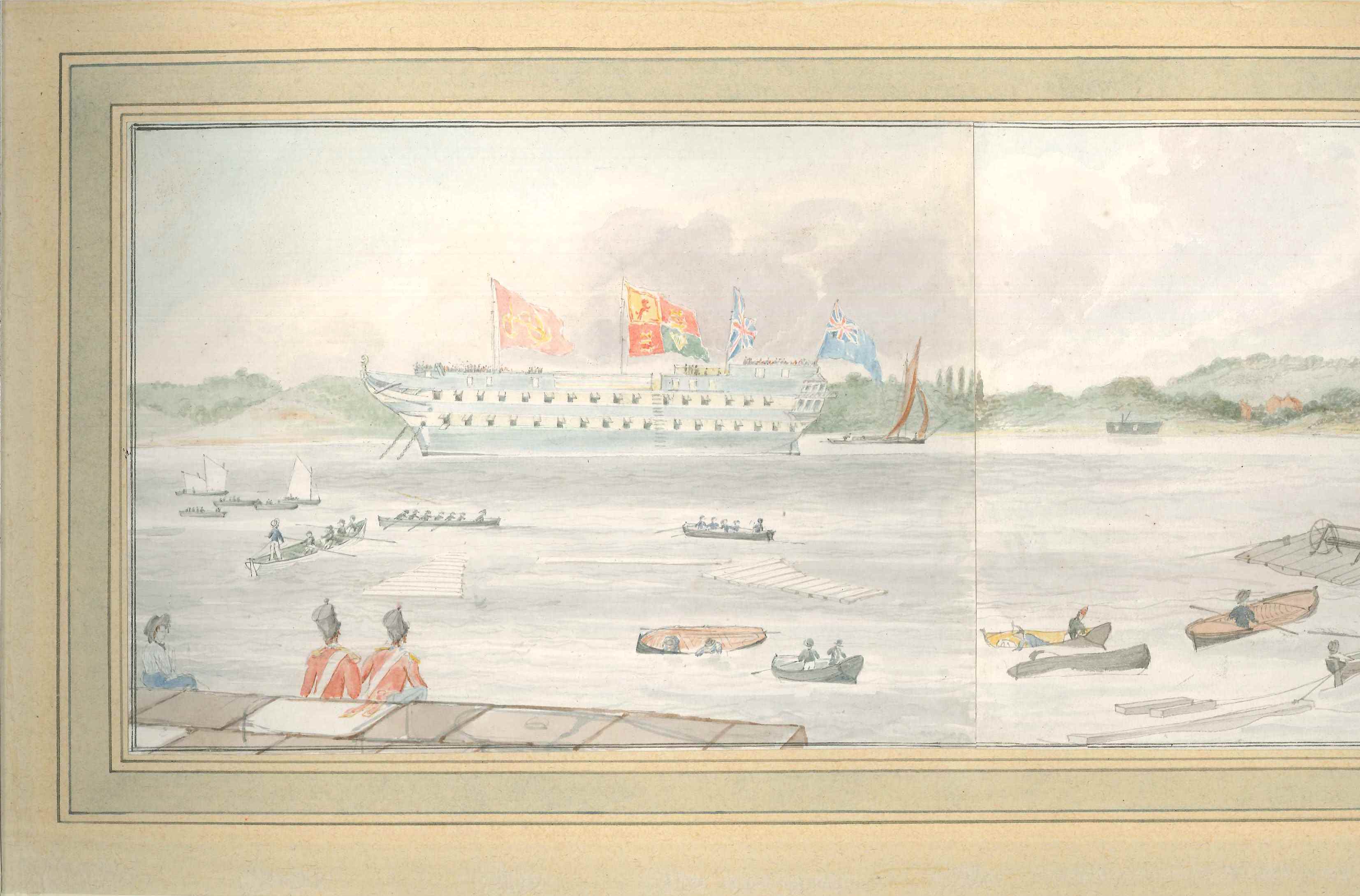 Watercolour painting; shows the launch of a man-of-war in 1848 (probably the 'Mars' of 84 guns) from Chatham dockyard; picture formed from 2 sheets of paper, sketched with added watercolour; slightly naive style apparent in the figures portrayed. Artist unknown, not signed; scene shows various steam and sail vessels, rowboats, 2 soldiers & 1 female spectator in the foreground.