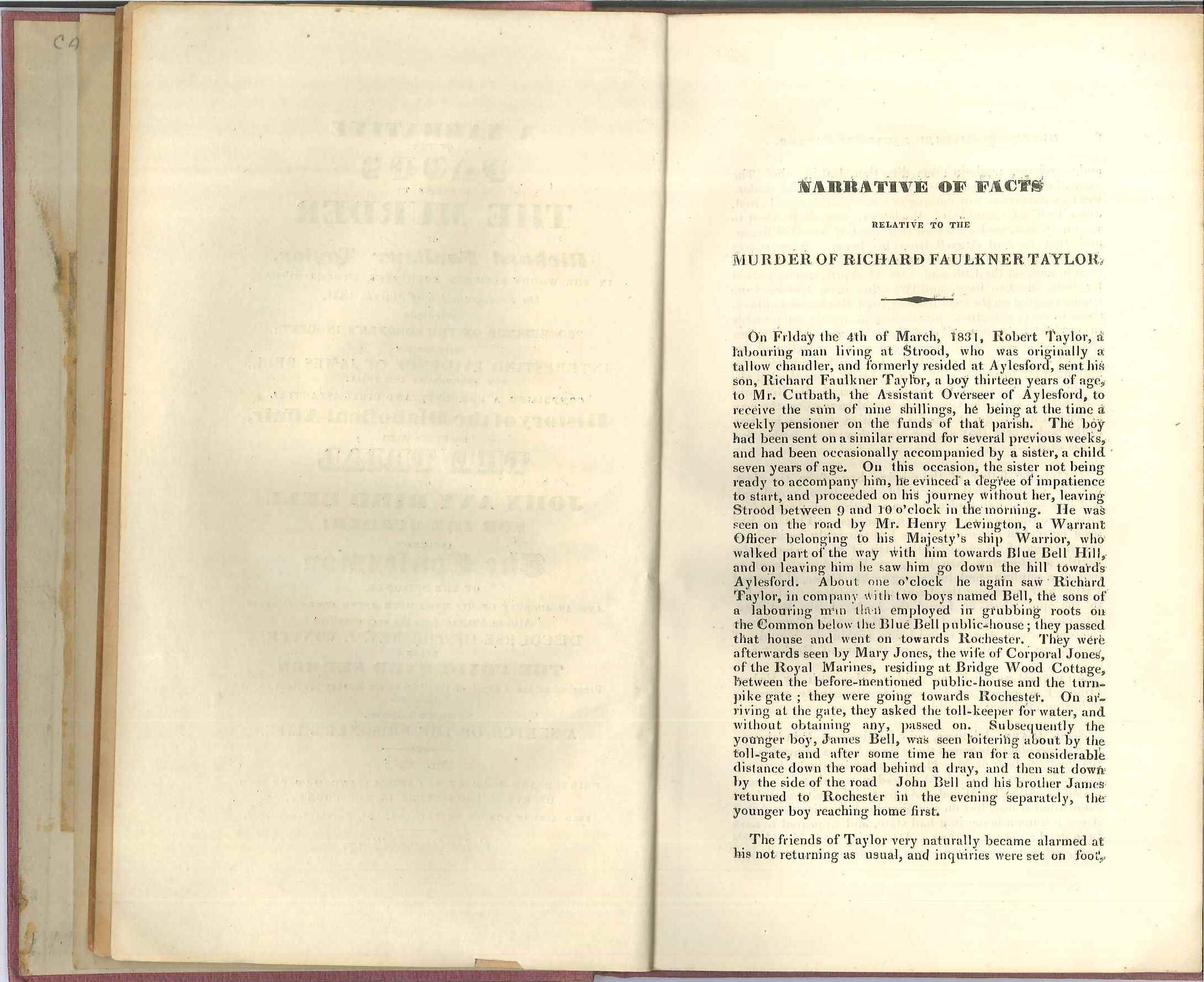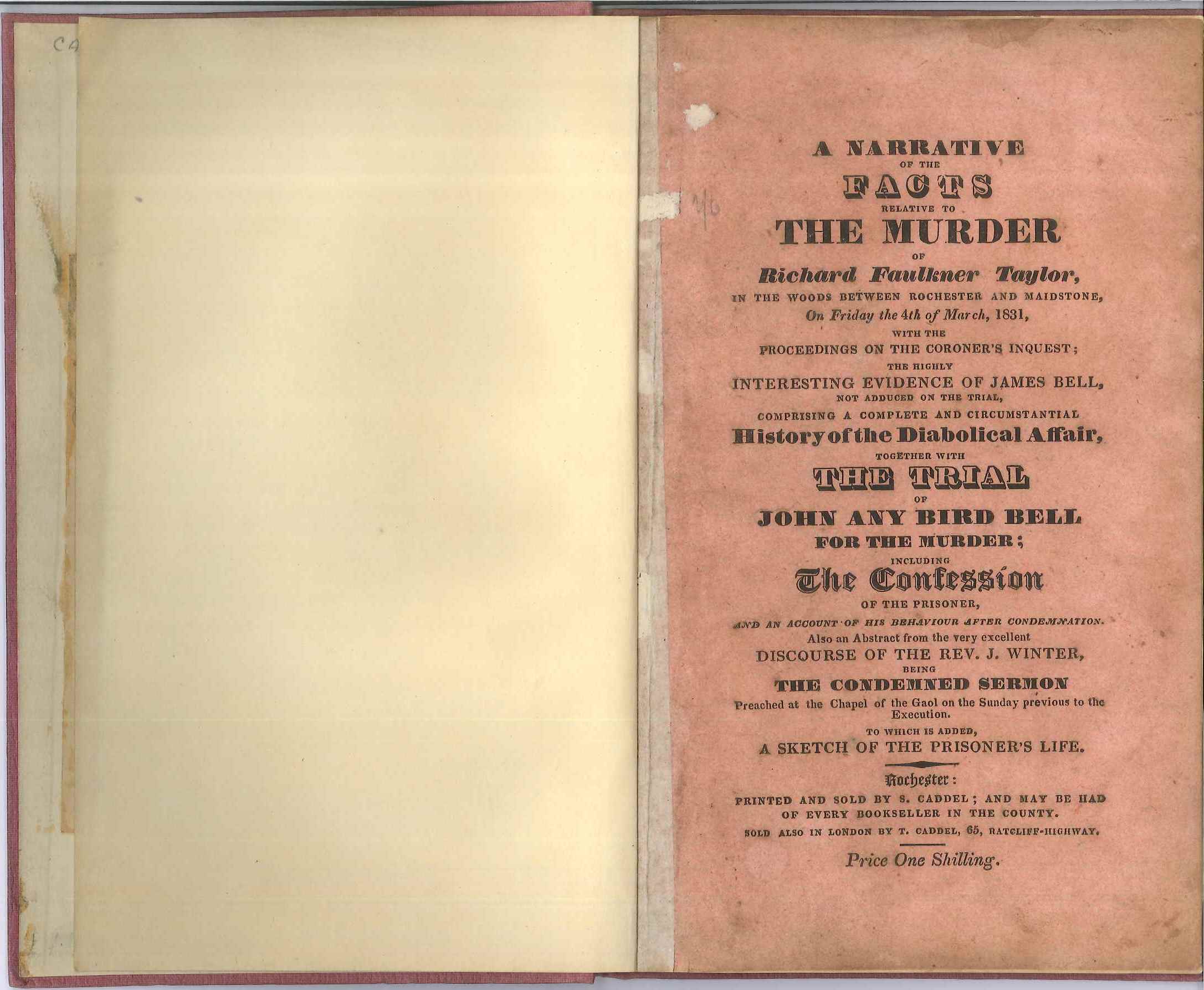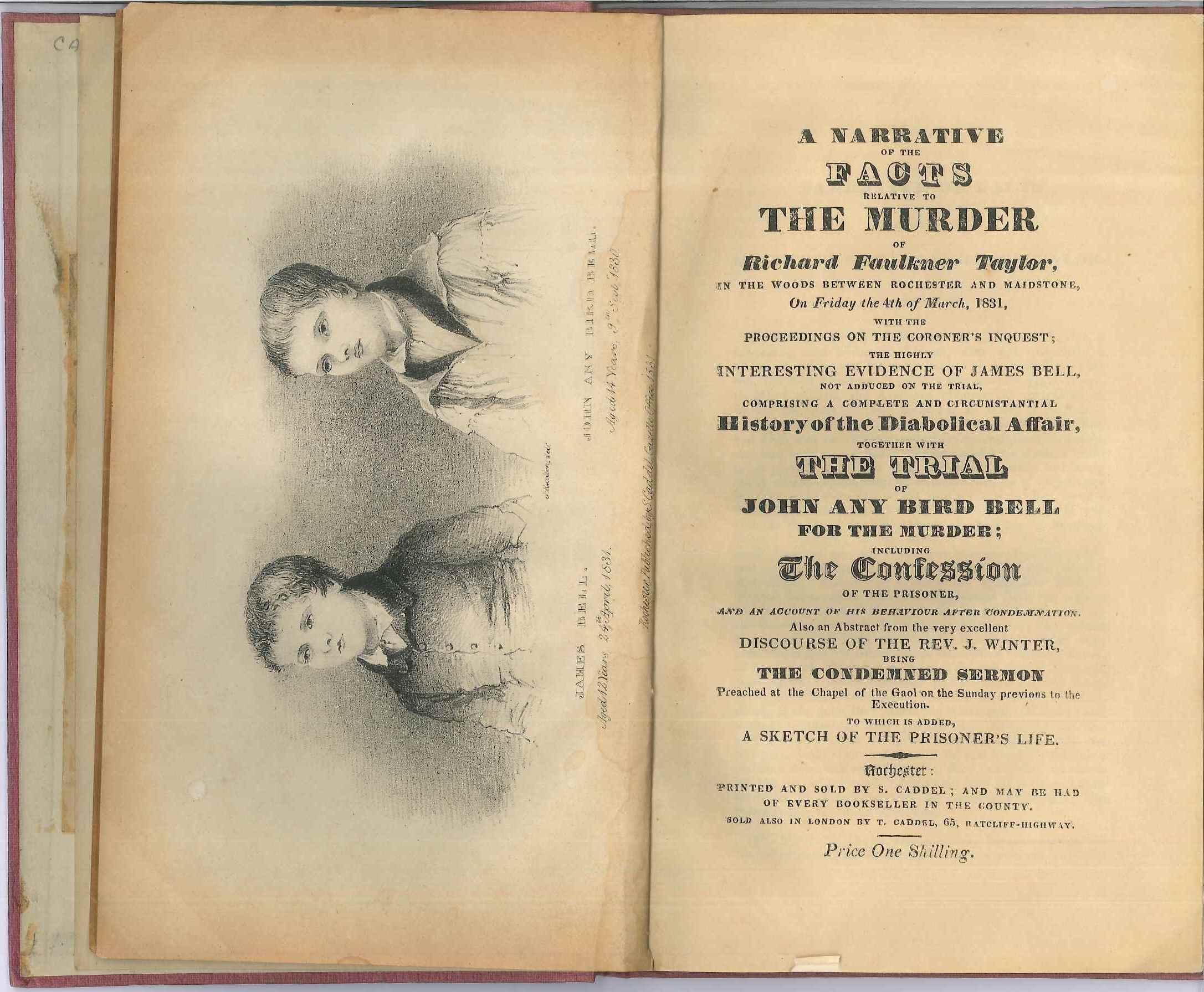 Ephemera; book, 'The Murder at the Bridge Woods, Rochester, 1831'; actually a bound booklet recounting the murder of Richard Faulkner Taylor and trial of John Any Bird Bell. Two brothers, John and James Bell were apprehended for the crime. John Bell was later found guilty and executed, but his brother was acquitted. In later life it is said that he re-enacted the murder in Strood Fair as a sideshow.