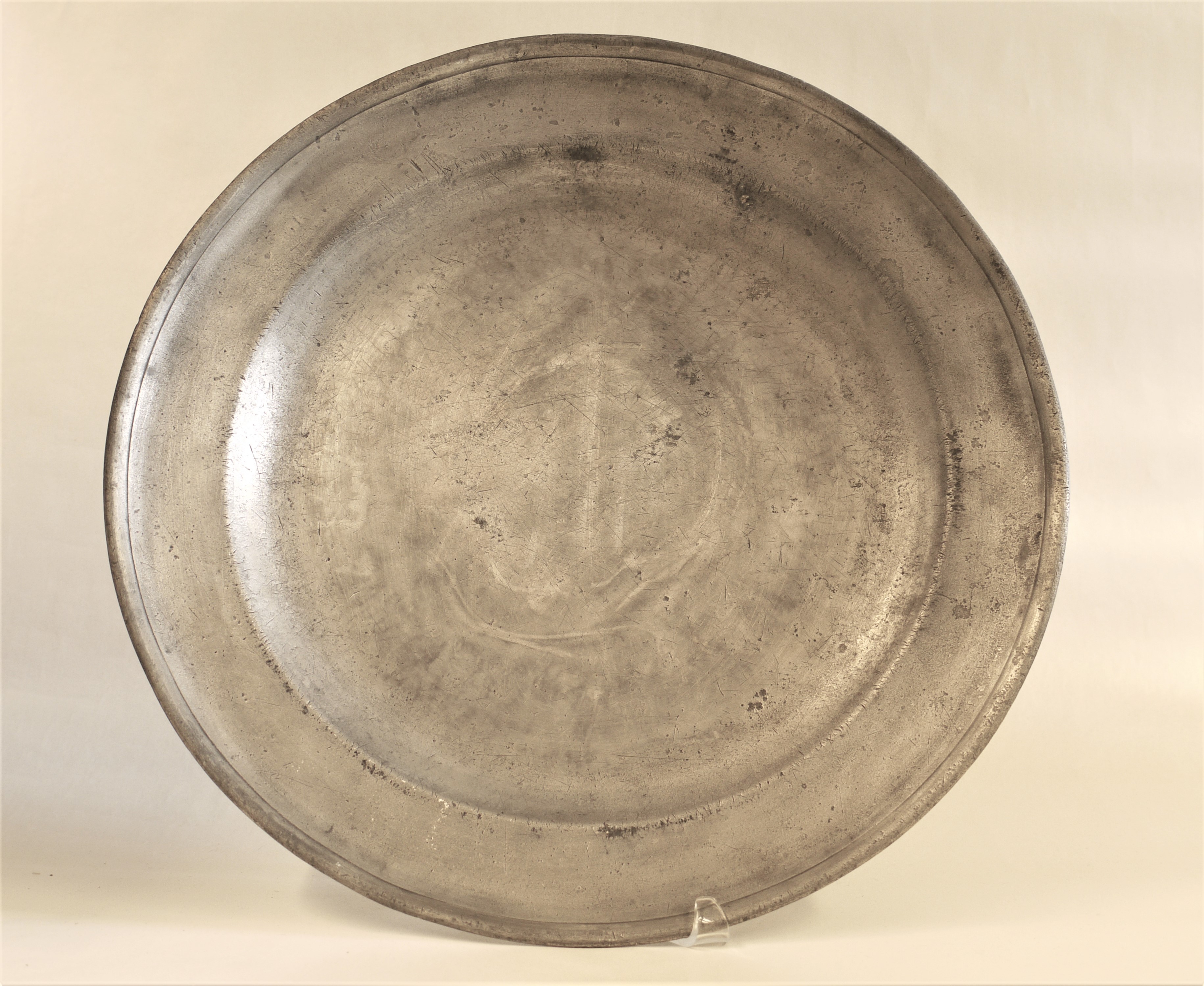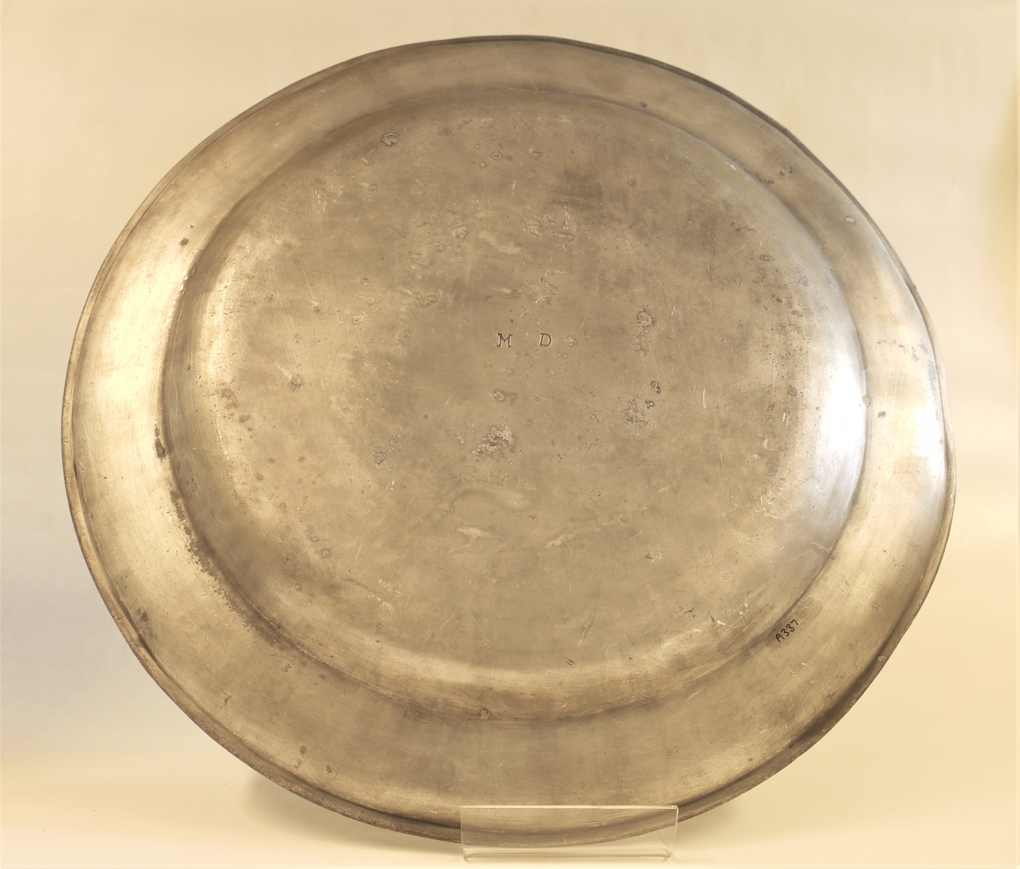 Large pewter plate or shallow dish. Edge slightly thickened and beaded. Base stamped 'MD' and 3 touchmarks.