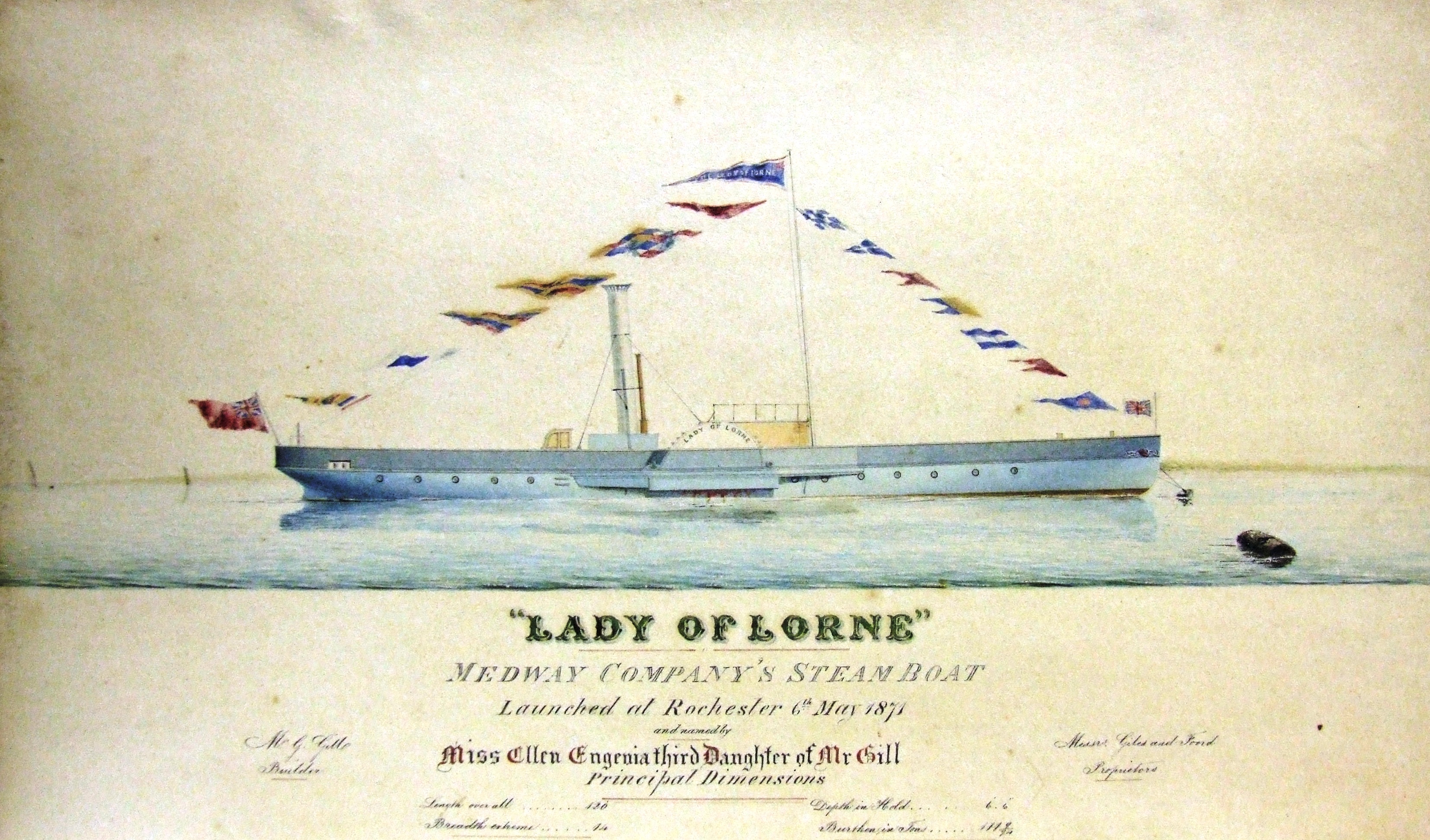- Descriptionwatercolour painting; paddlesteamer 'Lady of Lorne', launched 6th May 1871 at Rochester; glazed & framed; shows ship with signal flags & ensigns, single funnel; open bridge.