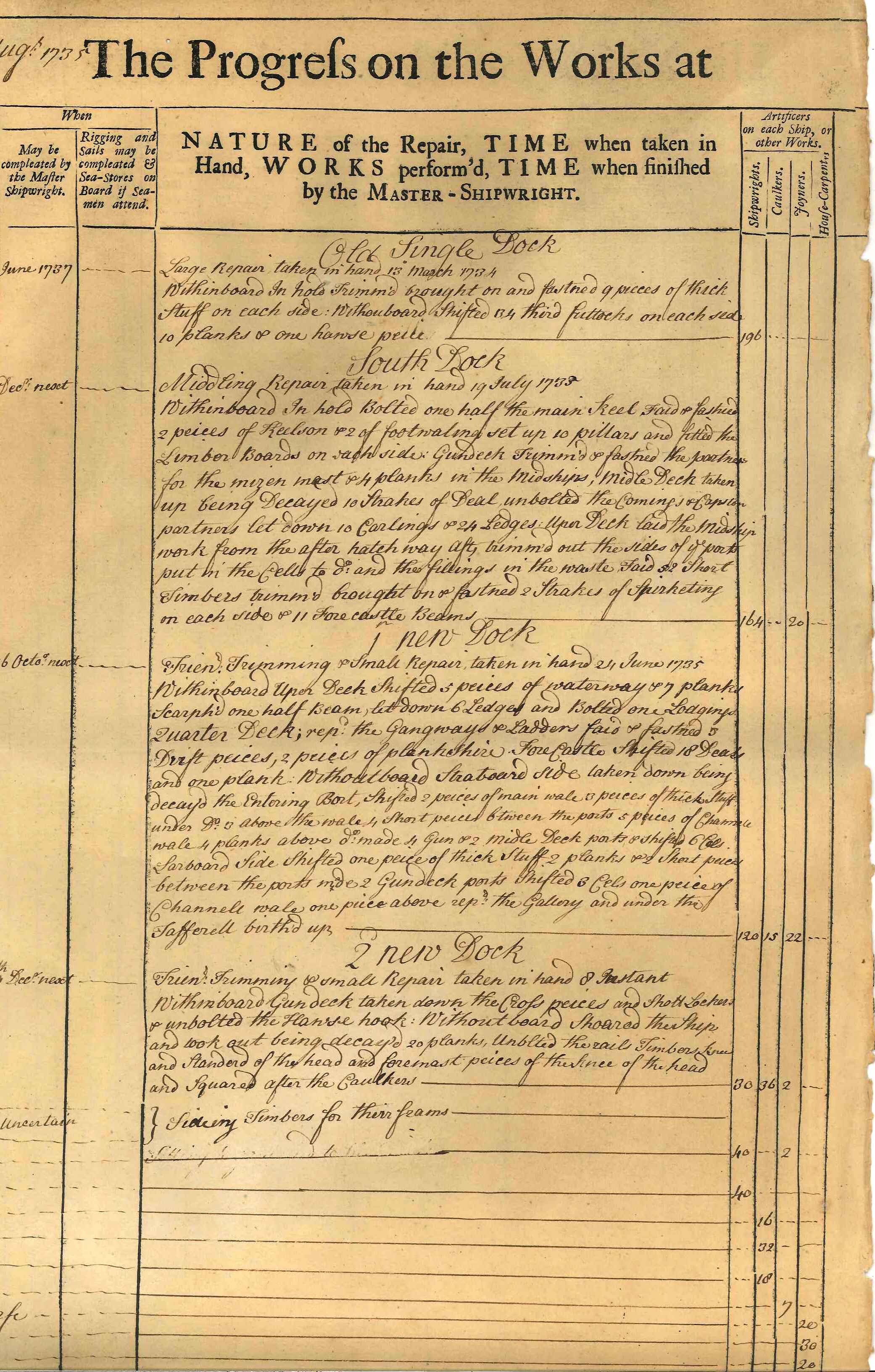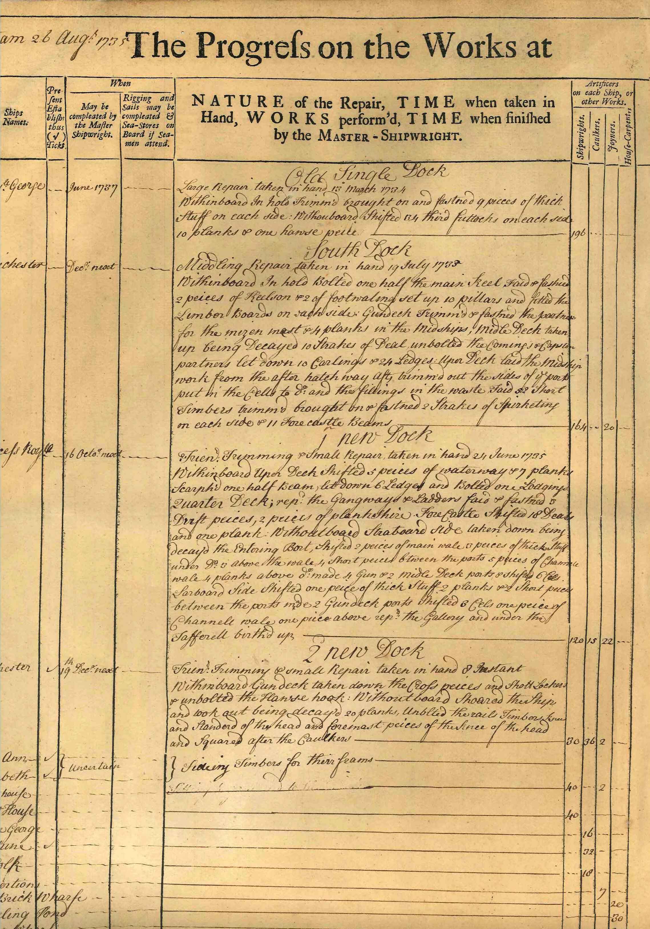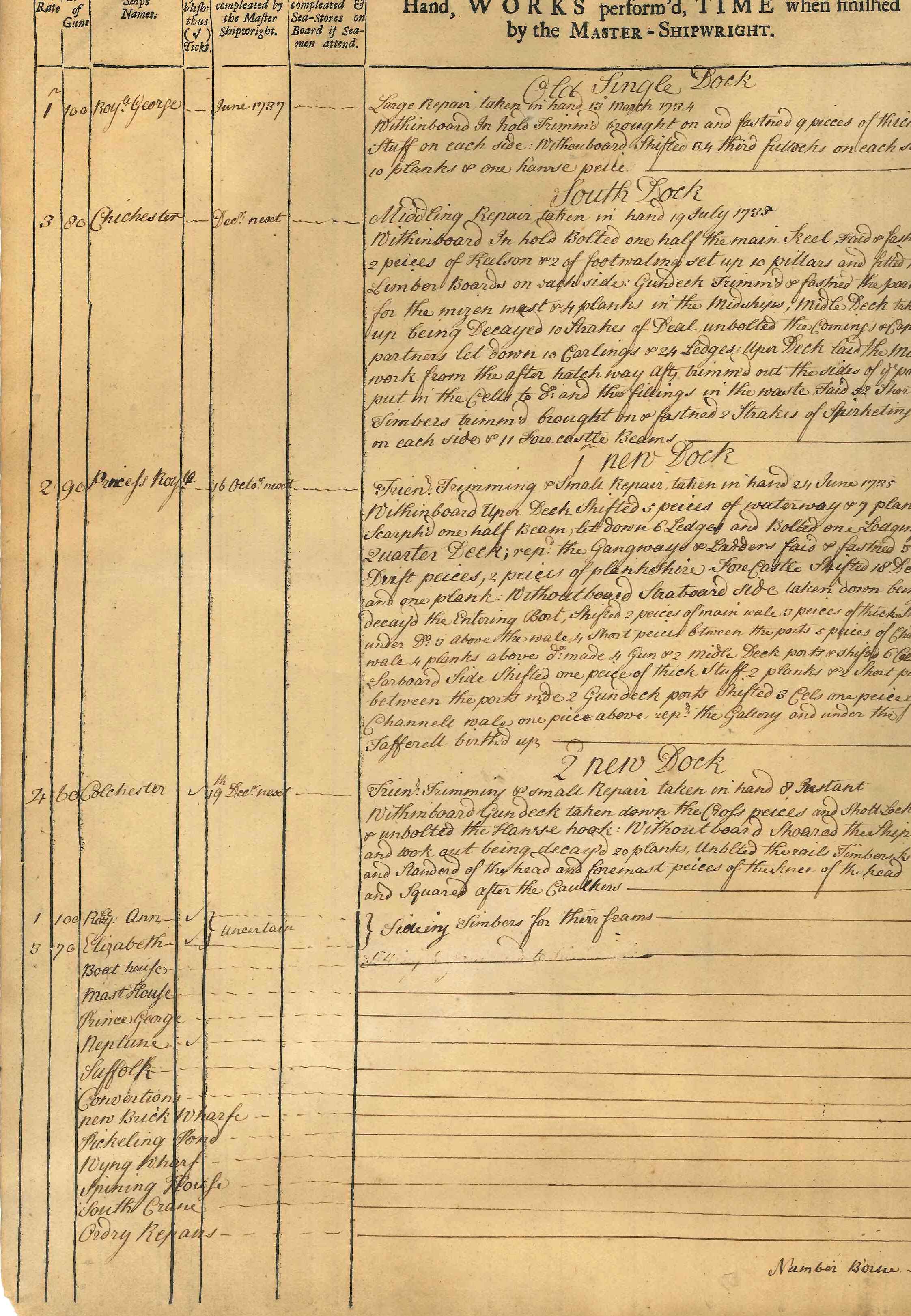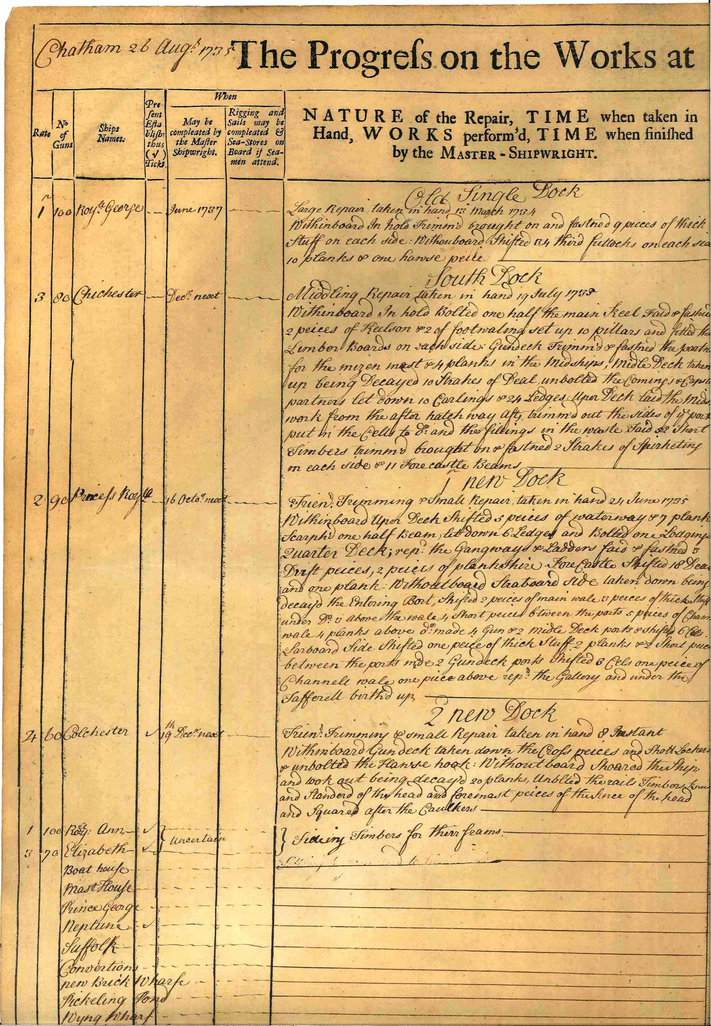 ephemera; page taken from a weekly log recording work done at Chatham Dockyard in August 1735; printed both sides; lists ships Royal George, Chichester, Prince Royal, Colchester; lists no. of shipwrights, caulkers, joiners, carpenters & cost. One of 4 sheets - some clerical errors - 2 sheets record the 'Colchester' as having 60 guns, the other 2 state 50 guns! Printed sheets with details entered by hand.