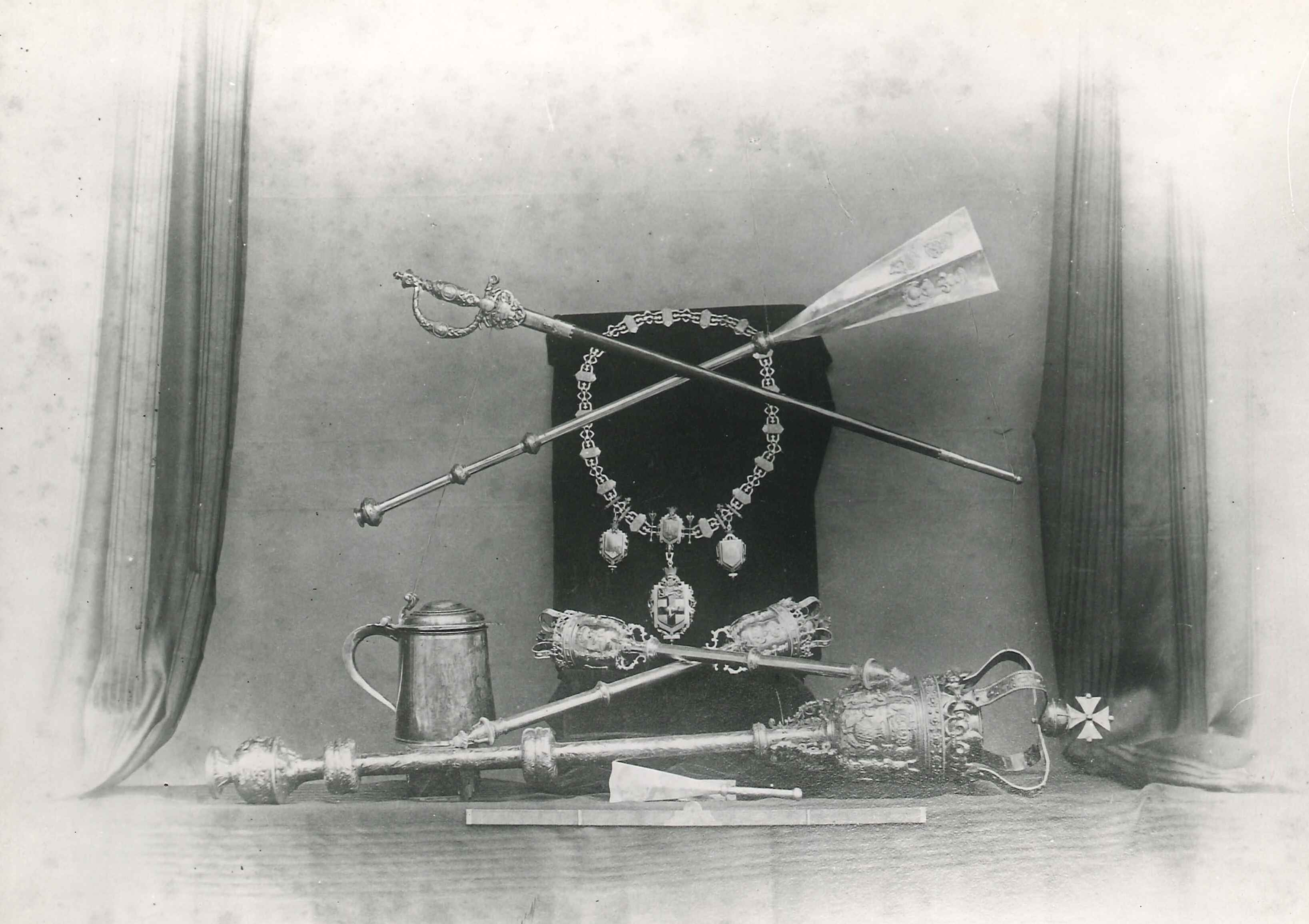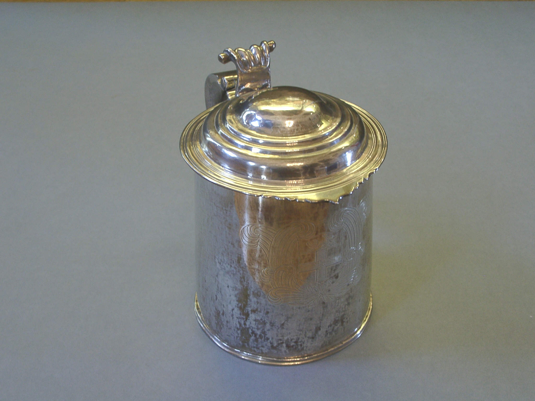 Civic collection; silver covered tankard; large cylindrical body, widening towards base; hollow handle with lower heart-shaped terminal; hinged domed lid with scroll thumb lift; engraved with Rochester City arms; hallmarked London sterling silver, 1719. Apparently found in the 'lumber room' in the Guildhall some time in the early 20th century. Lid has been repaired & seems to be not hallmarked.
