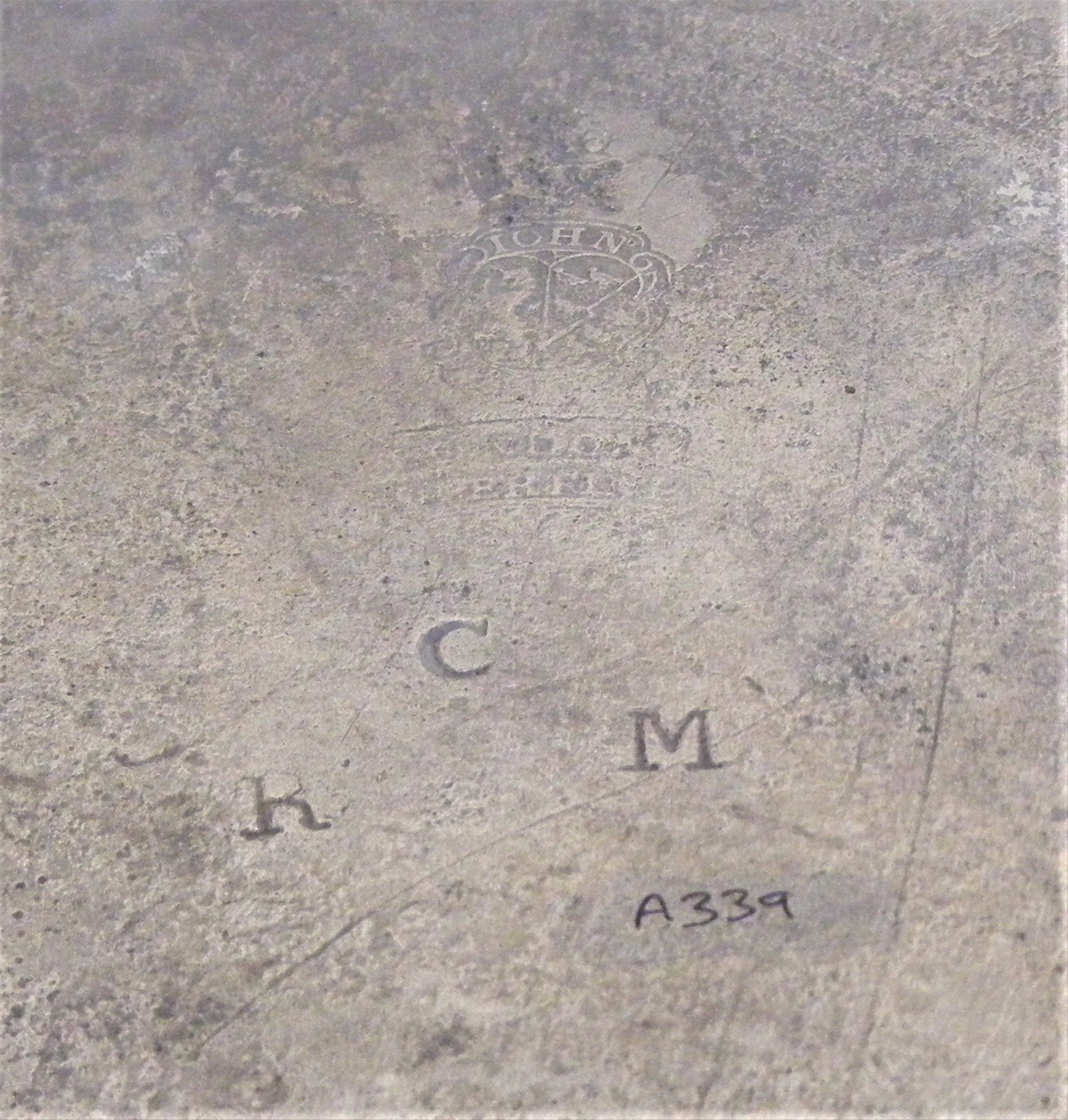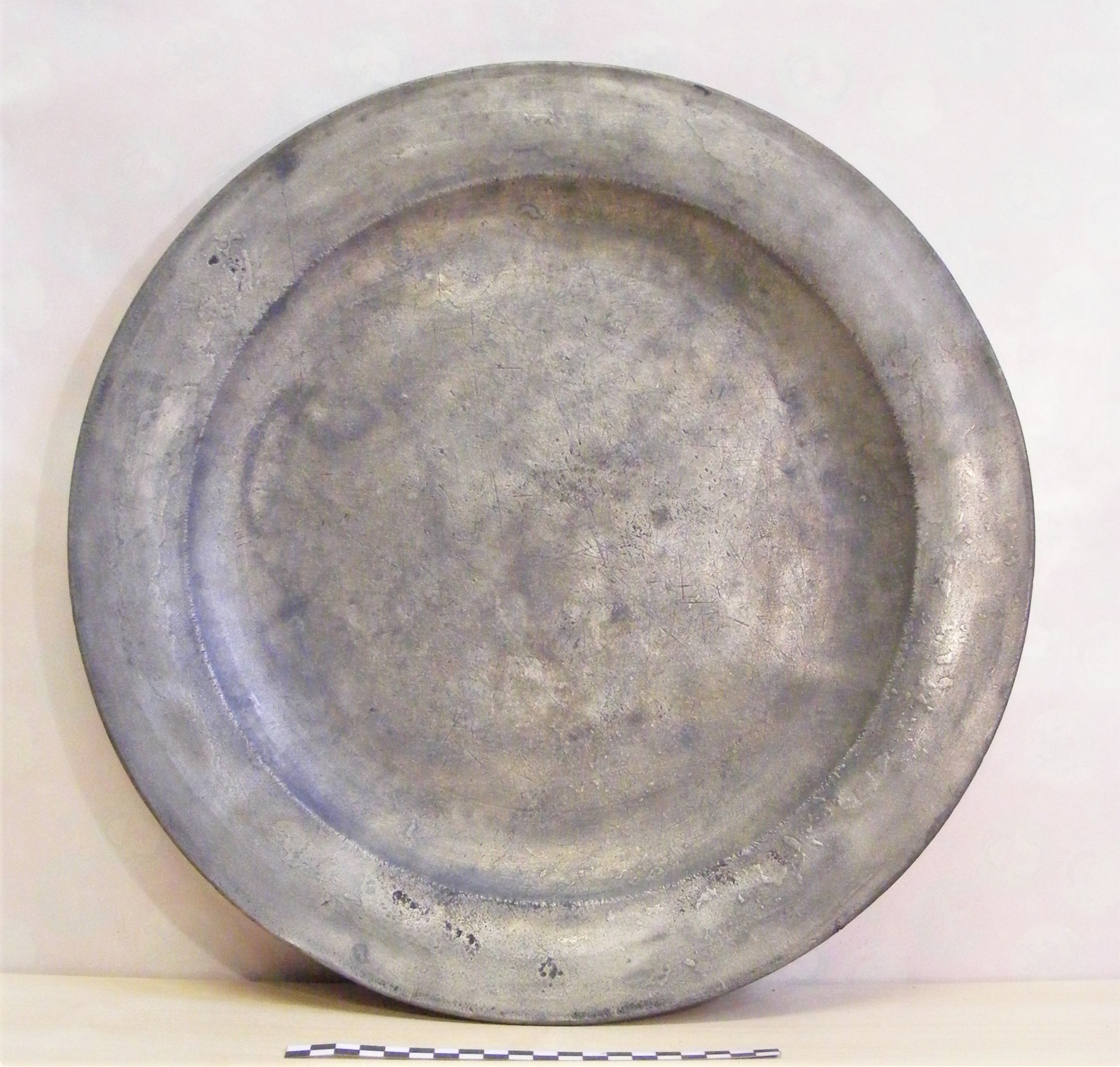 - DescriptionLarge pewter plate or shallow dish. Base is stamped with 'RMC' and maker's mark, a crowned 'X' over a coat of arms and 'JOHN ?LONDON?....'.